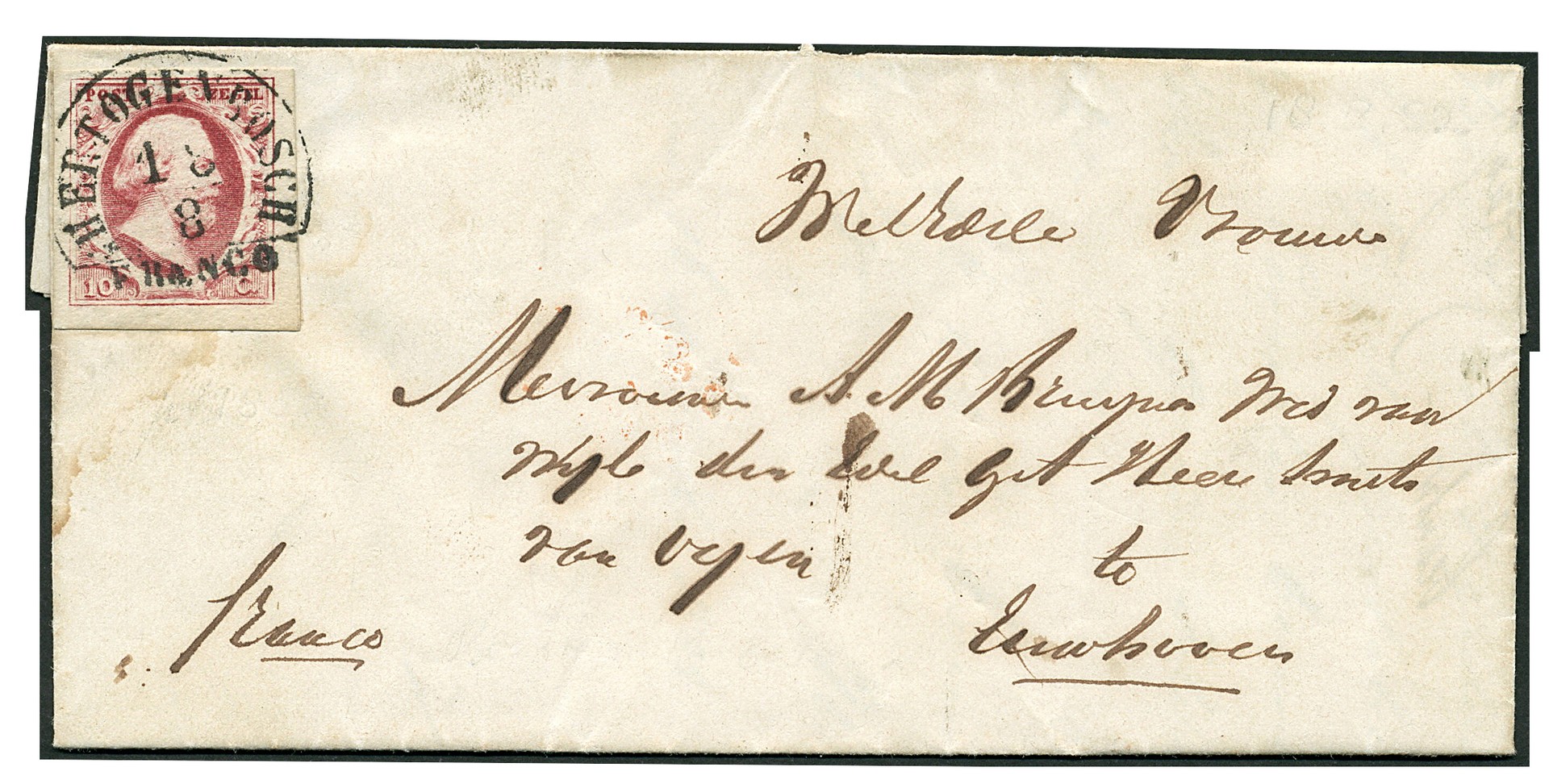 'sHERTOGENBOSCH A op 10 cent nr. 2b-Pl.I-25 (aan drie zijden zeer breed gerand prachtex.) op complete brief van Oss (az. naamstempel) via 'sHertogenbosch 18-8(-1852) naar Eindhoven 18-8