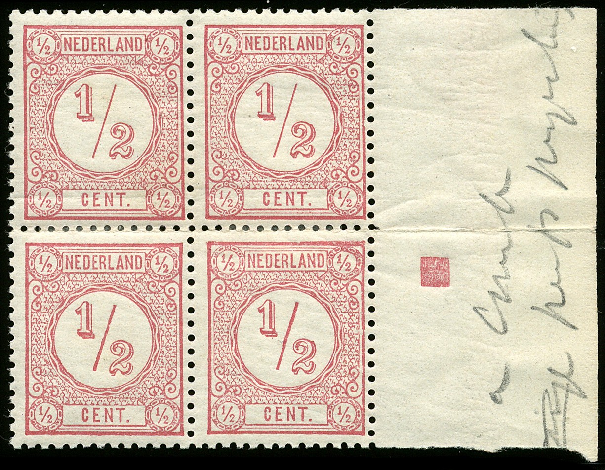 30EII + I, ½ cent roze type II, twee verticale paren tezamen in ongebruikt pracht randblok met volle originele gom, horizontale tanding met plakkers verstevigd. Uitermate zeldzaam! € 3000