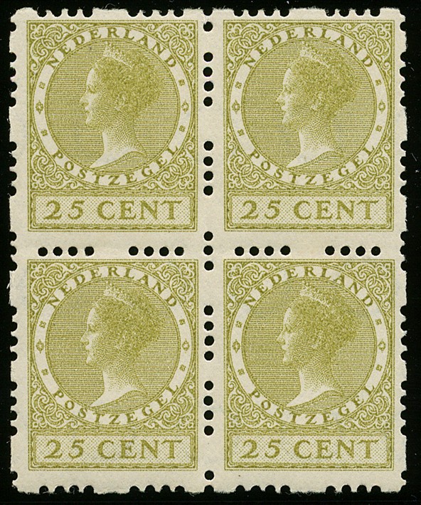R51b, 25 cent olijfgroen in blok van vier, waarin bovenste ex. R51a, postfris prachtex. € 700
