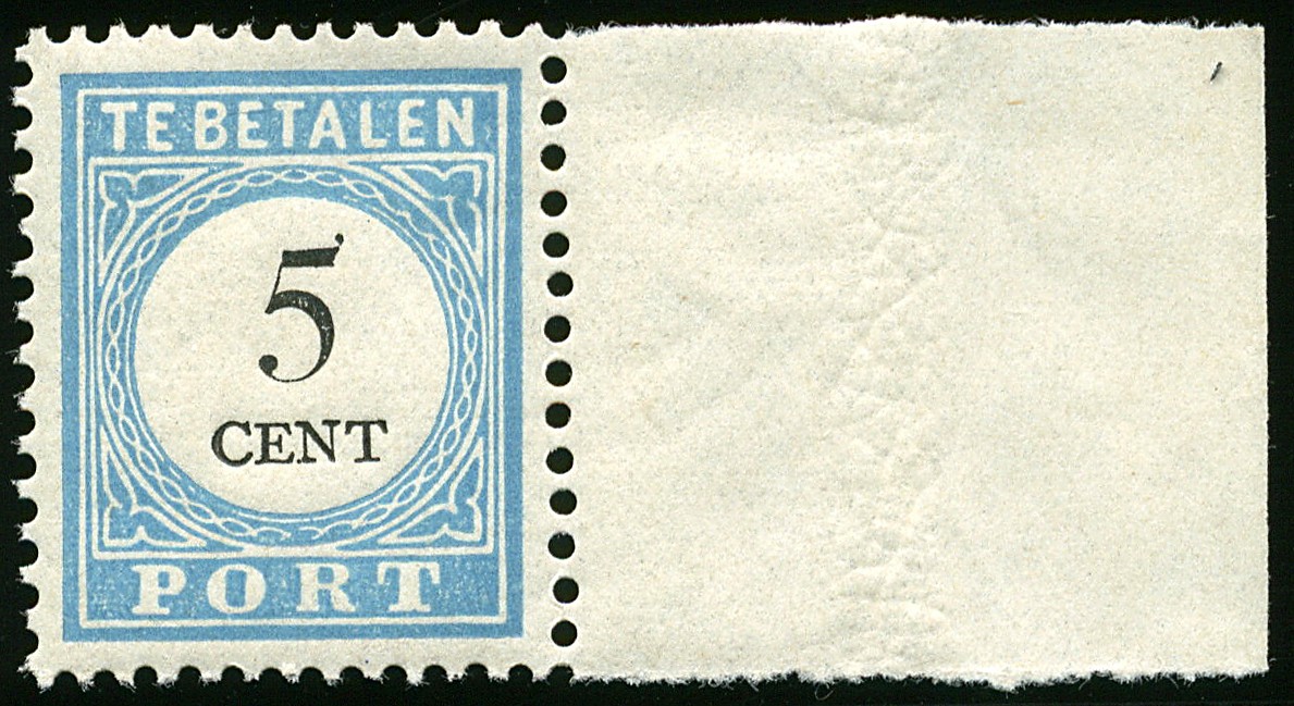 P6BIII, 5 cent lichtblauw, Kt.12½ x 12, postfris prachtex. met rechtervelrand, enkele minieme originele puntjes en cert. Vleeming (2017) € 1000