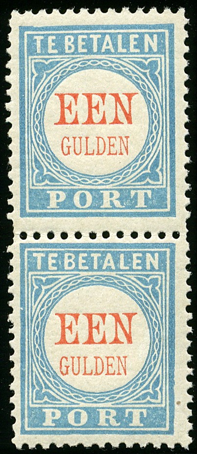 P12DI/DIII, Een Gulden lichtblauw en rood, type I lange slag en type III korte slag samenhangend in postfris verticaal paar. De hoeken van de tussentanding zijn origineel korter dan normaal, veroorzaakt door de perforatiefout. Zeldzaam prachtstuk! Cert. muis (2009) € 1725 +