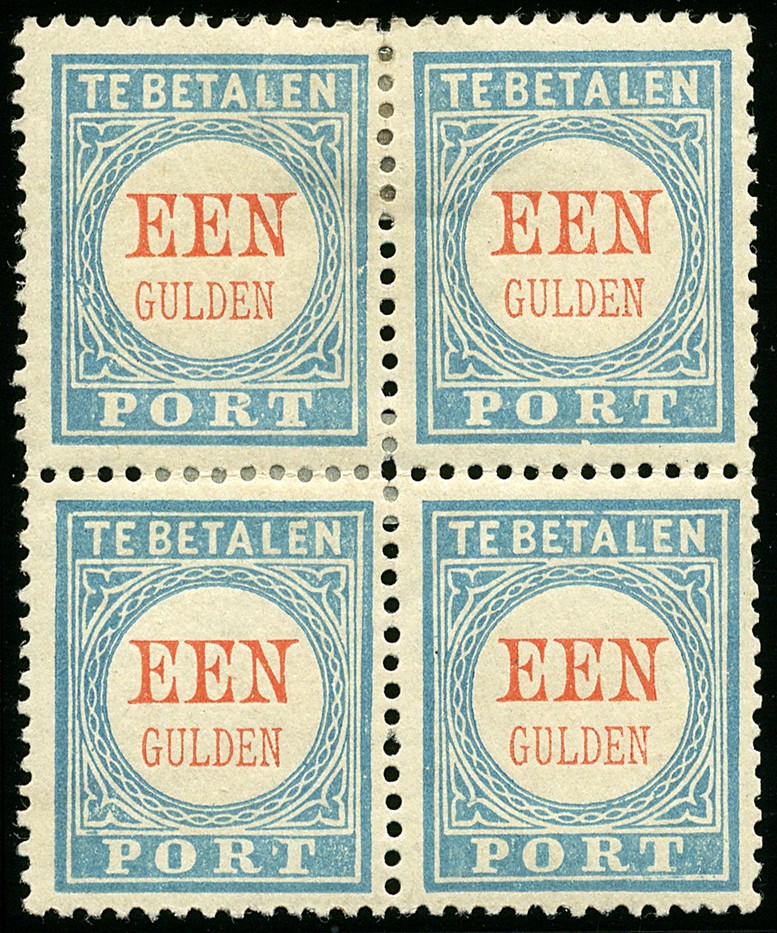 P12DIII, Een Gulden lichtblauw en rood, Kt.12½ gr.g. in ongebruikt prachtblok van vier, rechter-onder-ex. min. kort tandje) € 600