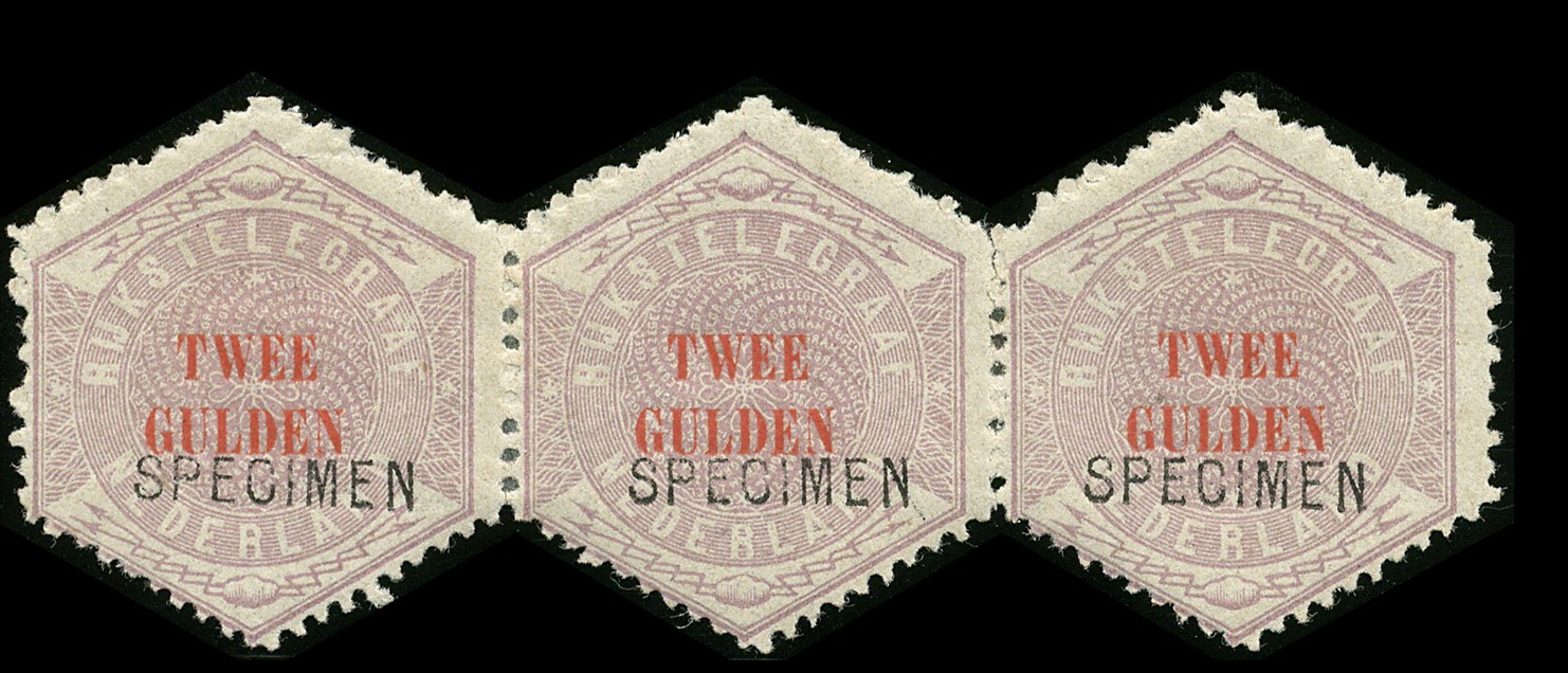 TG1/12 (ex.7), 1 cent t/m Twee gulden cpl. met opdruk Specimen in ongebruikte strippen van drie, beh. een miniem scheurtje in een zegel, een prachtige, waarschijnlijk unieke eenheid! Cert. Muis (1978) € 5250