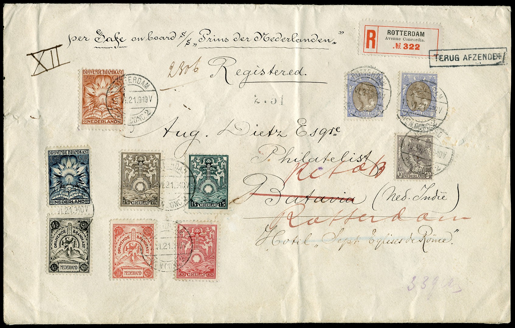 BK1/7, cpl. serie 15 ct. t/m 7½ Gld. met bijfrankering nrs.62 en 67 (2) op aangetekende grootformaat-brief 'Per Safe on board SS. Prins der Nederlanden" van Rotterdam 10-VI-21 naar Batavia, ak. 15-7-21, en geretourneerd naar Rotterdam