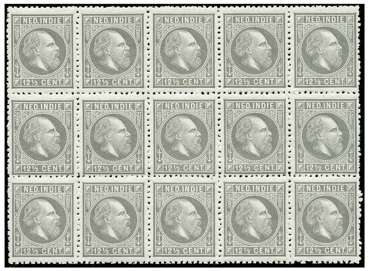 10H, 12½ cent grijs, Kt.12½ kl.g., blok van 15 stuks met volle, originele gom en postfris (az. een paar onbeduidende puntjes en gomvouw), zeer mooi van kleur en zeldzaam in dergelijke eenheid € 600