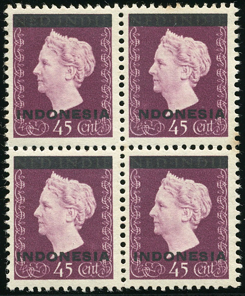 353bf/56bf, 25, 45 en 50 cent in podtfrisse vrijwel prachtblokken van vier waarvan een ex. met foutdruk ´Zonder I van Indonesia´