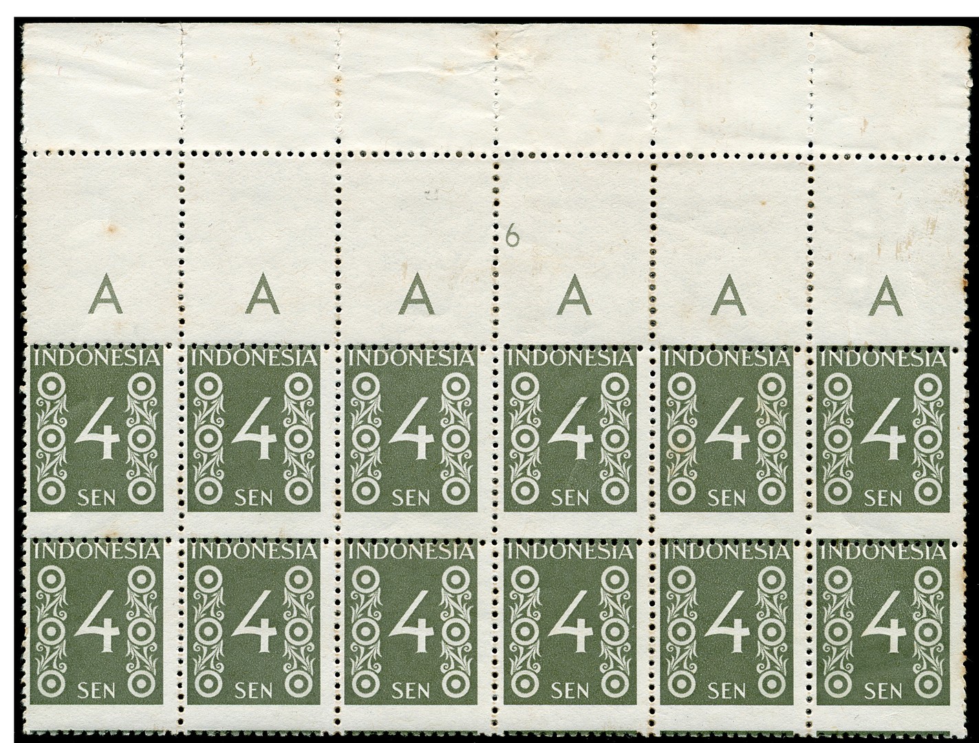 366A, 4 Sen Cijfer type Smelt in postfris, licht tropisch randblok van twaalf met variëteit ´Verschoven horizontale perforatie´