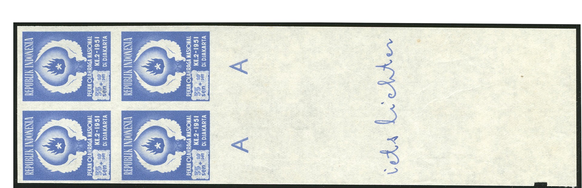 KPI.96A/100A, Tweede Nationale Sportweek 1951, ongetand en ongegomd, randblokken van vier. Rp. 80.000.000