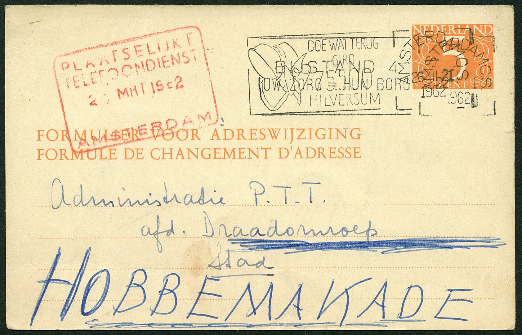 Vhk. G25, de tweetalige 5 cent Van Krimpen, bedoeld voor het buitenland tot 1-4-1957, maar in dit geval op 22-2-1962 lokaal verzonden naar de Adm. PTT afd. Draadomroep, blijkbaar niet juist bezorgd en pas op 26-3-1962 doorgezonden naar de Hobbemakade, weer machinaal afgestempeld maar nu met andere vlag, door de plaatselijke telefoondienst op 27-3 afgestempeld. Een aanvankelijk foutief bezorgde verhuiskaart, en hoewel het juiste tarief 4 cent bedroeg, is deze kaart ECHT GEBRUIKT (dus geen verzamelaarspost). Deze zeldzame verhuiskaart is ook op deze wijze gebruikt een belangrijke aanwinst voor de postwaardestukkenverzamelaar!