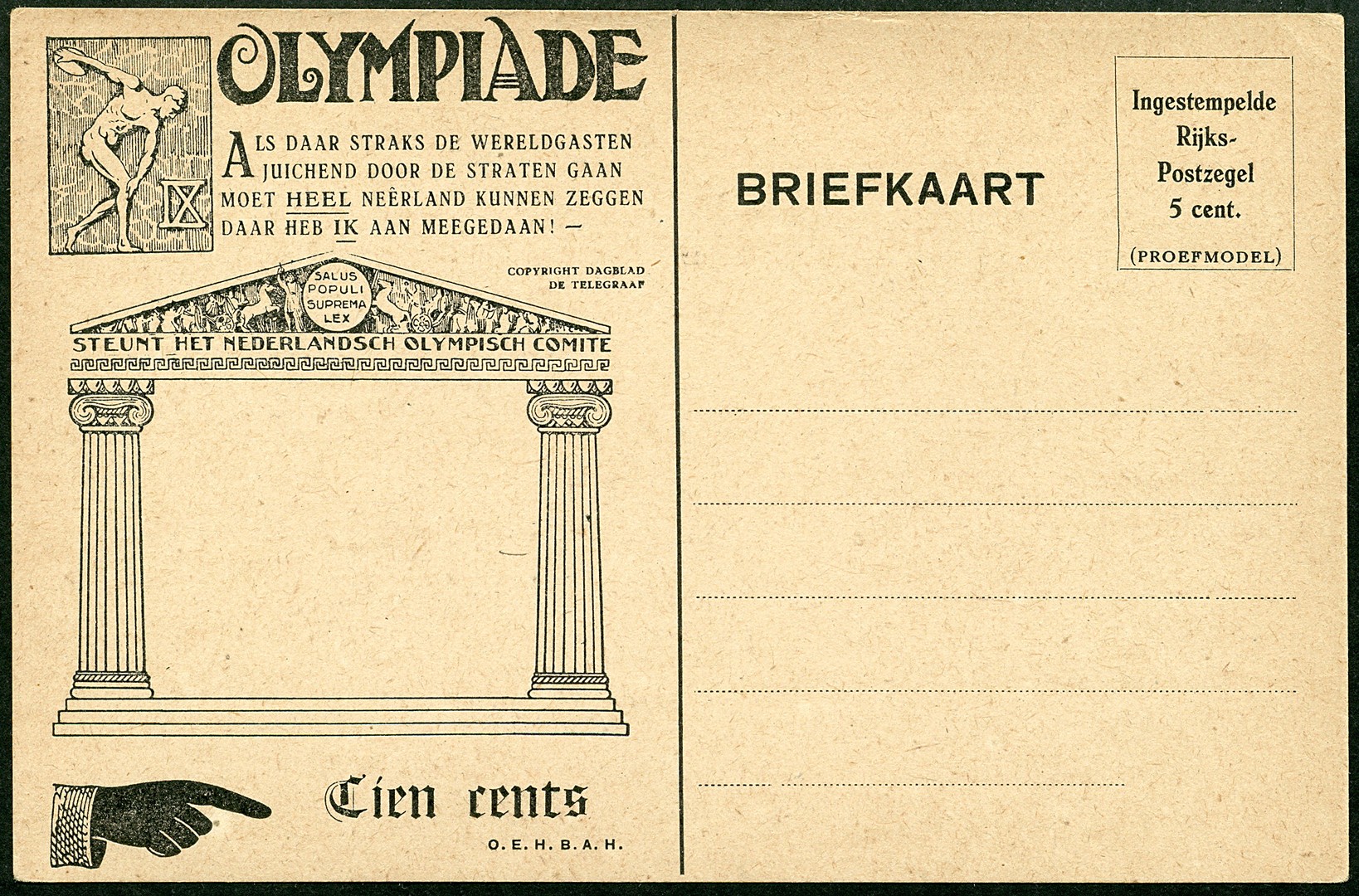 Particulier bedrukte bk. Olympiade 1928. Proefmodel, zwarte druk op bruin zonder bedrukking tussen de zuilen, niet gecatalogiseerd. Prachtkaart