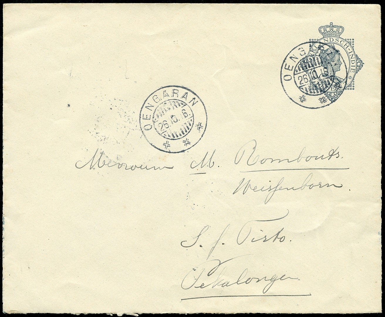 Kortebalkstempels Brebes (1911), Oengaran (1916) en Prambon (1912) op enveloppen van 2x 10 cent resp. 12½ cent. Ideale afdrukken van deze moeilijke stempels (SvL 175, 200 resp. 250)