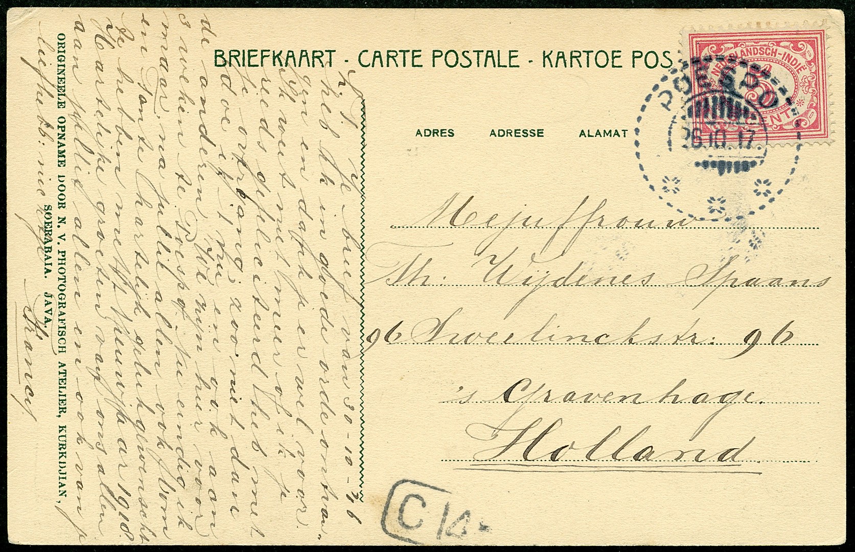 Kortebalk Poespo op 5c op prentbk. van 26-10-1917 naar 's-Gravenhage. Prachtafdruk van dit zeldzame stempel, waarvan ons maar een paar afdrukken bekend zijn (SvL R)