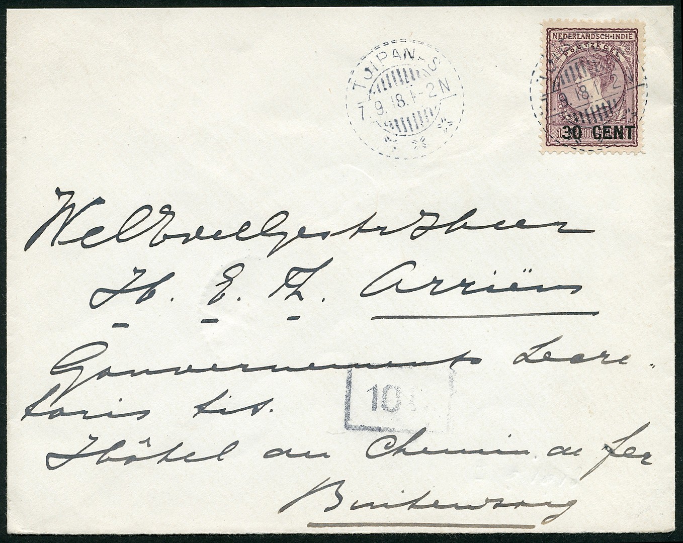 30 Cent op 1 gld nr. 141 op env. (boven en onder geopend) van Tjipanas 17-9-1918 naar Buitenzorg 17-9. De afzender is Hulshoff Pol, algemeen secretaris van Ned.- Indië en behorend tot de staf van de G.G. die toen in Tjipanas verbleef (SvL R)
