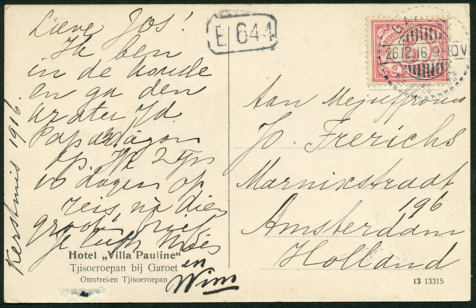Zeer vroege langebalkstempel van Garoet 26-12-1916 op prentbk., een van de nog maar weinig aangetroffen langebalkstempels uit december 1916