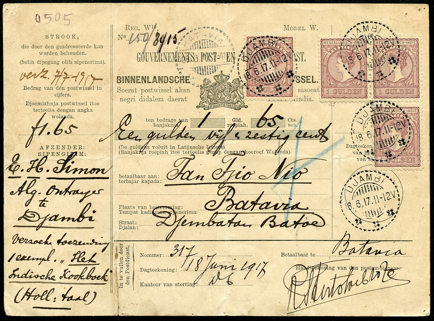 Binnenlandse postwissel met strook waarop vier zegels van 1 gulden, afgest. Djambi 18-6-1917, naar Batavia 28-6. Het uit te betalen bedrag was fl. 1,65 waarvoor een recht bestond van 12½ cent (zie: NITAR 185). De frankering ziet er authentiek uit, maar is door ons niet te verklaren. Ondanks diverse vouwen (waarvan een door onderste zegel) en een scheurtje onder bij de strook, een fascinerend en uiterst zeldzaam poststuk