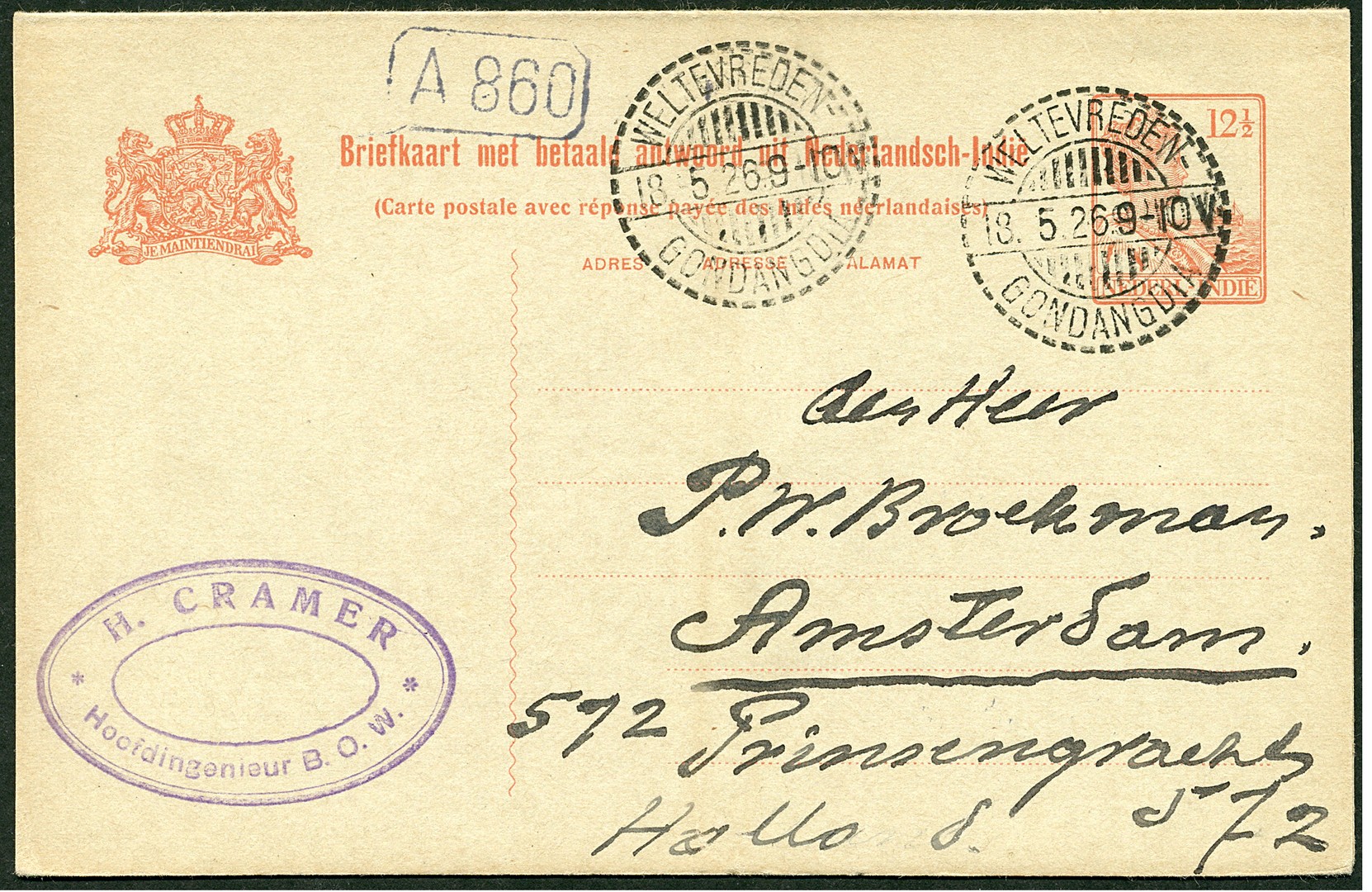 Dubbele bk. op grijs karton G38 (behalve adres verder onbeschreven) van bijpostkantoor Weltevreden-/Gondangdia 18-5-1926 naar Amsterdam. Hoewel verzamelaarspost is dit een van de slechts enkele bekende ex. en bovendien van prachtkwaliteit. Zeldzaam! € 275 cursief