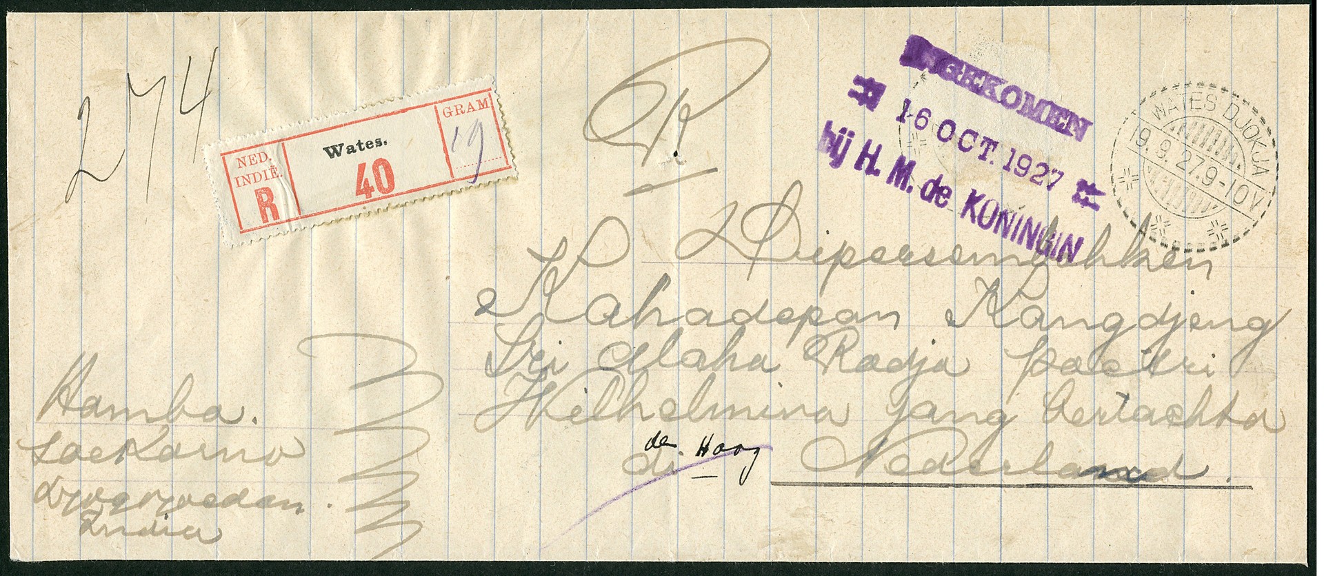 Briefomslag van de student en nationalist Soekarno te Djogojoedan, van het erbij gelegen Wates Djokja op 19-9-1927 aangetekend naar Hare Majesteit, van Apeldoorn/Het Loo 15-10 naar Den Haag. De zegel van 32½ cent is eraf getrokken. Cover from the student and nationalist Soekarno at Djogojoedan, sent from the nearby Wates Djokja on 19 Sep 1927 registered to Her Majesty the Queen, forwarded from Apeldoorn/Het Loo 15 Oct to The Hague. Very rare and historical