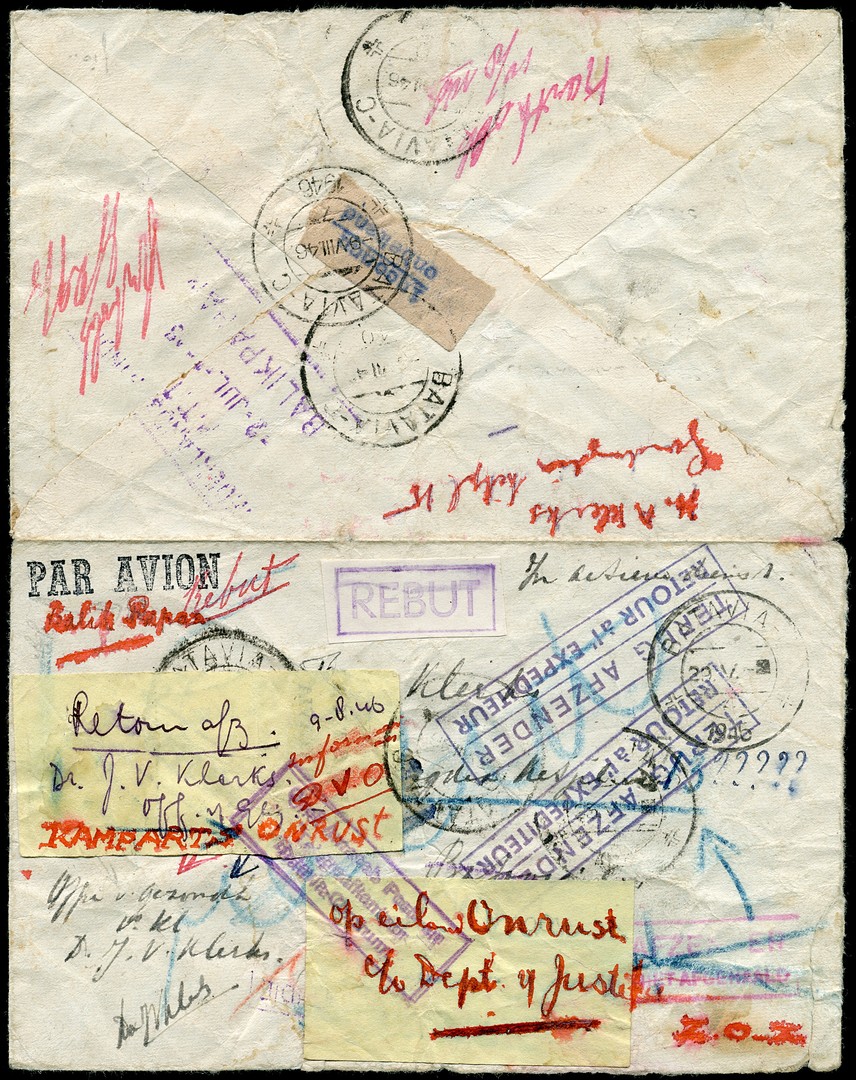 Zwerfbrief (3 zijden geopend) uit 1945-46 afkomstig van de kamparts Klerks op het eiland Onrust, via Batavia en Balikpapan 2-7-1946 uiteindelijk retour Onrust. Talrijke stempels, postale notities, papiertjes. Boeiende puzzel