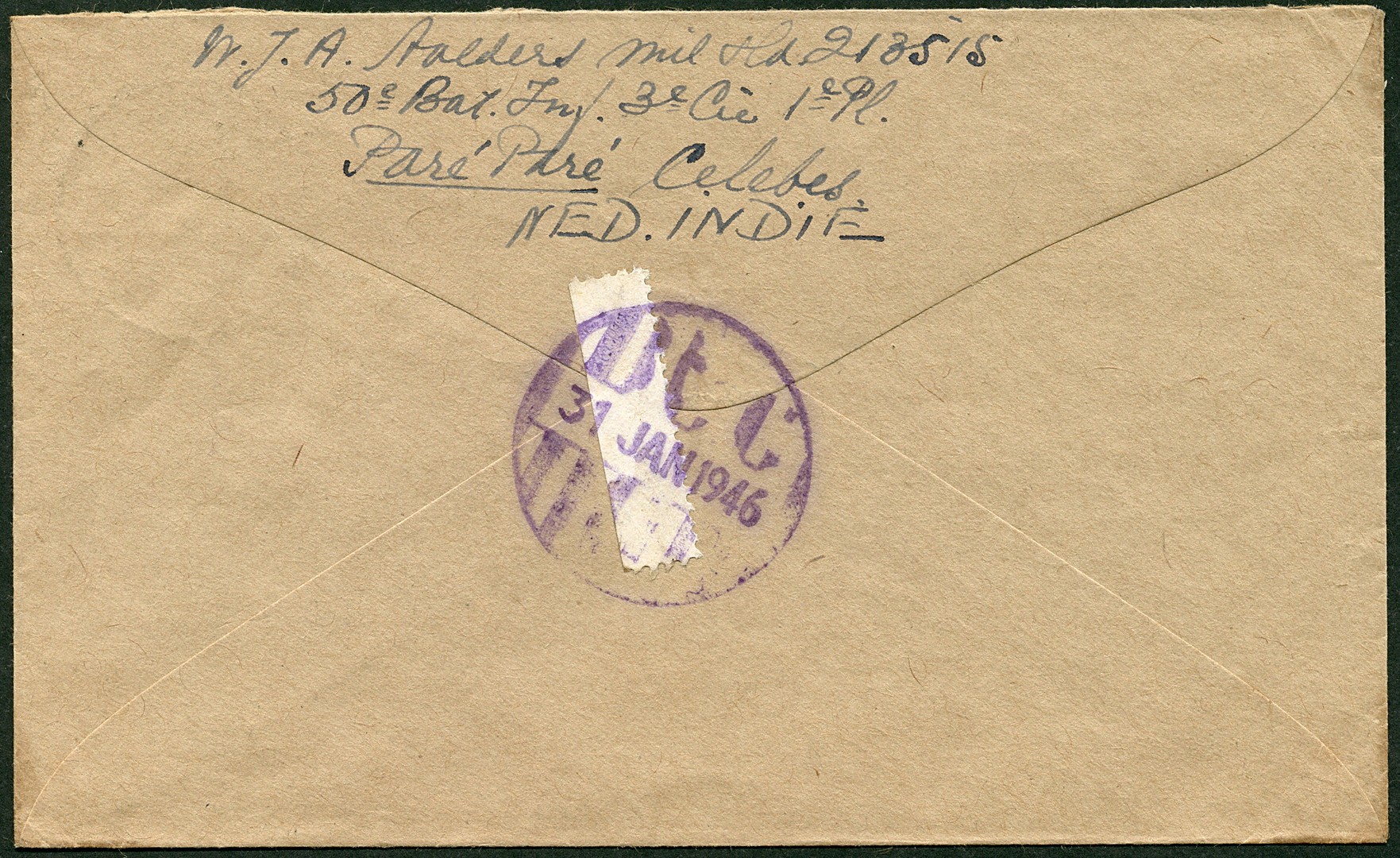 Rubberen noodstempel ´Bt C´, gesneden uit type Bu.NO4, met data 31-1-1946 resp. 7-2-1946 op de az. van 2 poststukken. Zeldzaam type!