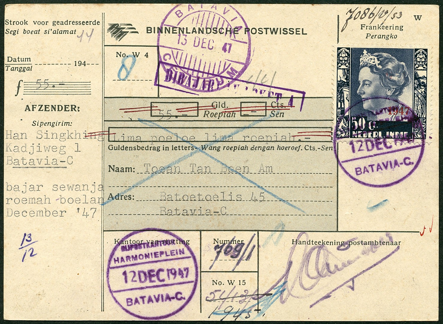 Cpl. postwissel (fl. 55, huur voor december 1947) met 50c nr. 329 als enkelfrankering van bijpostkantoor Harmonieplein 12-12-1947 naar Batavia/Centrum 13-12, maar de uitbetaling is blijven liggen tot 15-1-1954 (az. div. stempels en Indonesisch zegel van 50s). Mooi poststuk!