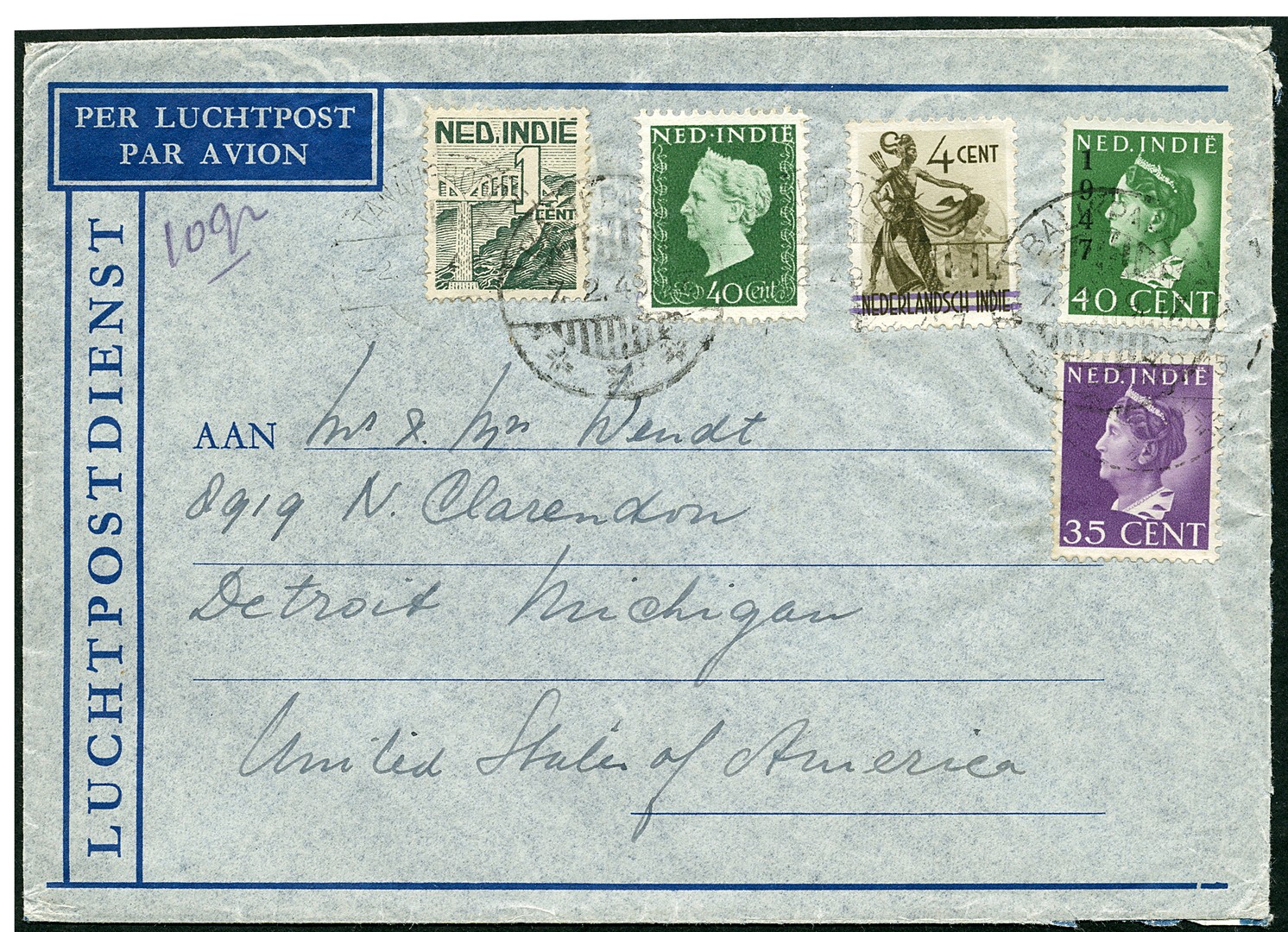 LUCHTPOSTENVELOP VAN 10 GRAM WAAROP 35 CENT VAN KONIJNENBURG NR. 280 (INGAANDE 1-1-1946 NIET MEER GELDIG, TOCH GEACCEPTEERD, ZEGEL HEEFT HALF TANDJE) EN 4 CENT DANSER NR. 301 MET PENDOORHALING OVER LANDSNAAM (OOK NIET MEER GELDIG, WEL GEACCEPTEERD), ALSMEDE 1 CENT NR. 317, 40 CENT NR. 328 EN 40 CENT NR. 340, VAN TANAHGROGOT 2-2-1949 (ZEER LICHTE AFST.) OVER BALIKPAPAN 7-2 NAAR DE USA. OPMERKELIJKE (OPMAAK)FRANKERING VAN TOTAAL 120 CENT, HOEWEL JUISTE TARIEF 130 CENT BEDROEG (BRIEFPORT 20 CENT + LUCHTRECHT 55 CENT PER 5 GRAM, ZIE NITAR 485). ZEER BIJZONDER POSTSTUK EN NAAR ONZE MENING AUTHENTIEK. EX HARDJASUDARMA