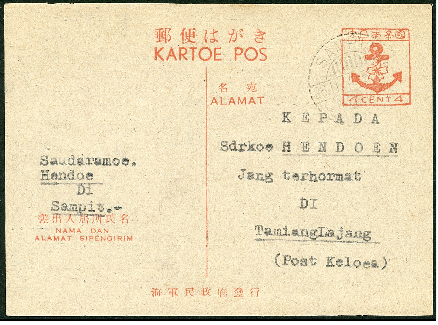 Borneo. 4 Cent anchor and cherry blossom postcard Bu.231 from Sampit 26.11.4.5 to Tamiang Lajang (North of Amoentai). Ex Mattern