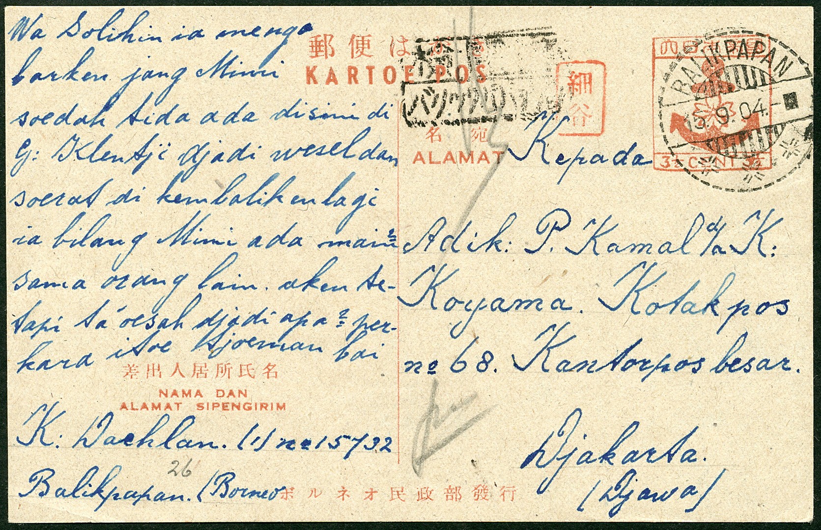 Borneo. 3½ Cent anchor and cherry blossom postcard Bu.229 from Balikpapan 15.9.04 to Djakarta. Censor Bu.JC3a