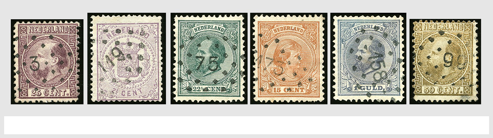 PUNTSTEMPELS, kleine verzameling van 76 nummers op verschillende emissies en waarden, met veel mooie en luxe afstempelingen w.o. 139 (nr. 38), 158 (nr. 28), 173 (nr. 41), 250 (nr. 38), 256 (nr. 19), etc. op 4 insteekkaartjes