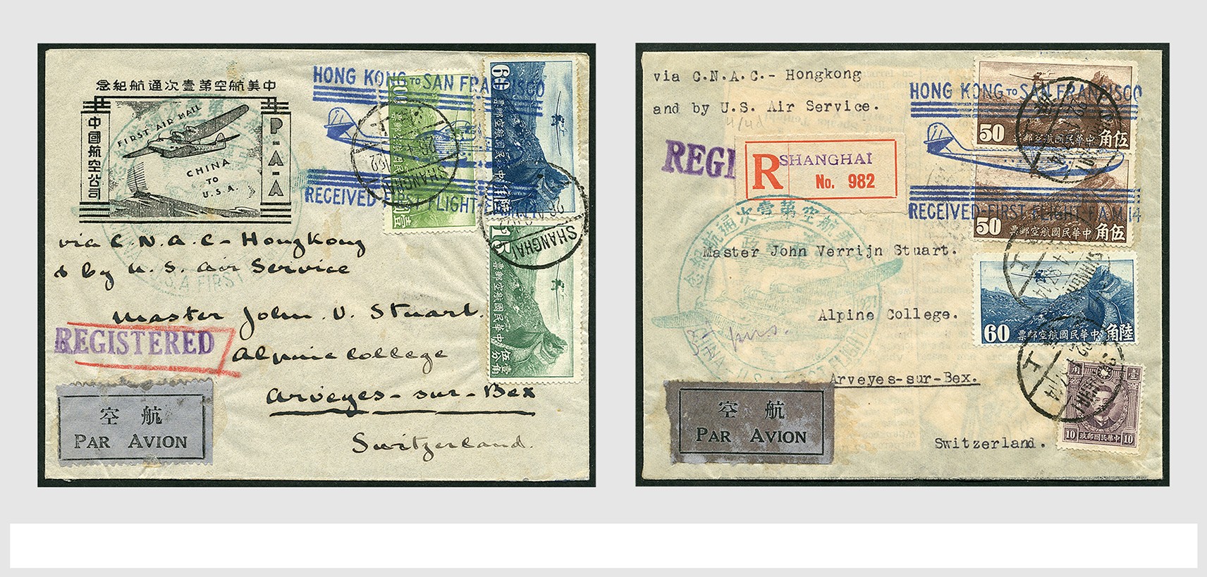 CHINA, nice and very interesting small group of 13 covers/cards 1937-50 from and to Shanghai with a wide variety of frankings, postage due, first airmail Hong Kong to San Fransisco 26-4-1937, By Pan American Airways Service via U.S.A. (1941), censor marks/labels, etc. Bonus: The Asia Stamp Journal Aug 1939 including news paper articles and mint stamps from China mostly 1980s and 90s
