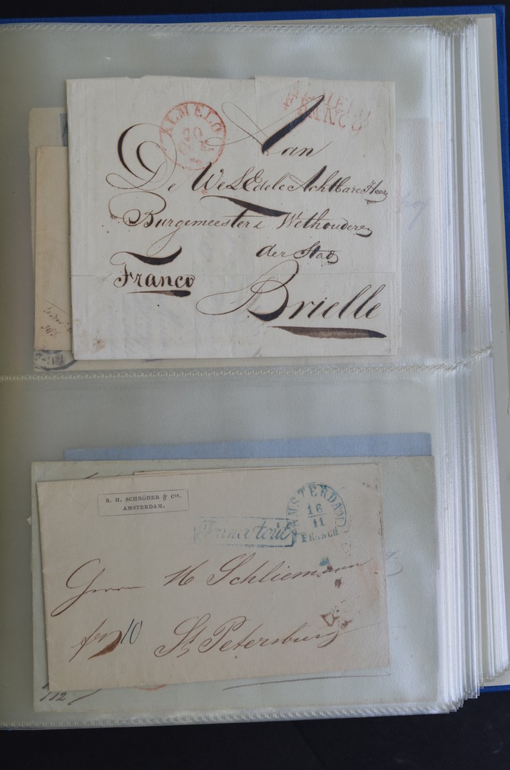 POSTHISTORIE, 44 poststukken w.o. voorfila met departementsstempels, naamstempels, etc. en gefrankeerd met nrs. 4 (3x), 5 (1x) en R-brief met nr. 41 etc., alsmede 23 oudere buitenlandse poststukken vnl. 1874-1901 naar Nederland, 2 stukken uit 1943-44 naar krijgsgevangenen in Japanse kampen, etc.