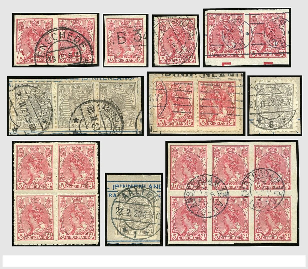 STAKINGSZEGELS. Bijzondere en zeer uitgebreide, gespecialiseerde studieverzameling van de ongeperforeerde 5 en 10 cent Bontkraag nrs. 82/83 met o.a. ongebruikte veldelen, eenheden, gestempelde zegels met het oog op welke kantoren en de daarbij behorende gebruiksdata, (particuliere) noodtandingen w.o. van Bergen (N.H.) (Korteweg), Blokzijl (Veen) en Ede (v.d. Berg), ruim 110 poststukken waarbij met noodtanding (ook zakenpost), aangetekend, per expresse, onder rembours, (enkel)frankeringen, interessante data, bestemmingen, beport, etc. etc. incl. literatuur in album en ringband, veelal met toelichting. Zie ook: HPN.A9-84/91. Veel schaars tot zeldzaam materiaal en in deze omvang zelden aangeboden!