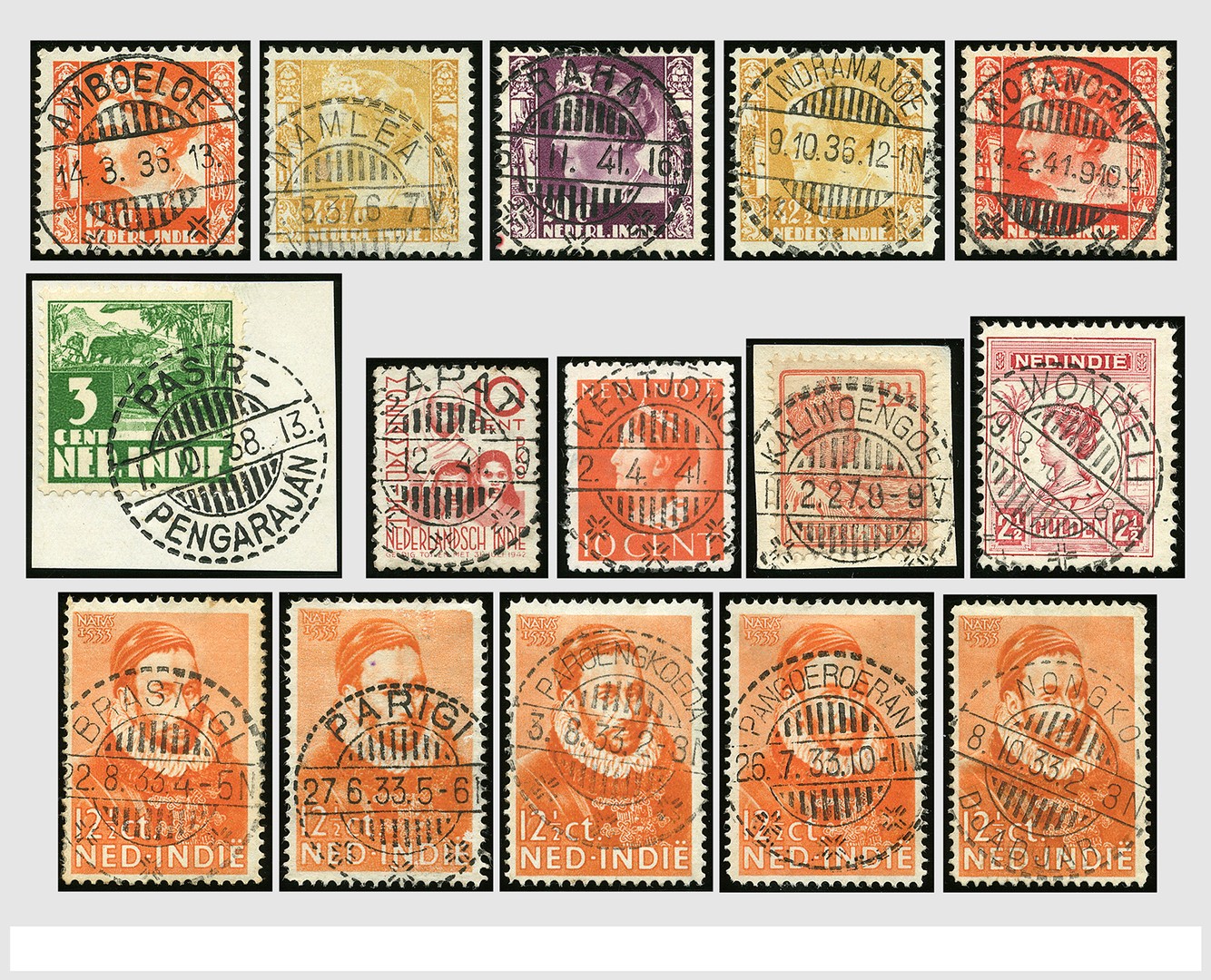 NED.- INDIË POSTHISTORIE, insteekboek met collectie langebalkstempels 1917-1942 van A t/m W op losse zegels waarvan sommigen op briefstukje, met diverse typen smalle- en brede balk, gesloten buitenring of biffage, etc. w.o. van meerdere kleine hulppostkantoren, veel op lichtkleurige zegels en merendeels in uitgezochte kwaliteit