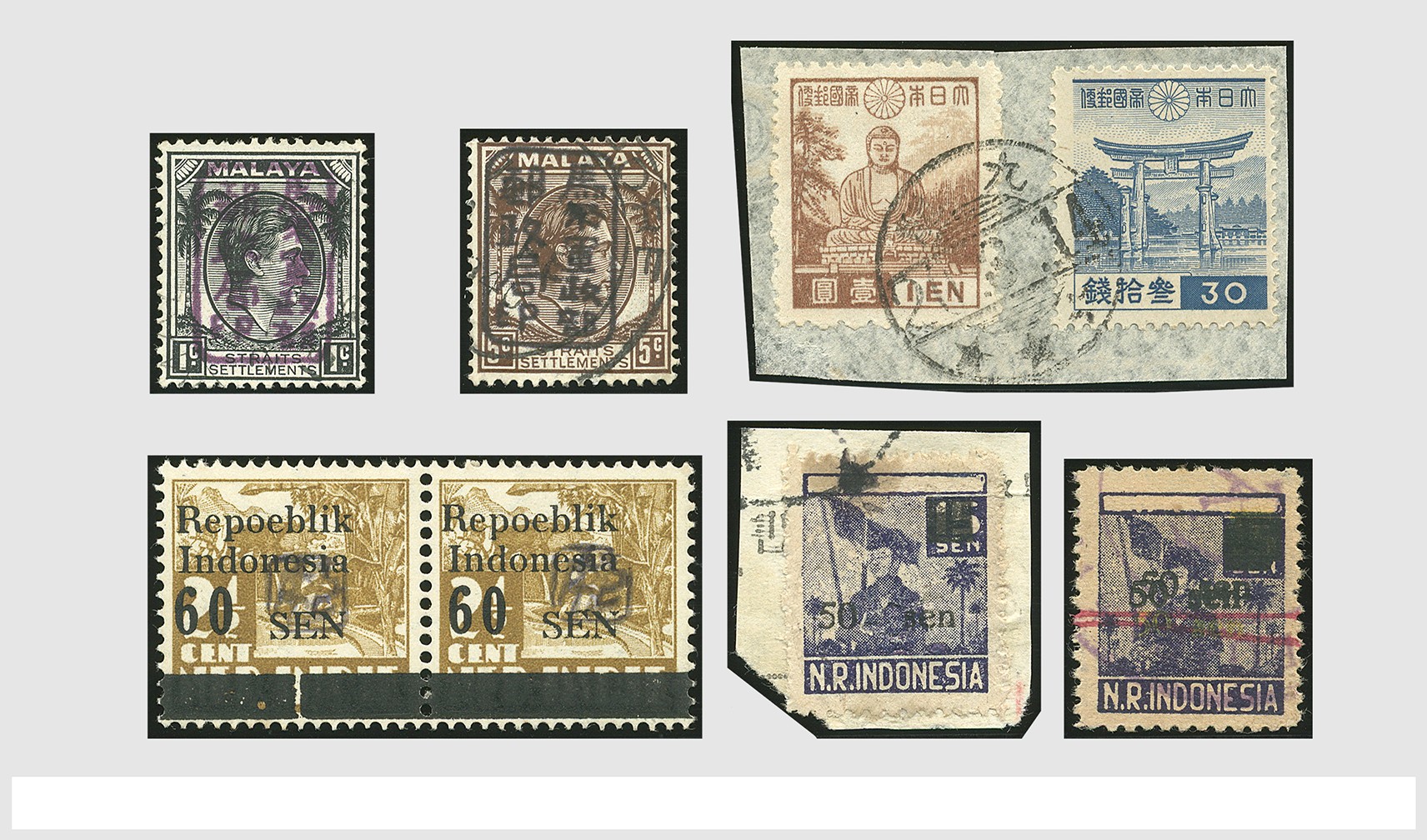 JAPANESE OCCUPATION & REPUBLIK INDONESIA 1945-1949, Definitive issues, General Printings, several common overprints, rare overprints on Malayan stamps, some Burma, few used in Hong Kong, few covers, all mostly unused in blocks, part of sheets of complete sheets, some varieties (inverted overprint, mis perforation, proofs with shifted print, etc. in stock book. Interesting!