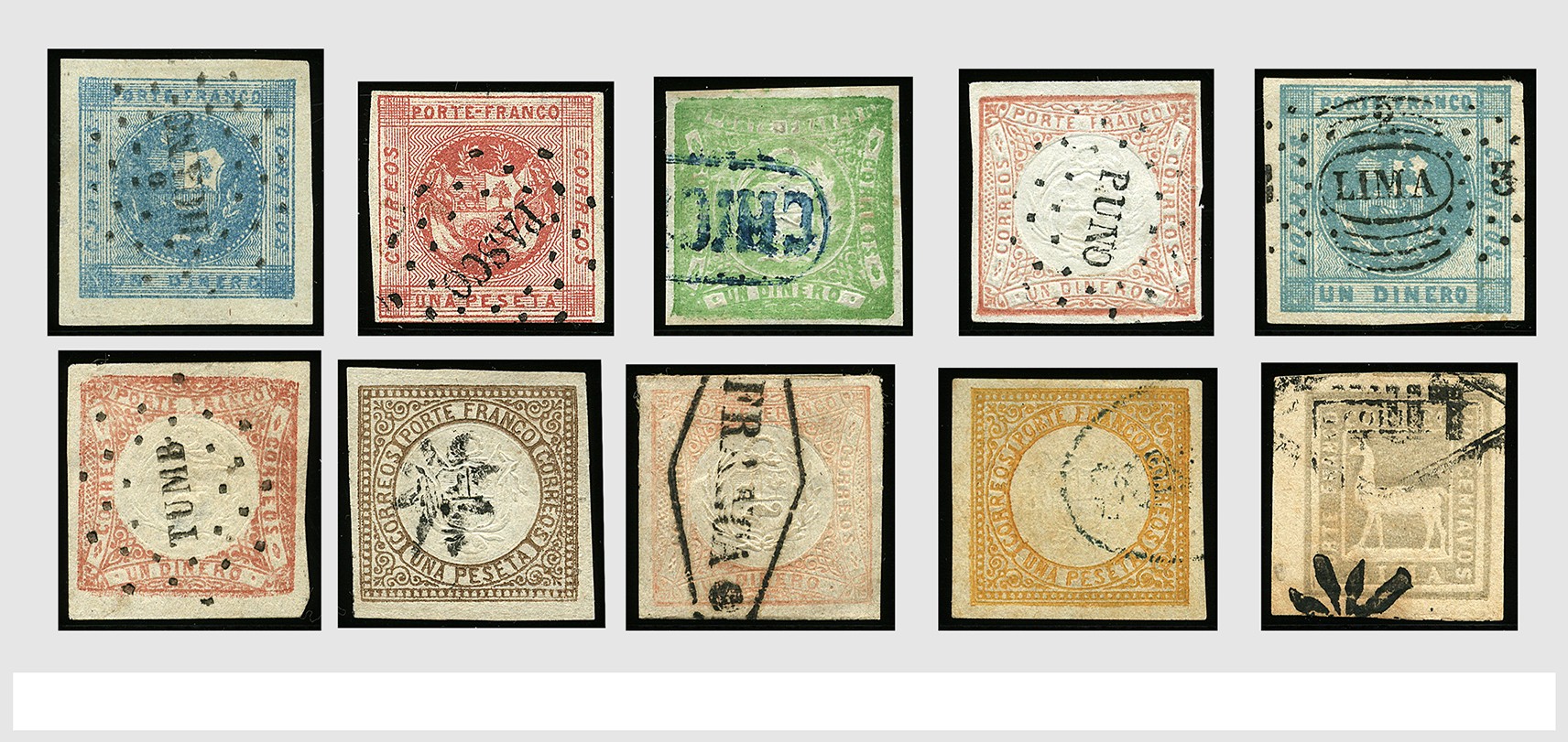 PERU 1858-1873, uitgebreide verzameling afstempelingen op de klassieke uitg. wb. paren en strippen en vele schitterende afdrukken. De verzameling loopt verder tot 1942 en dan gebr./ongebr./postfris, wb. div. ex./series in aantallen. Een ideale koop voor de 'cancel-finder', maar zeker ook om verder te detailleren. Enorme cataloguswaarde!