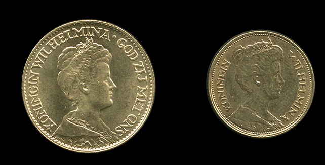 NEDERLAND, Gouden 5 Gulden Wilhelmina 1912 (Sch.745) F/ZF en Gouden 10 Gulden Wilhelmina 1917 (Sch.748) ZF