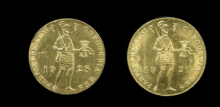 NEDERLAND, 2 x Gouden Dukaat 1921 (Sch.772) ZF en 1928 (Sch.779) ZF