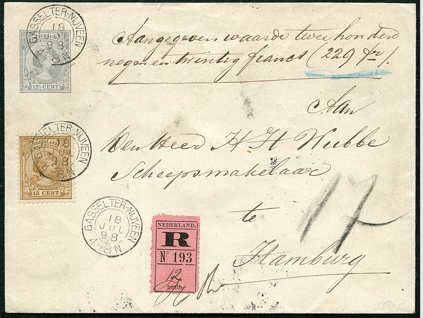 Kleinrond GASSELTER-NIJVEEN op 12½ cent env. G7 (niet-storende vert. vouw) bijgefr. met 15 cent op 18-7-1898 aangetekend met aangegeven waarde van 229 francs via spoorwegtraject Oldenburg-Neuschanz 19-7-1898 naar Hamburg 19-7-1898. Superbe afstempelingen!