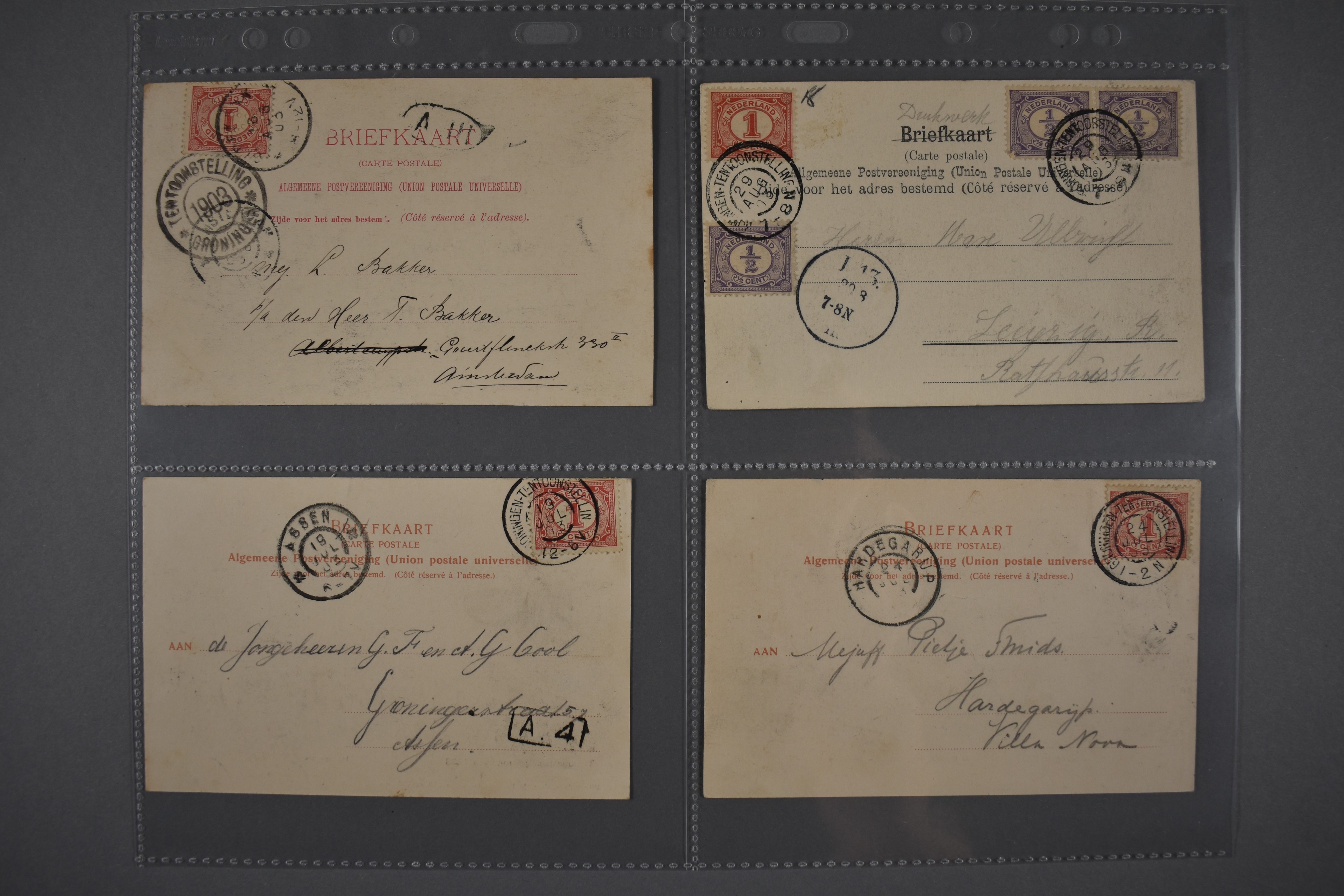 Grootrond GRONINGEN-TENTOONSTELLING op prentbriefkaarten uit 1903 met data 19-7, 24-7 en 29-8 en een prentbk. uit Oudkerk 16-8 met dubbelcirkelstempel ´Tentoonstelling/Groningen/1903´. Dit grootrond is gebruikt op het tijdelijke bijpostkantoor van de tentoonstelling Kunst & Nijverheid van 15 juni t/m 1 september 1903