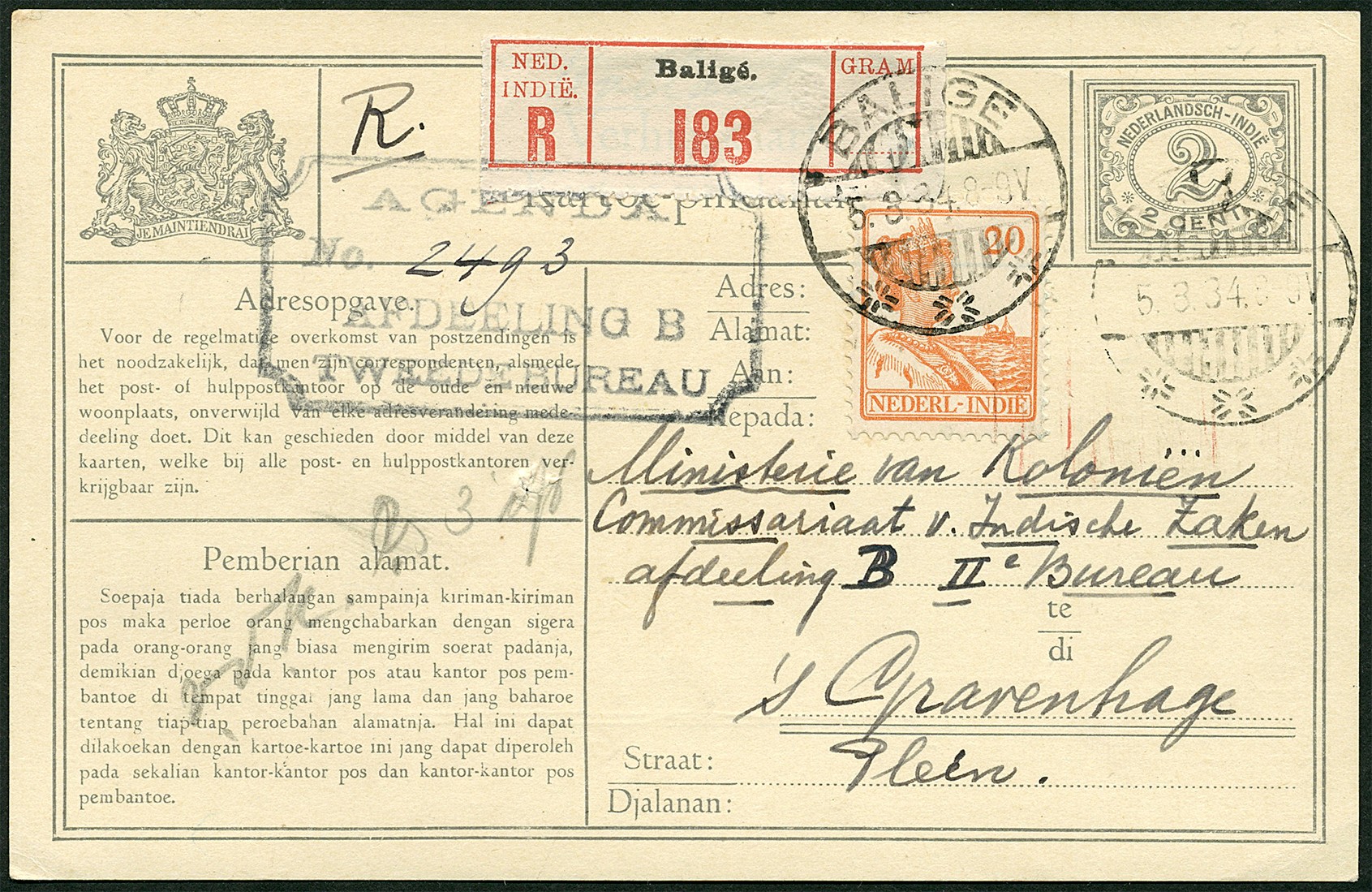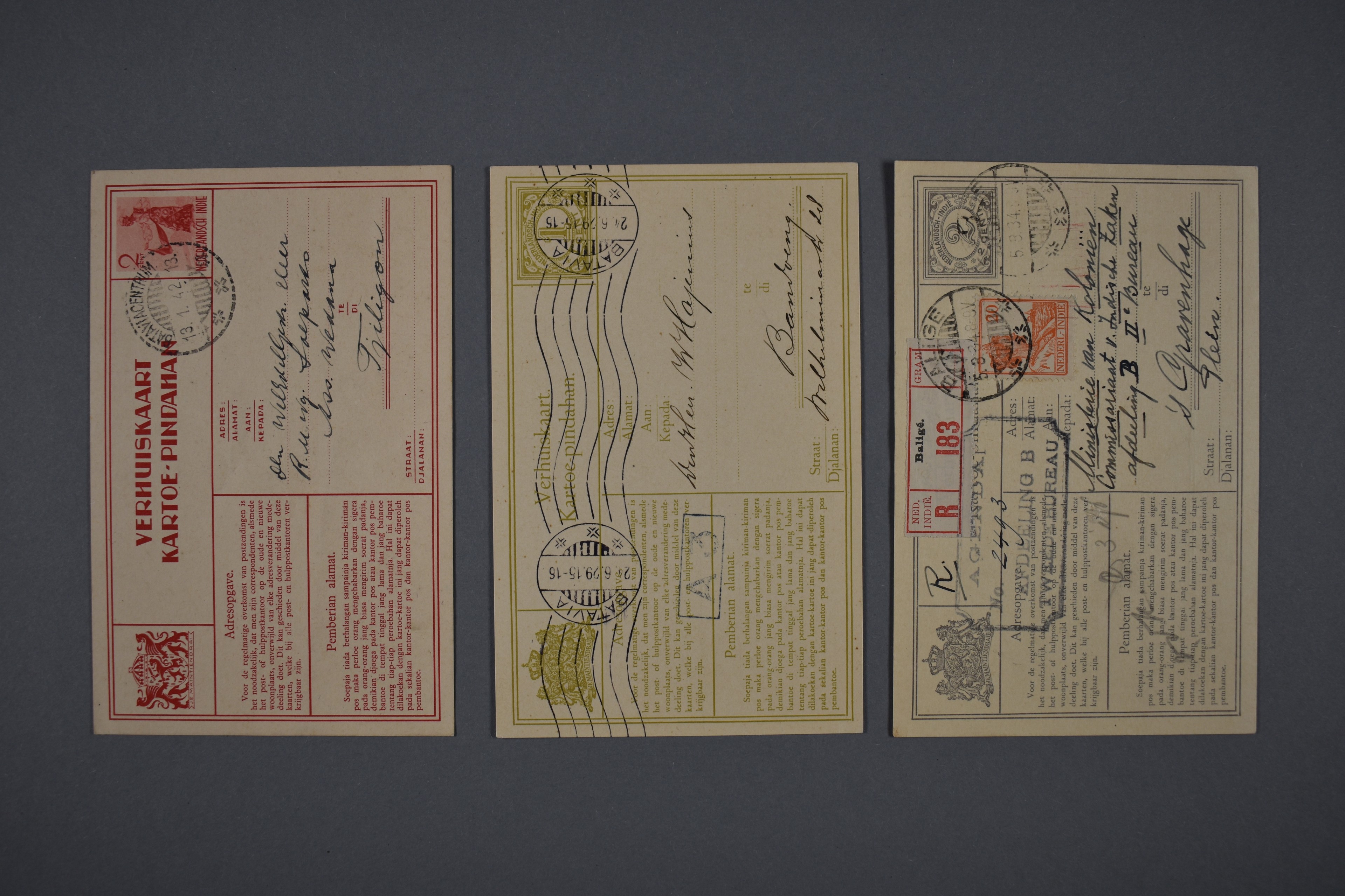 Drie verhuiskaarten. G4a met verzoekafst. rolstempel Batavia 24-6-1929, G10 van Bataviacentrum 13-1-1942 en G8 (pingaatje) aangetekend van Balige 5-3-1934 naar ´s-Gravenhage