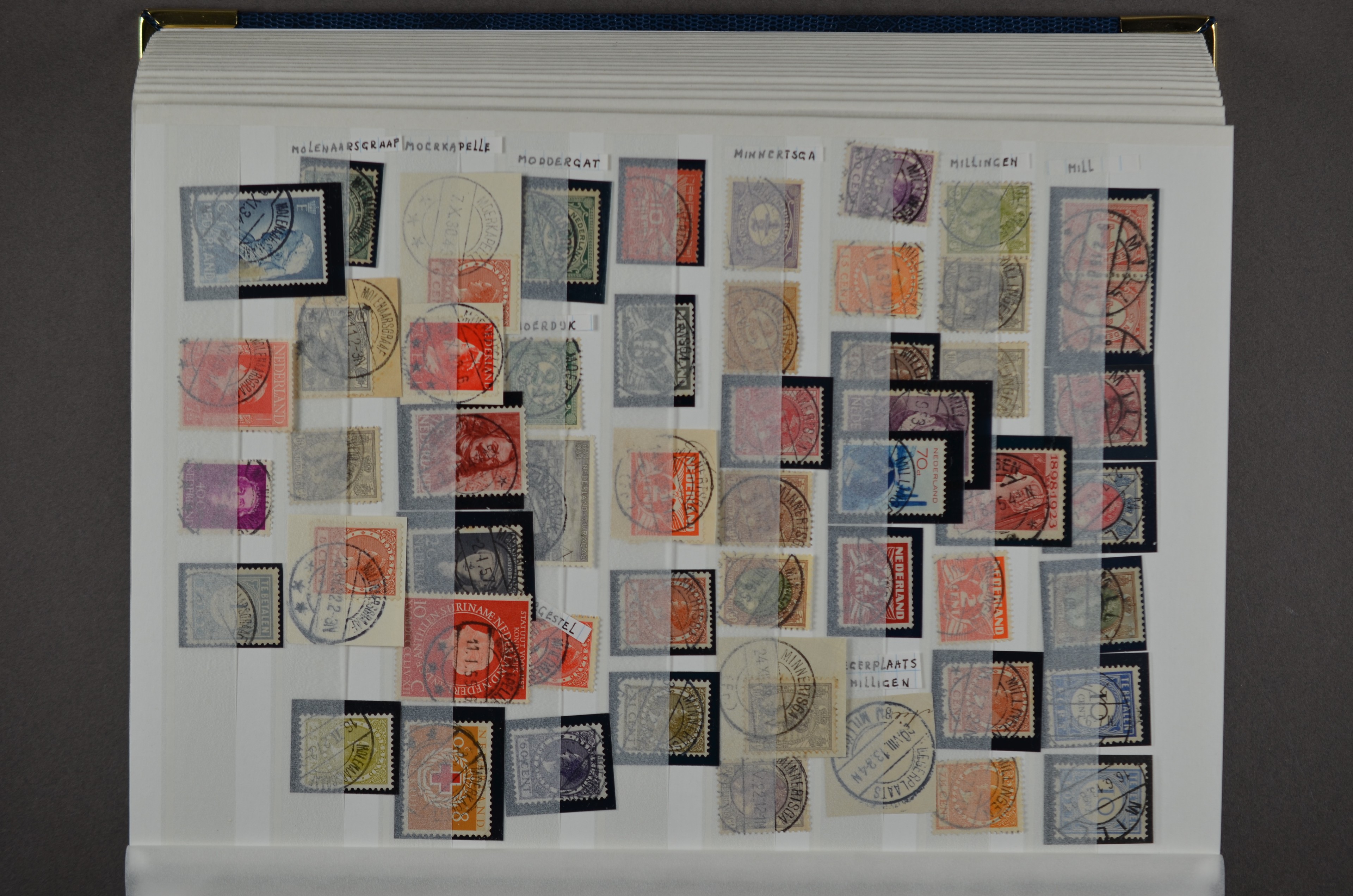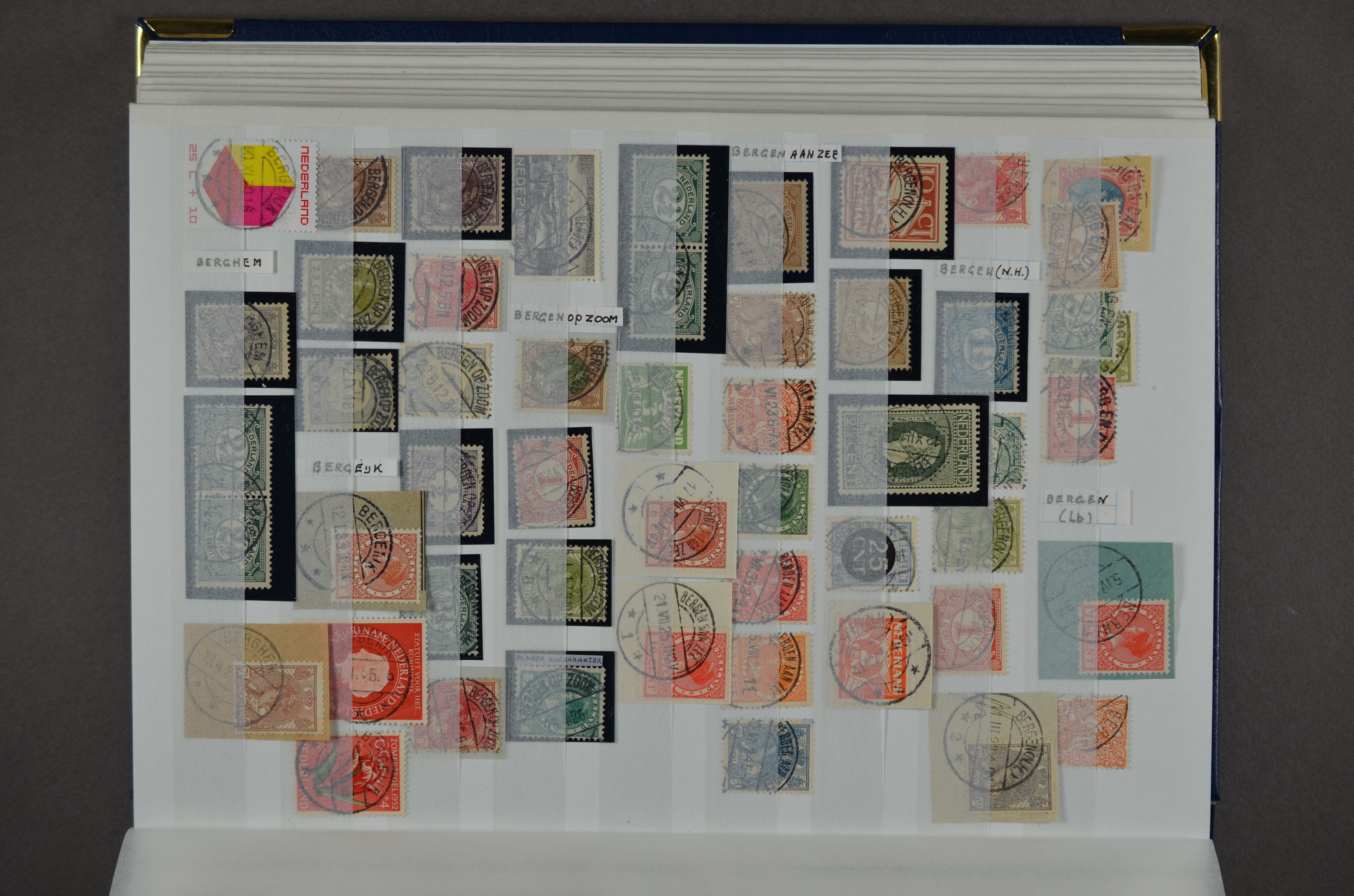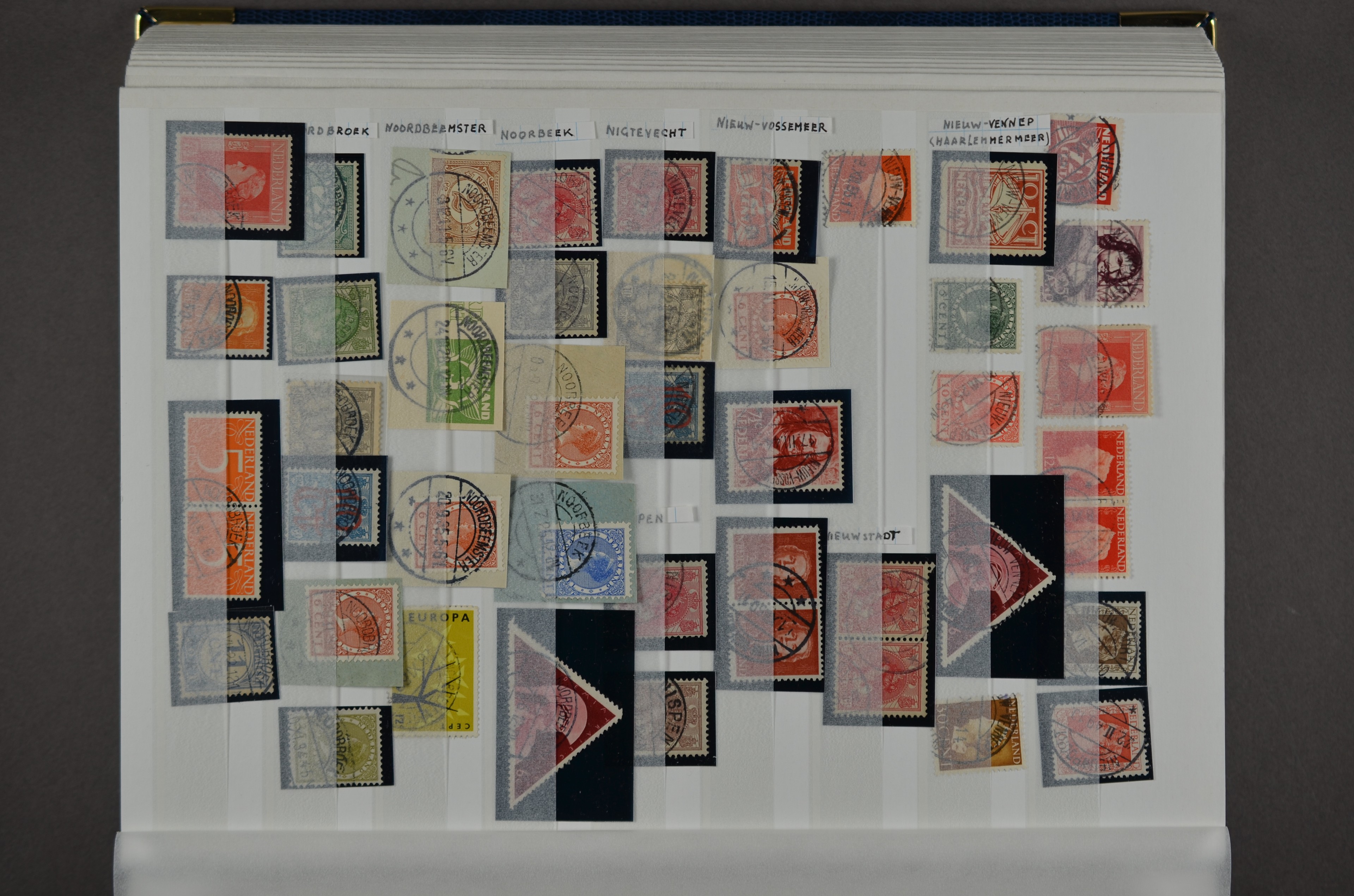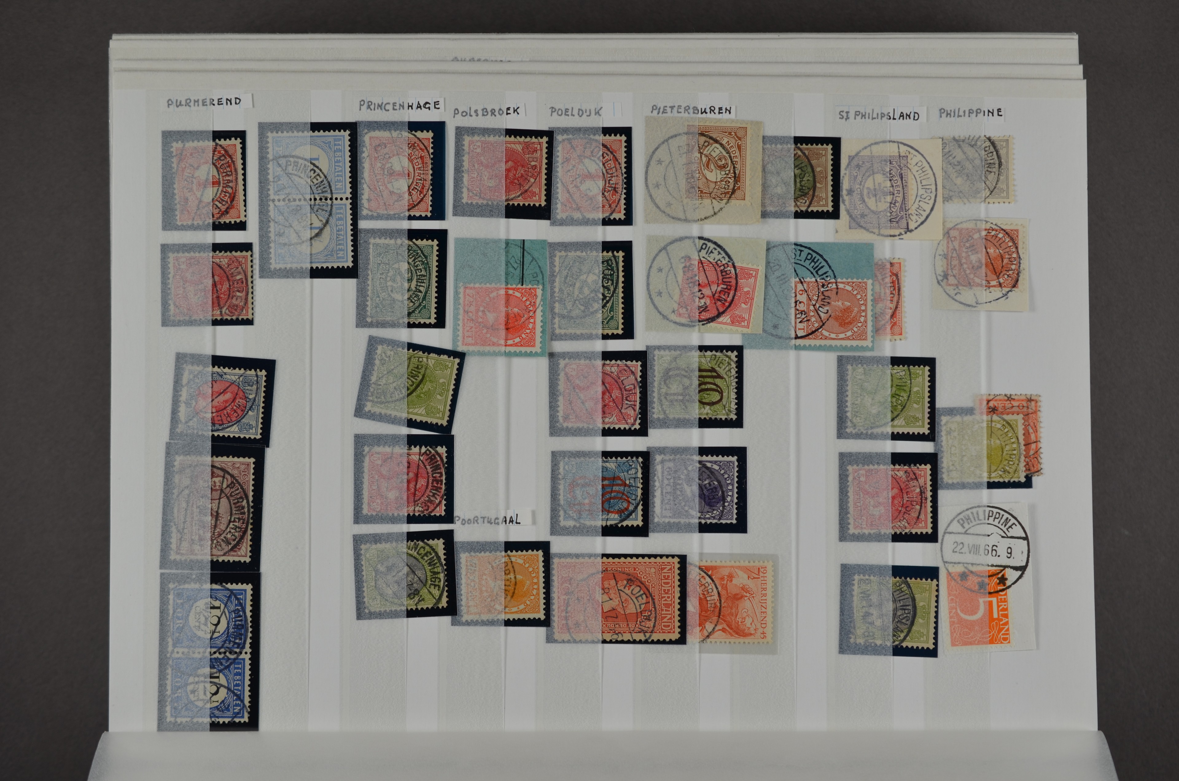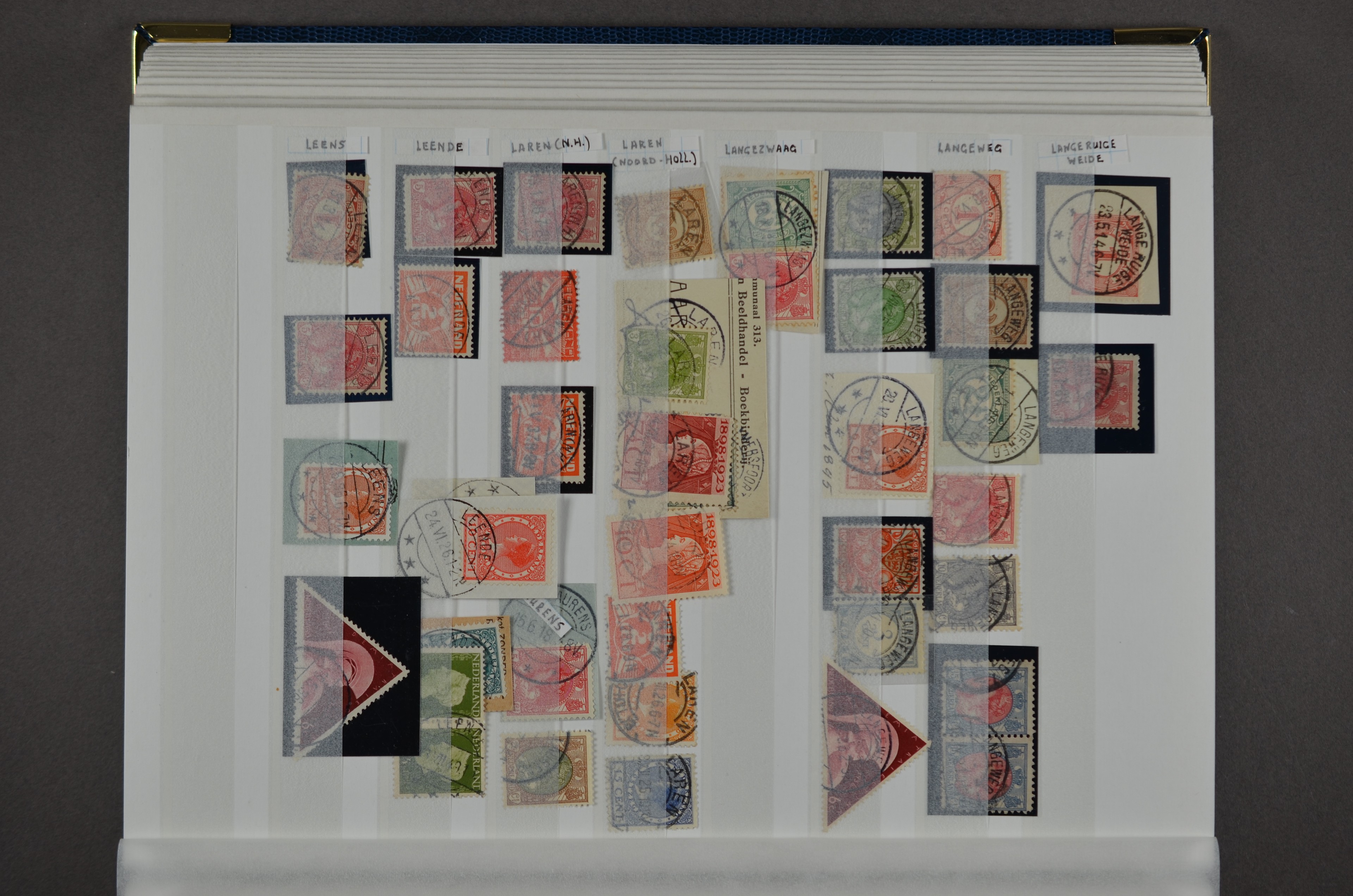 LANGEBALKSTEMPELS, uit Velling type 134/155 op vele, vele honderden losse zegels, merendeels volledige afstempelingen. Het lijken zogenaamd gewone, (semi-)moderne stempels maar in een dergelijke omvang, met zo veel kleine kantoren en in zulke uitzonderlijke kwaliteit nauwelijks meer bijeen te brengen. Voor de liefhebber, op alfabetische volgorde gesorteerd in 3 dikke insteekboeken vol verzamelplezier!