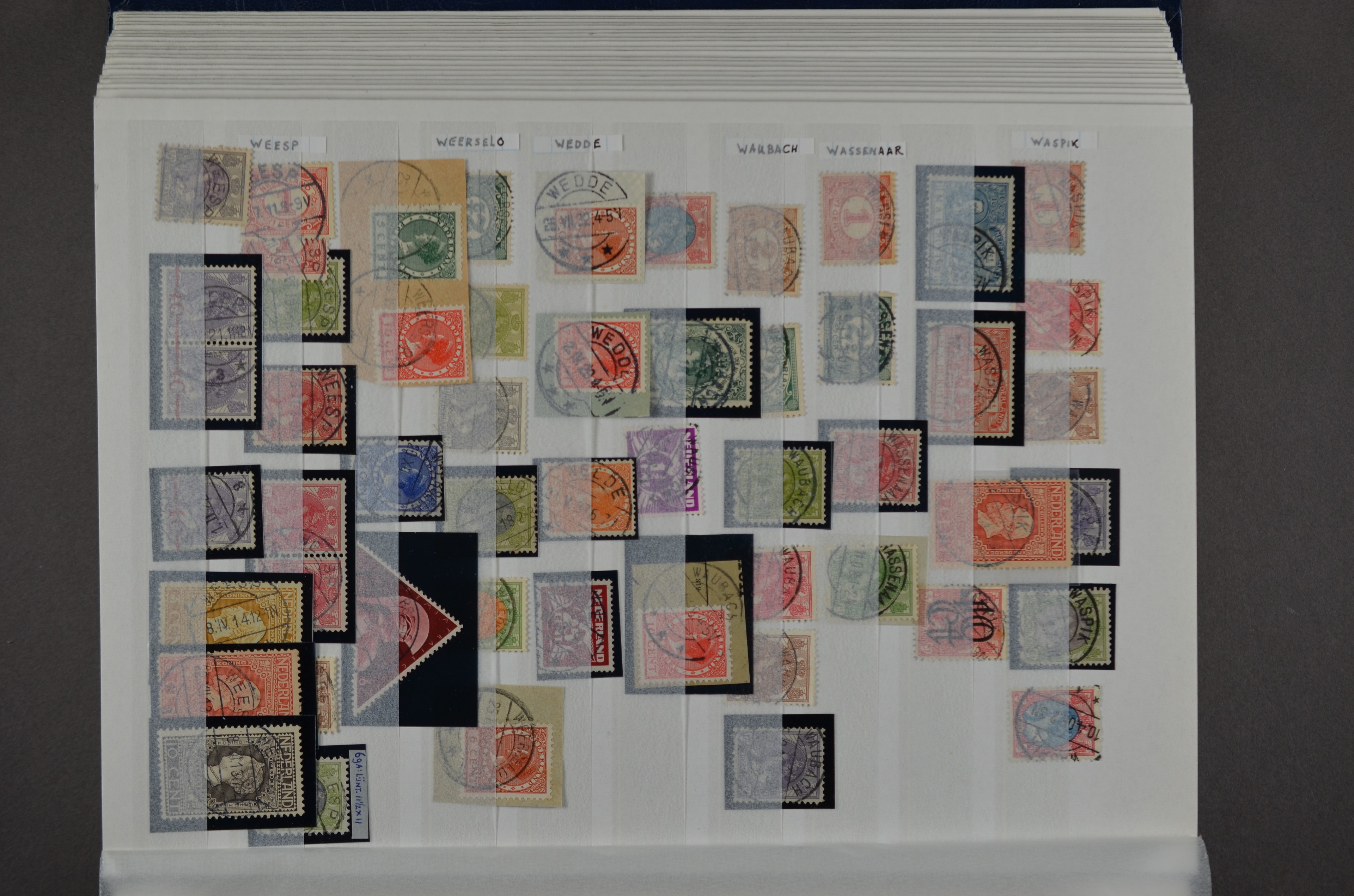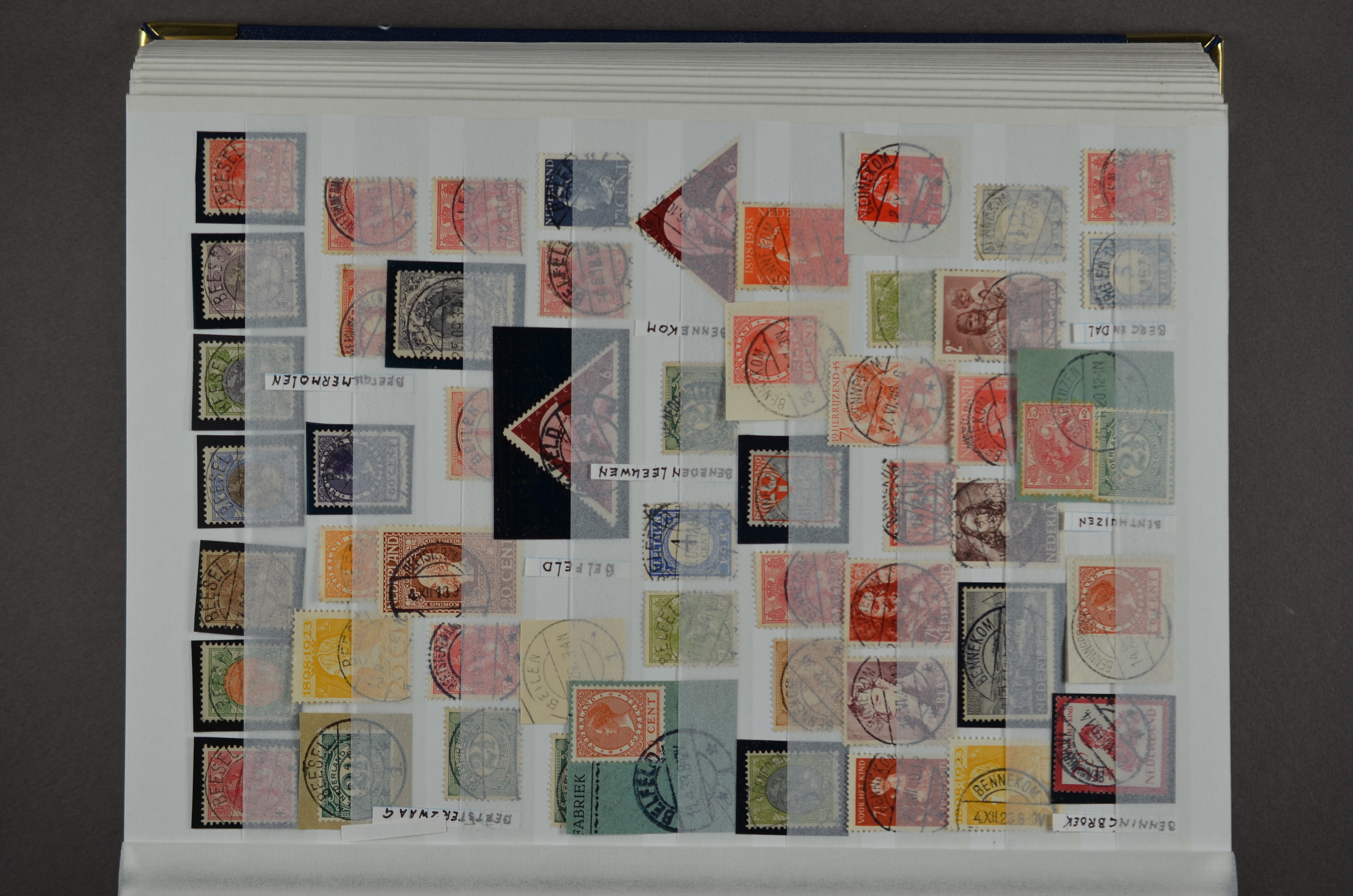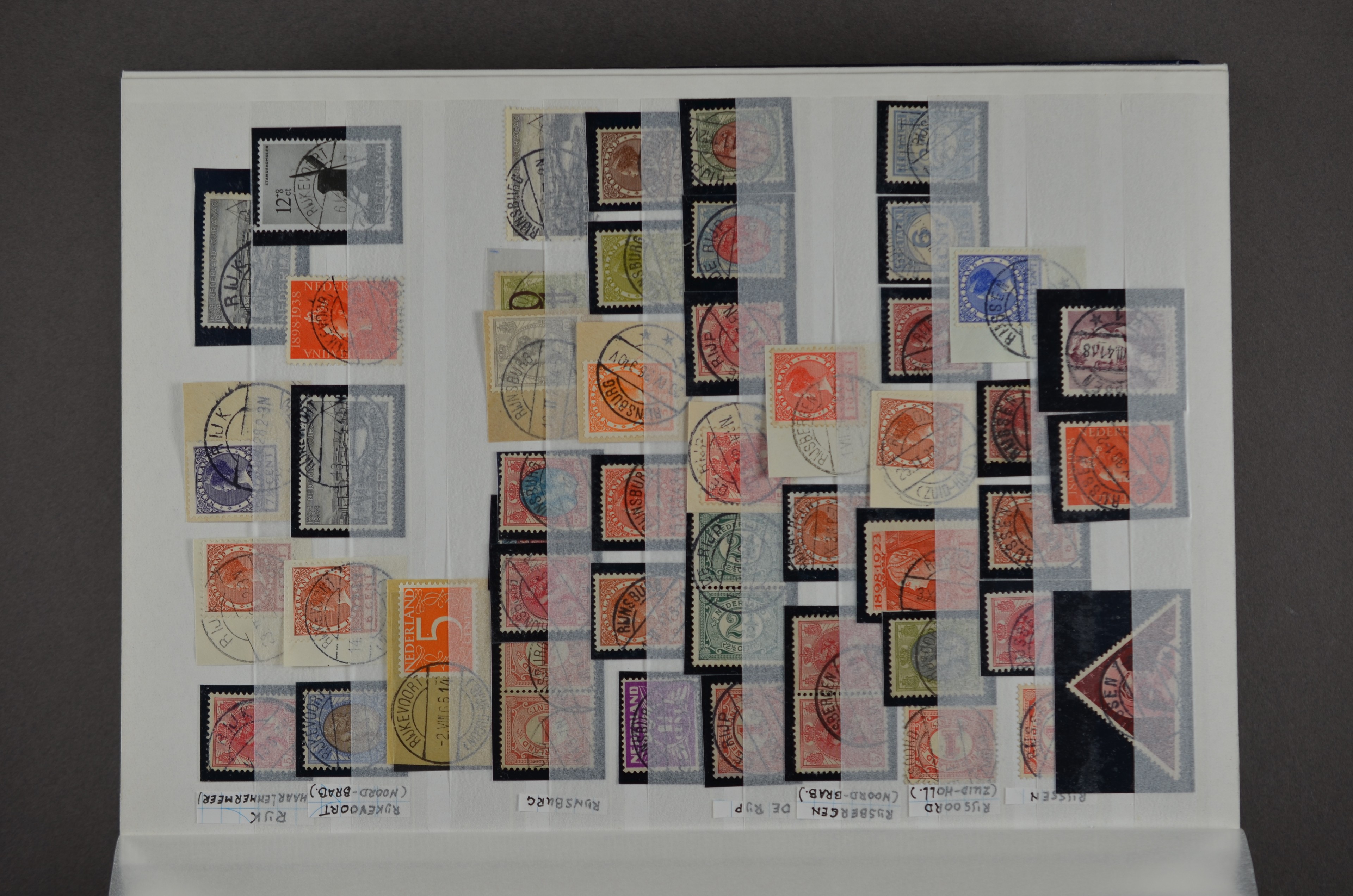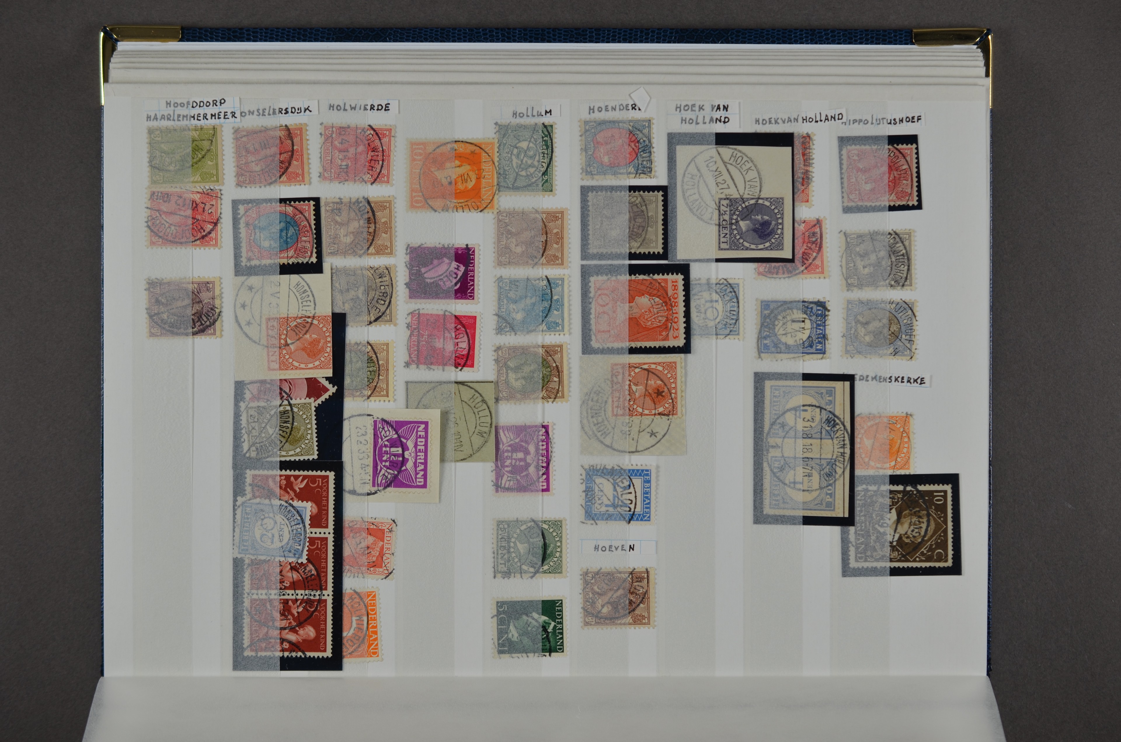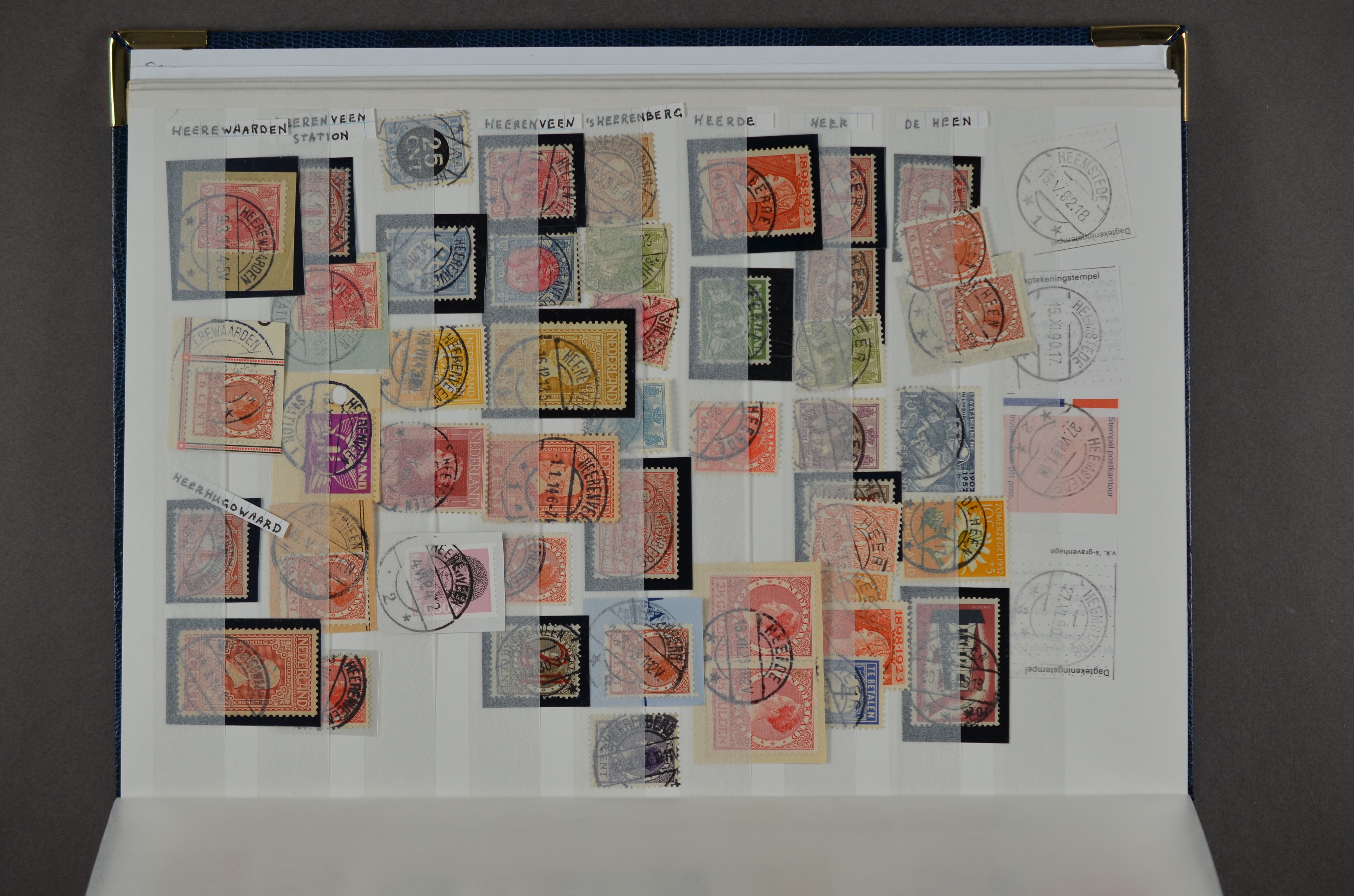 LANGEBALKSTEMPELS, uit Velling type 134/155 op vele, vele honderden losse zegels, merendeels volledige afstempelingen. Het lijken zogenaamd gewone, (semi-)moderne stempels maar in een dergelijke omvang, met zo veel kleine kantoren en in zulke uitzonderlijke kwaliteit nauwelijks meer bijeen te brengen. Voor de liefhebber, op alfabetische volgorde gesorteerd in 3 dikke insteekboeken vol verzamelplezier!