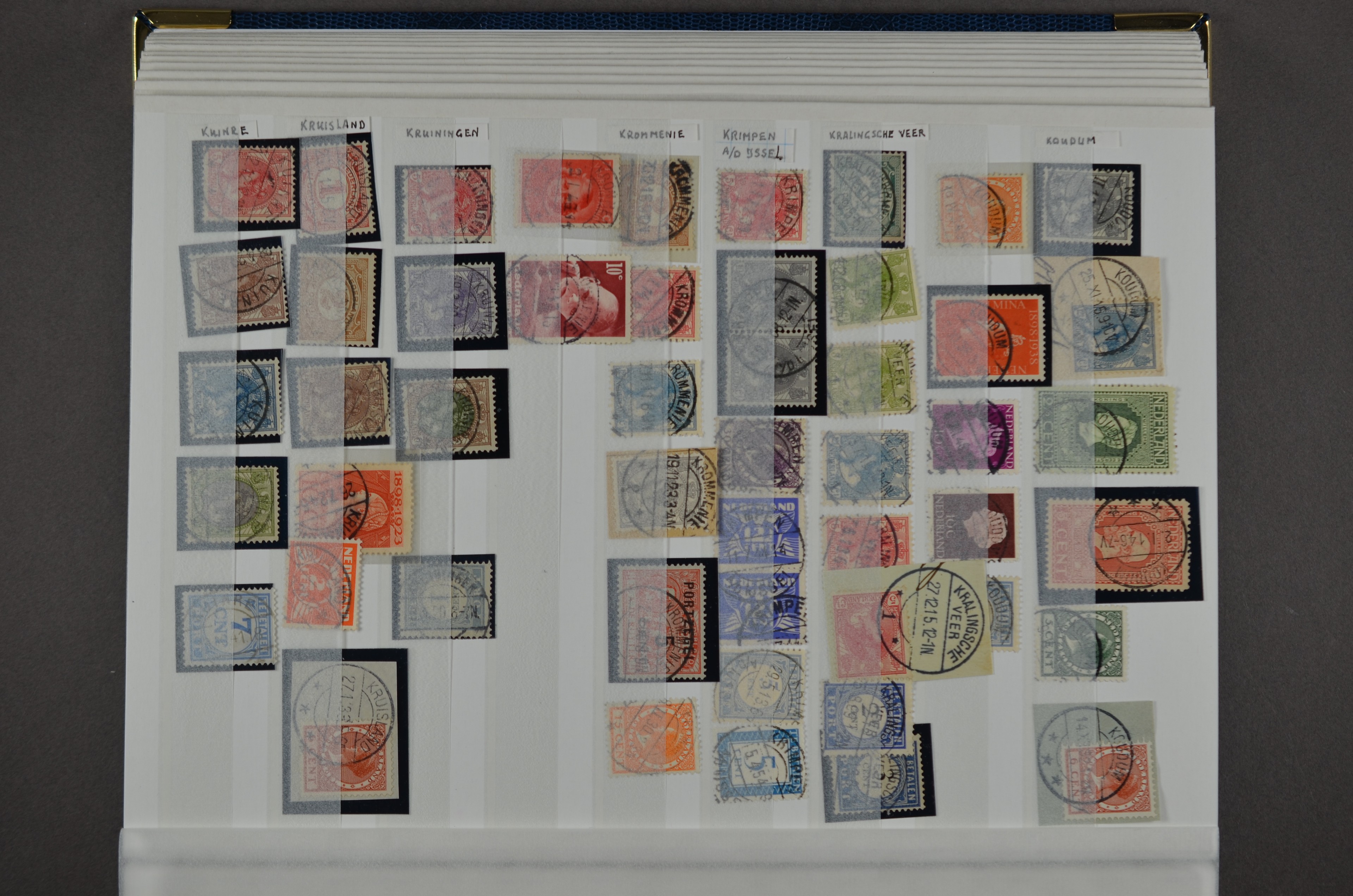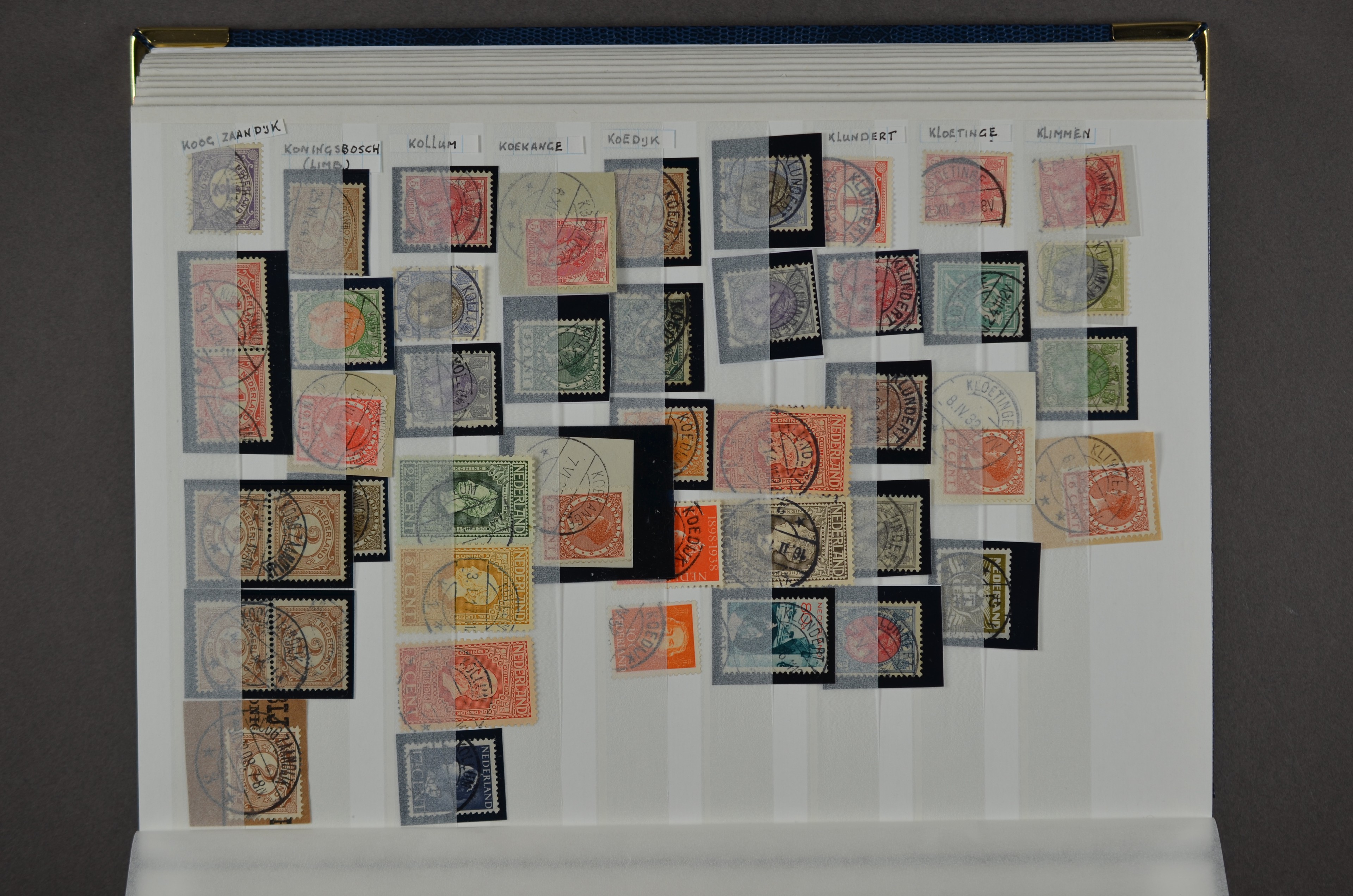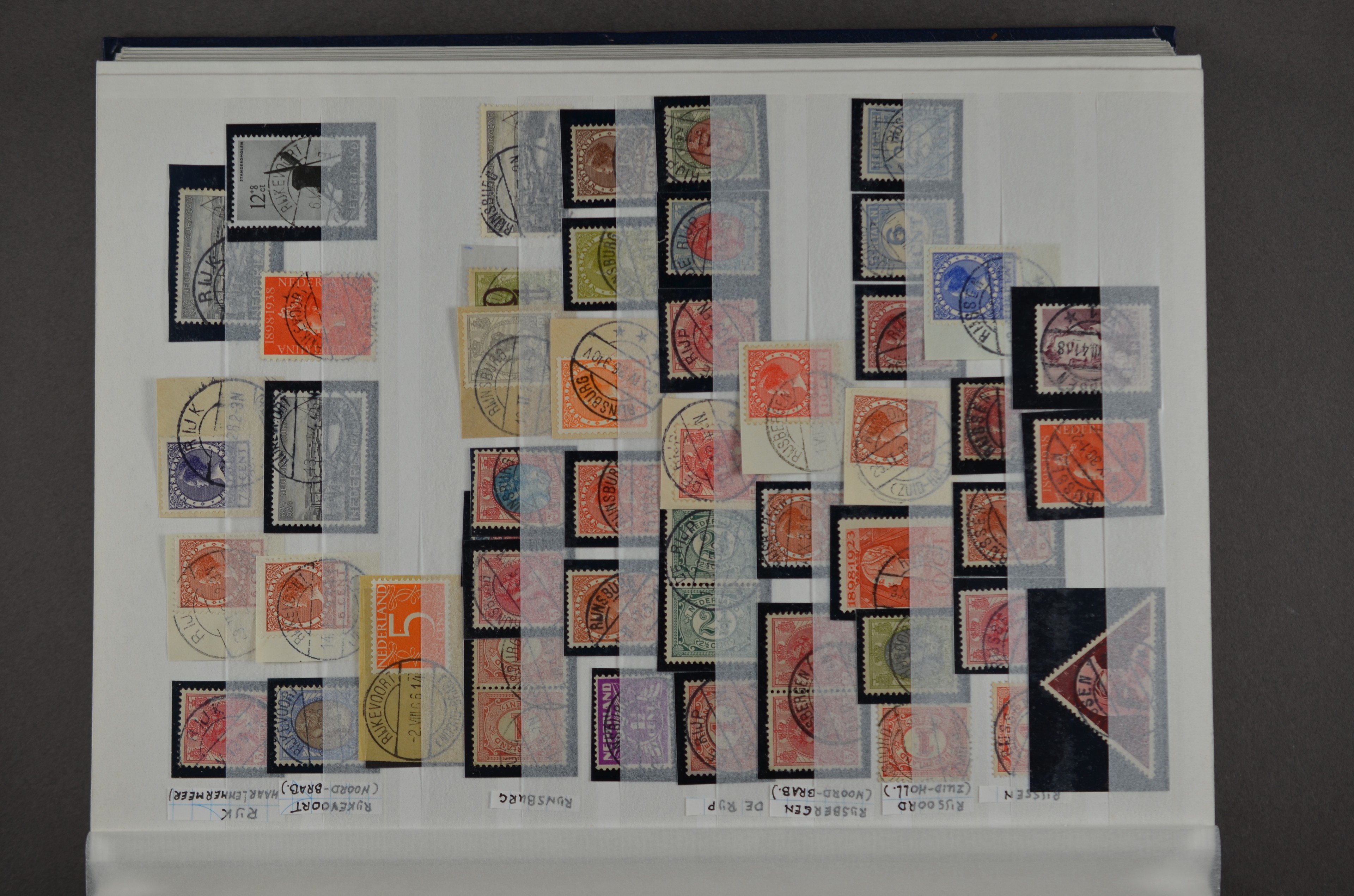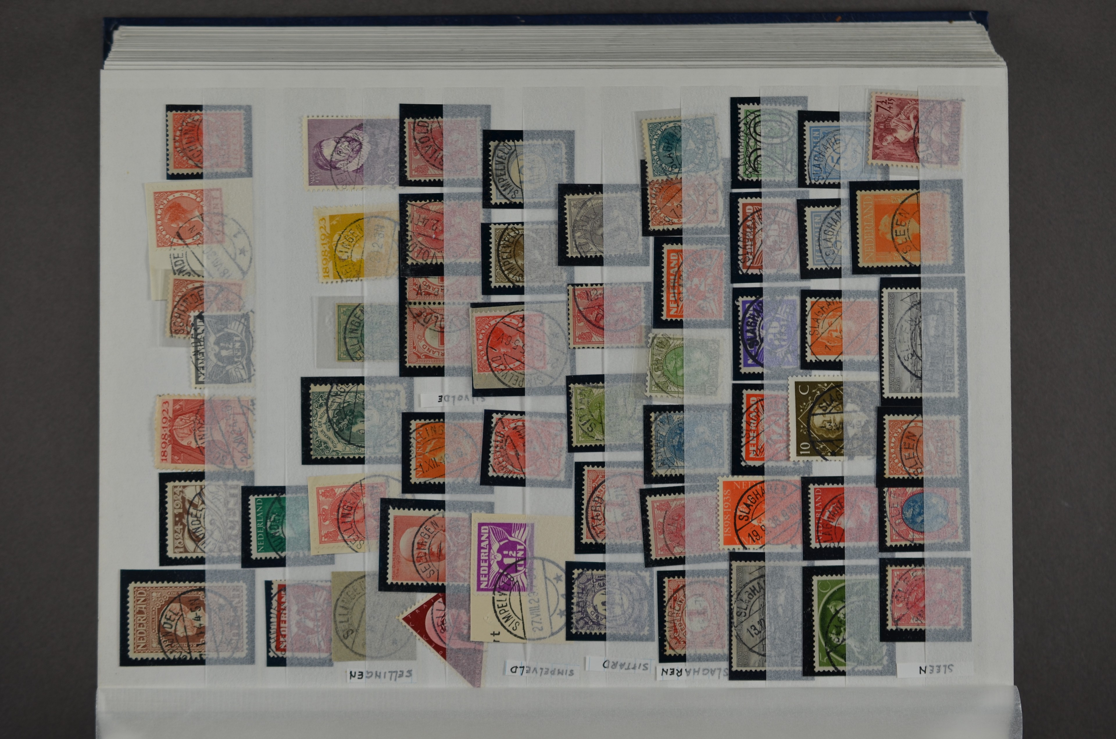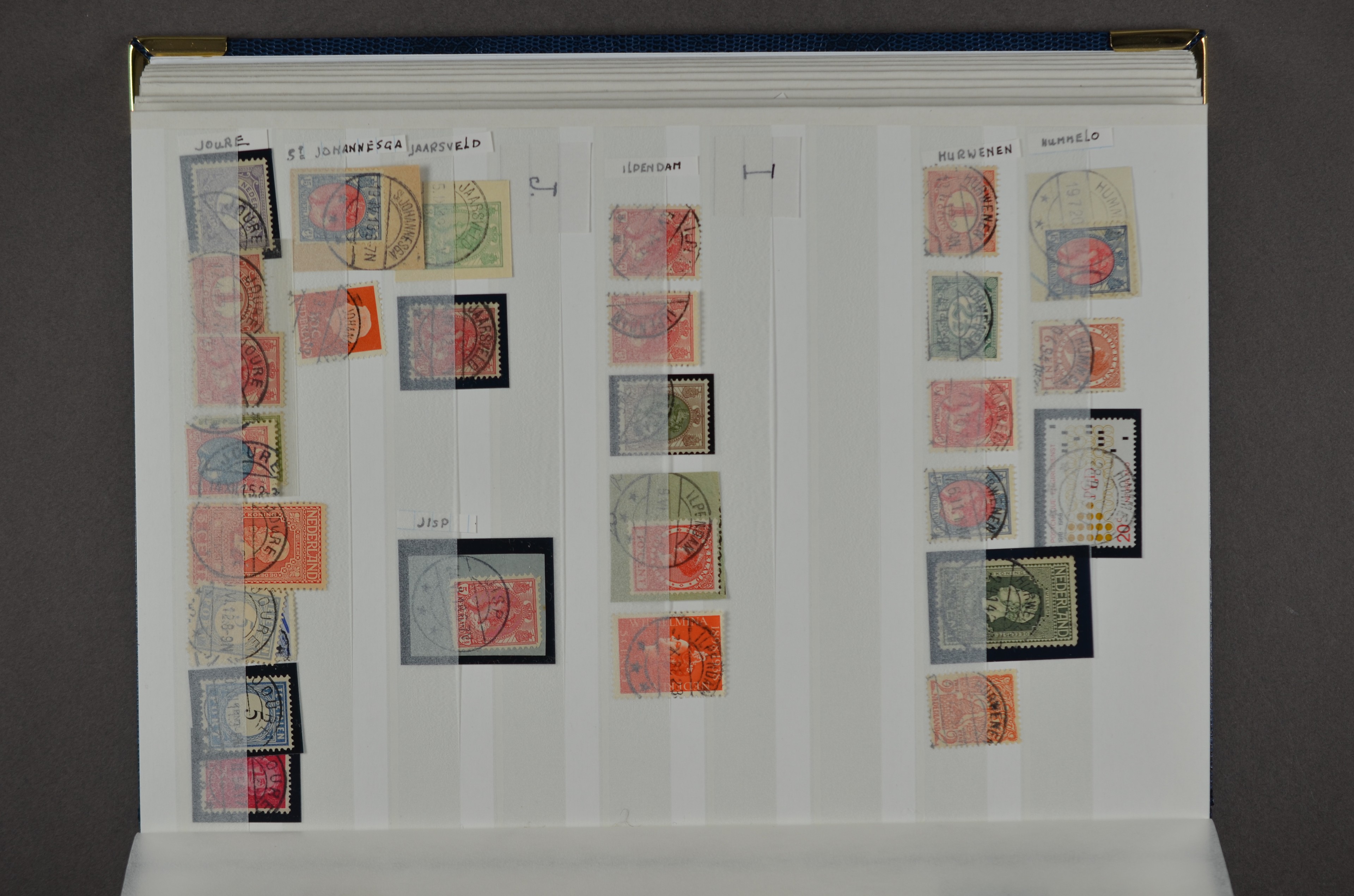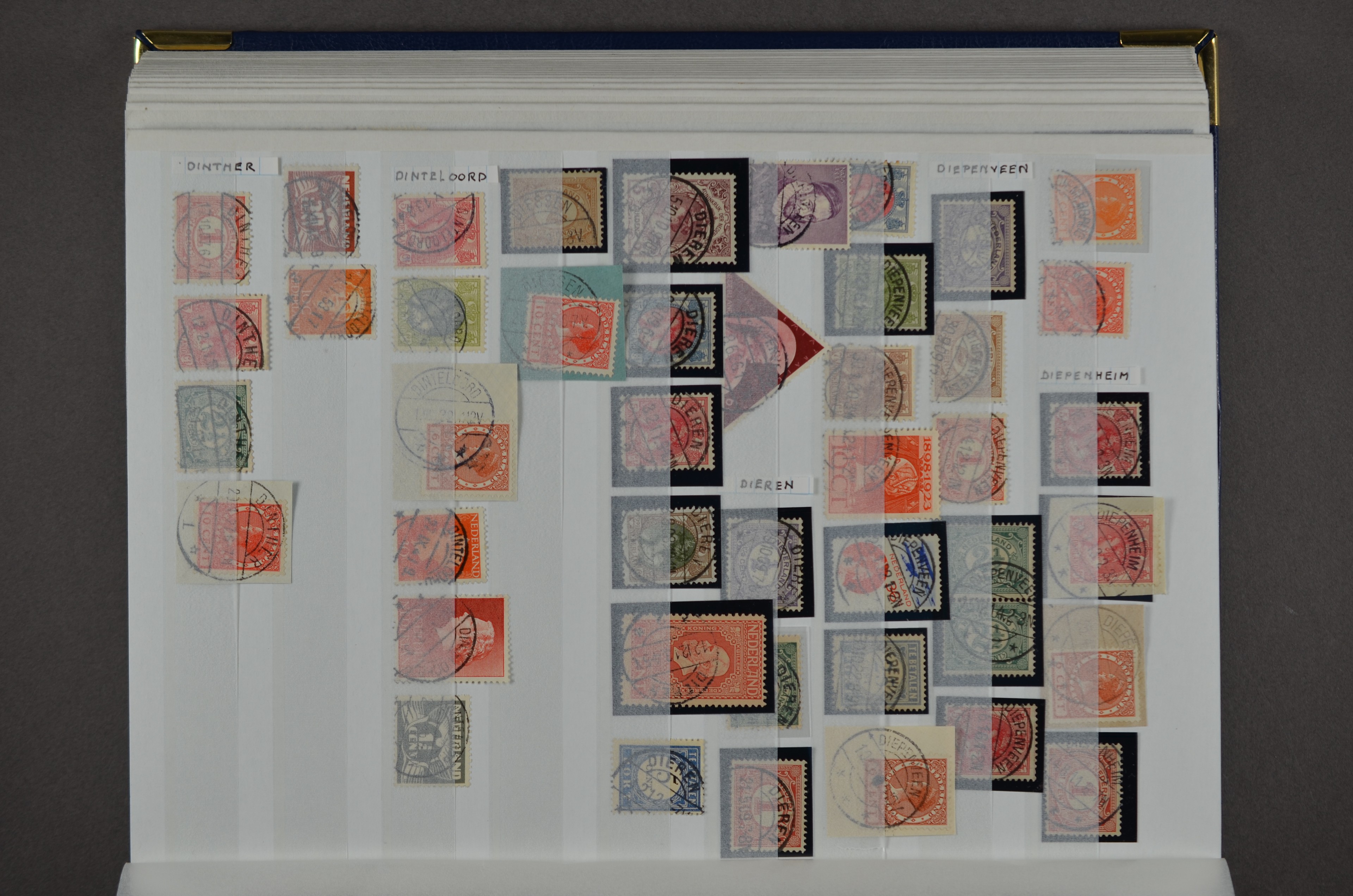 LANGEBALKSTEMPELS, uit Velling type 134/155 op vele, vele honderden losse zegels, merendeels volledige afstempelingen. Het lijken zogenaamd gewone, (semi-)moderne stempels maar in een dergelijke omvang, met zo veel kleine kantoren en in zulke uitzonderlijke kwaliteit nauwelijks meer bijeen te brengen. Voor de liefhebber, op alfabetische volgorde gesorteerd in 3 dikke insteekboeken vol verzamelplezier!