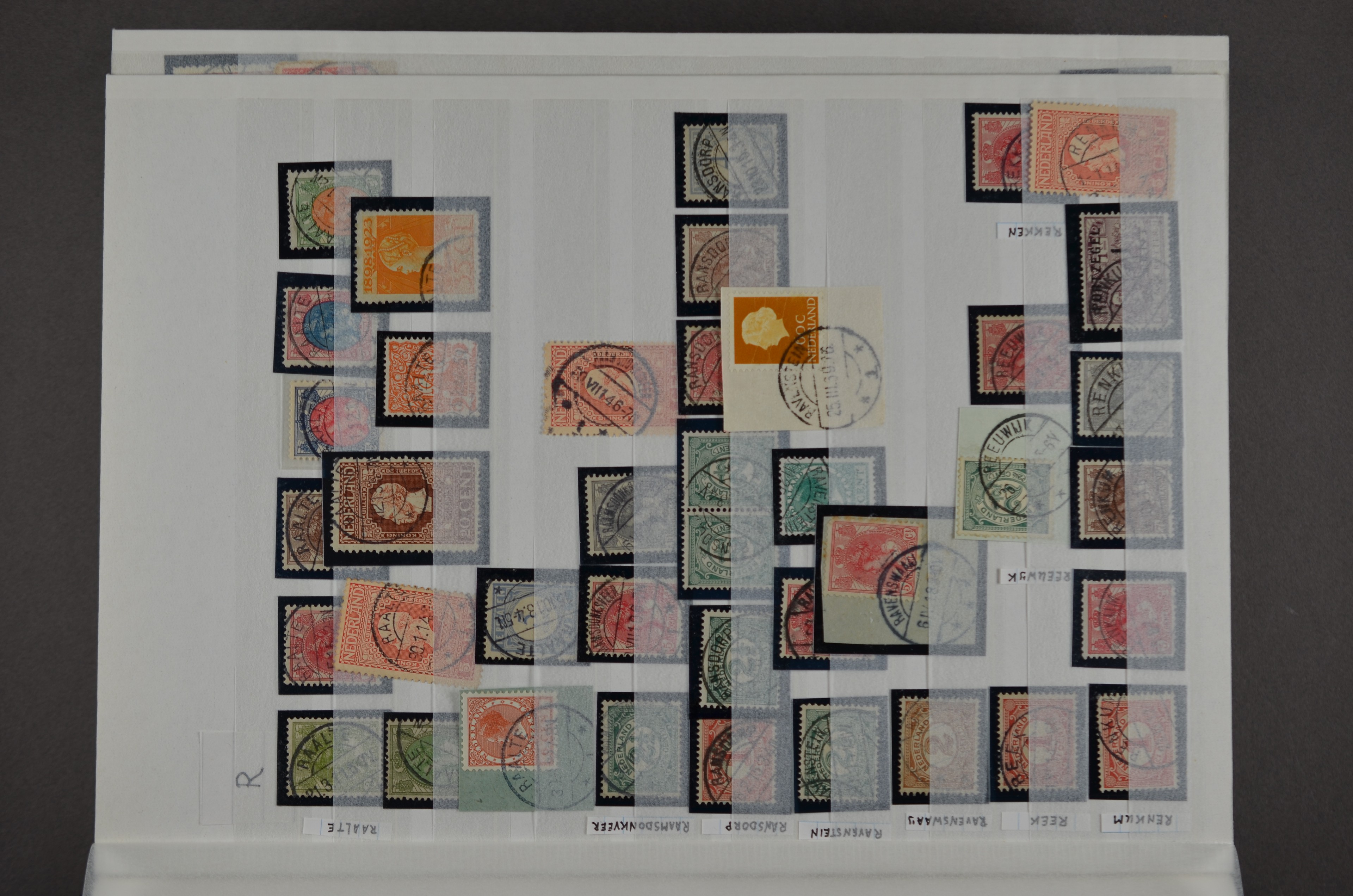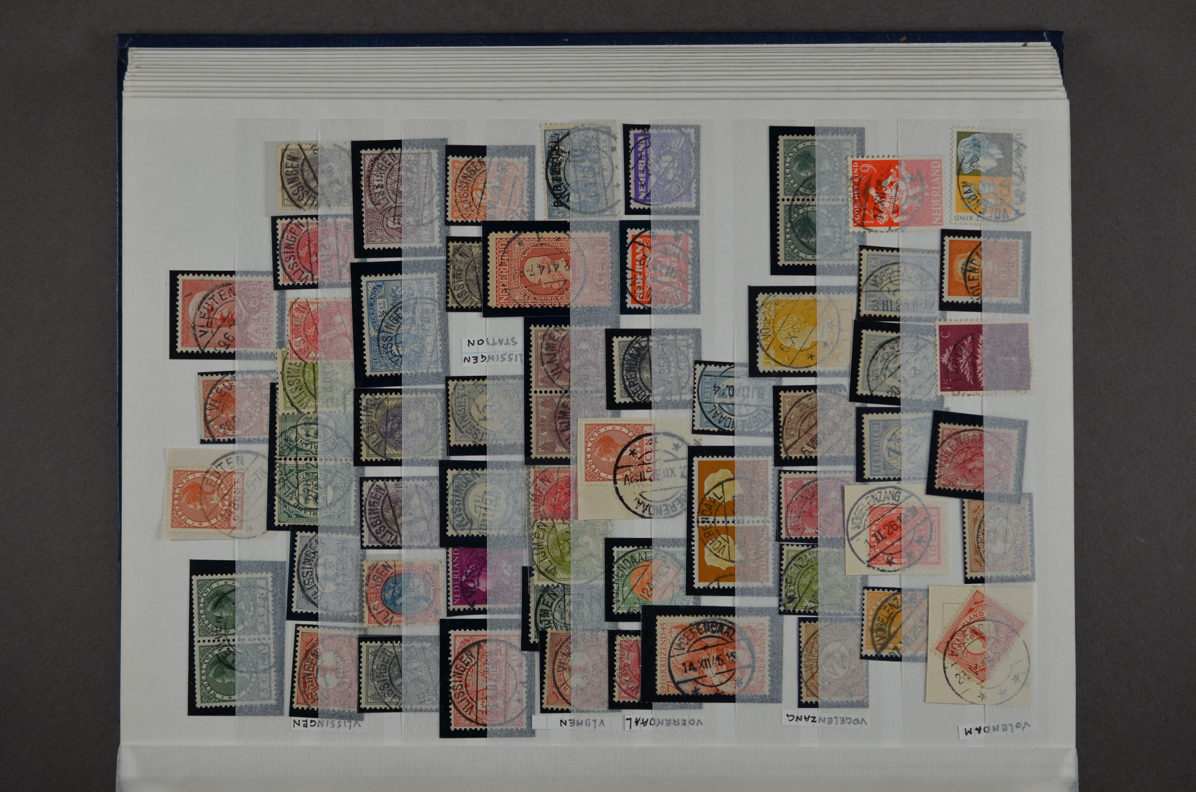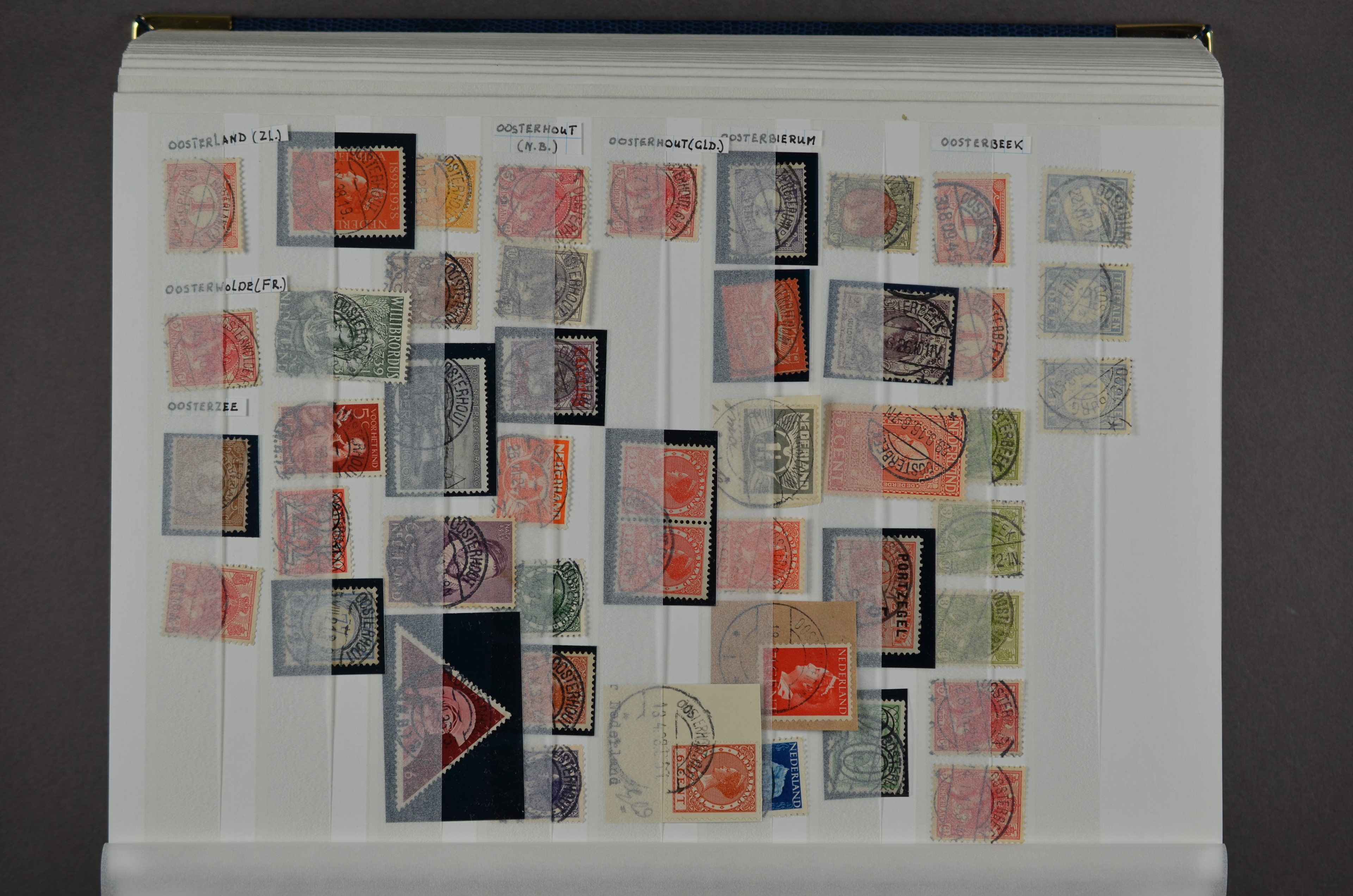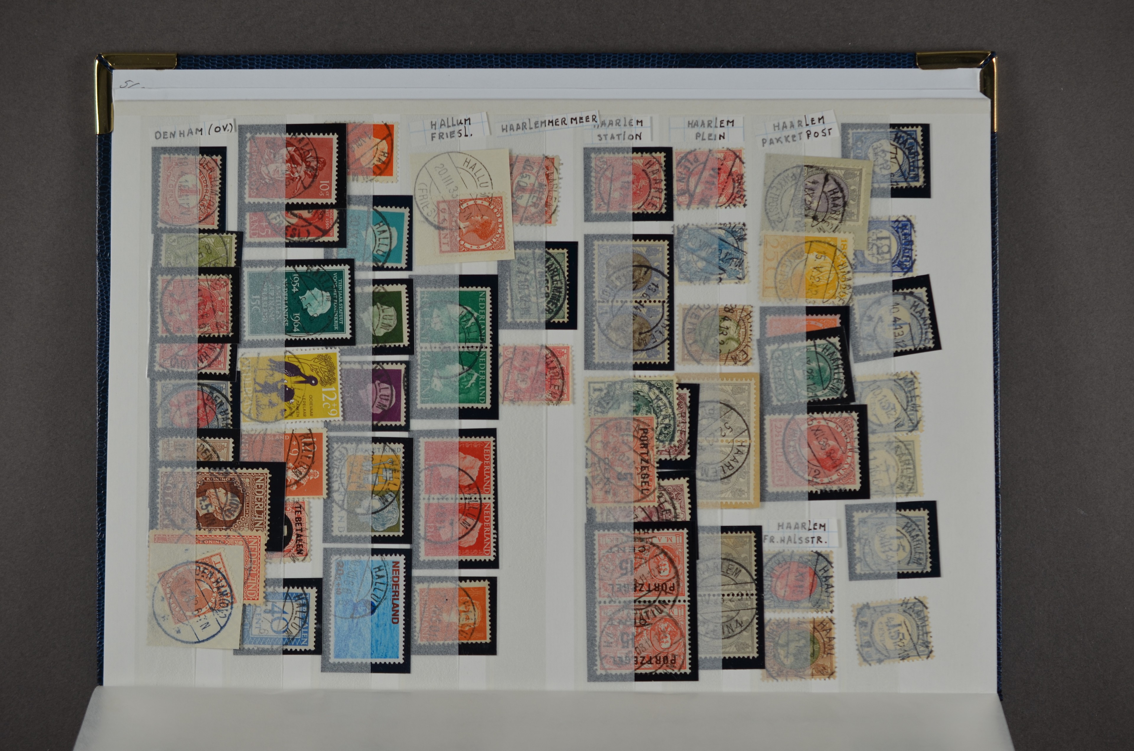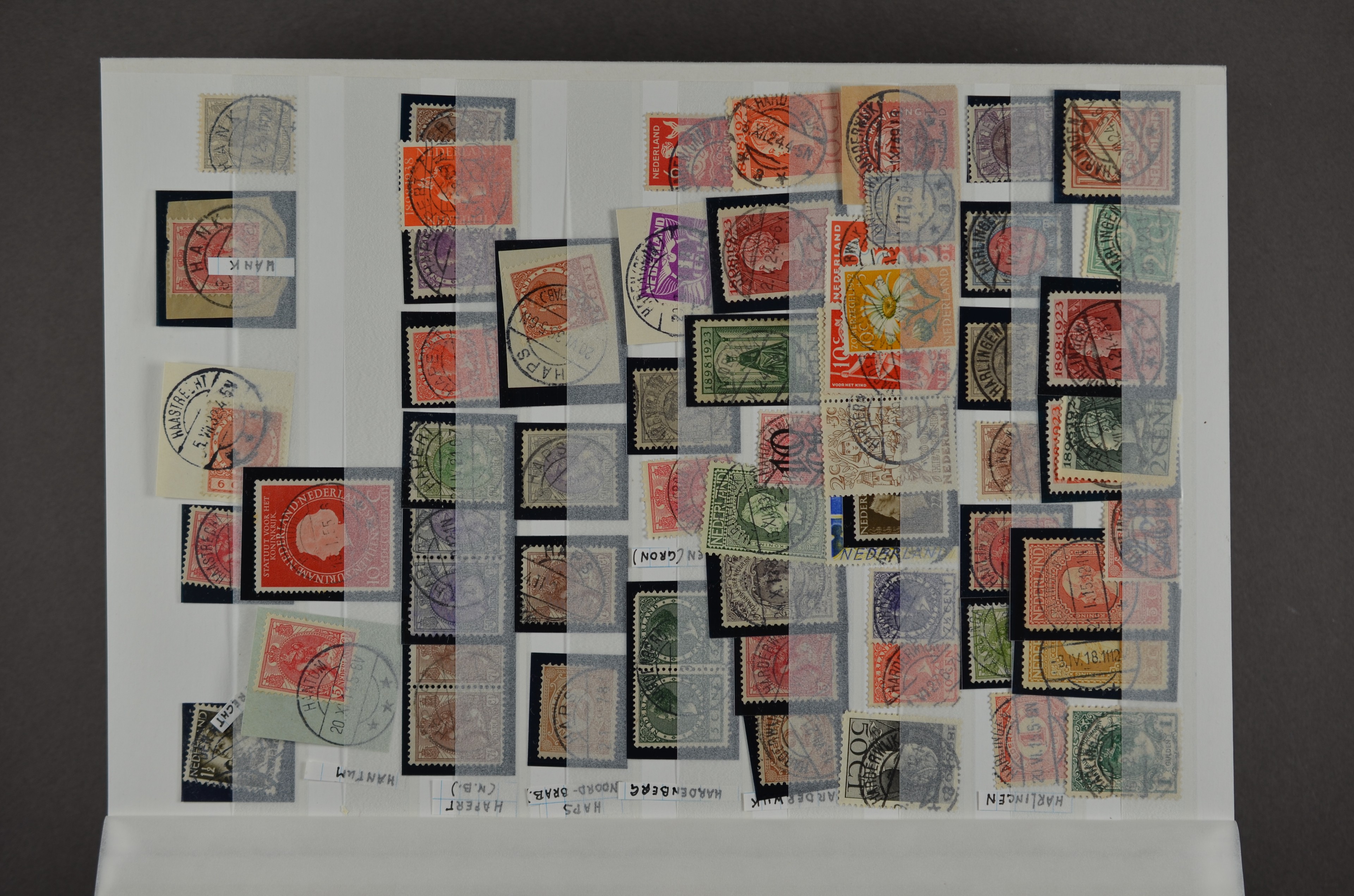 LANGEBALKSTEMPELS, uit Velling type 134/155 op vele, vele honderden losse zegels, merendeels volledige afstempelingen. Het lijken zogenaamd gewone, (semi-)moderne stempels maar in een dergelijke omvang, met zo veel kleine kantoren en in zulke uitzonderlijke kwaliteit nauwelijks meer bijeen te brengen. Voor de liefhebber, op alfabetische volgorde gesorteerd in 3 dikke insteekboeken vol verzamelplezier!