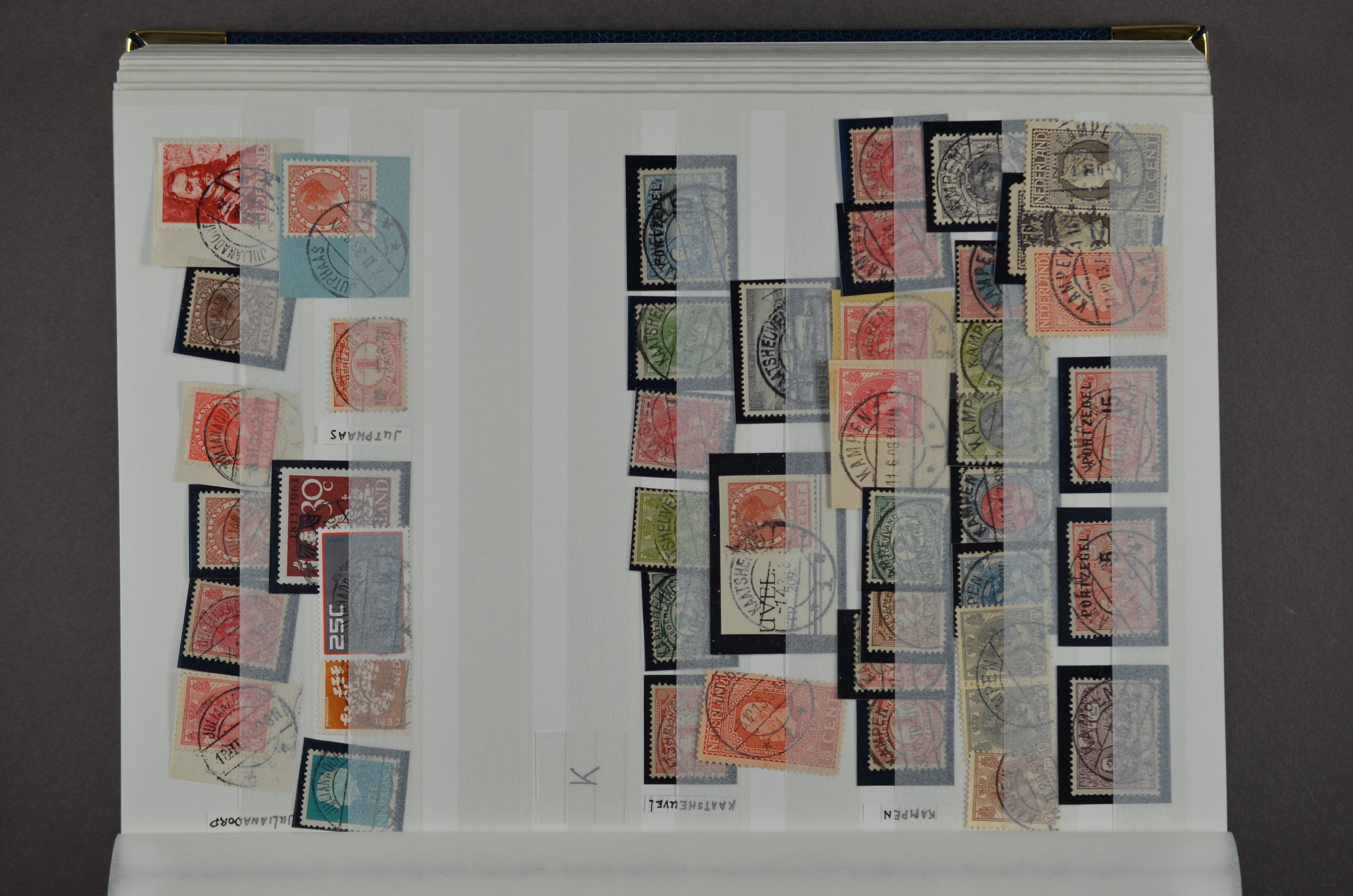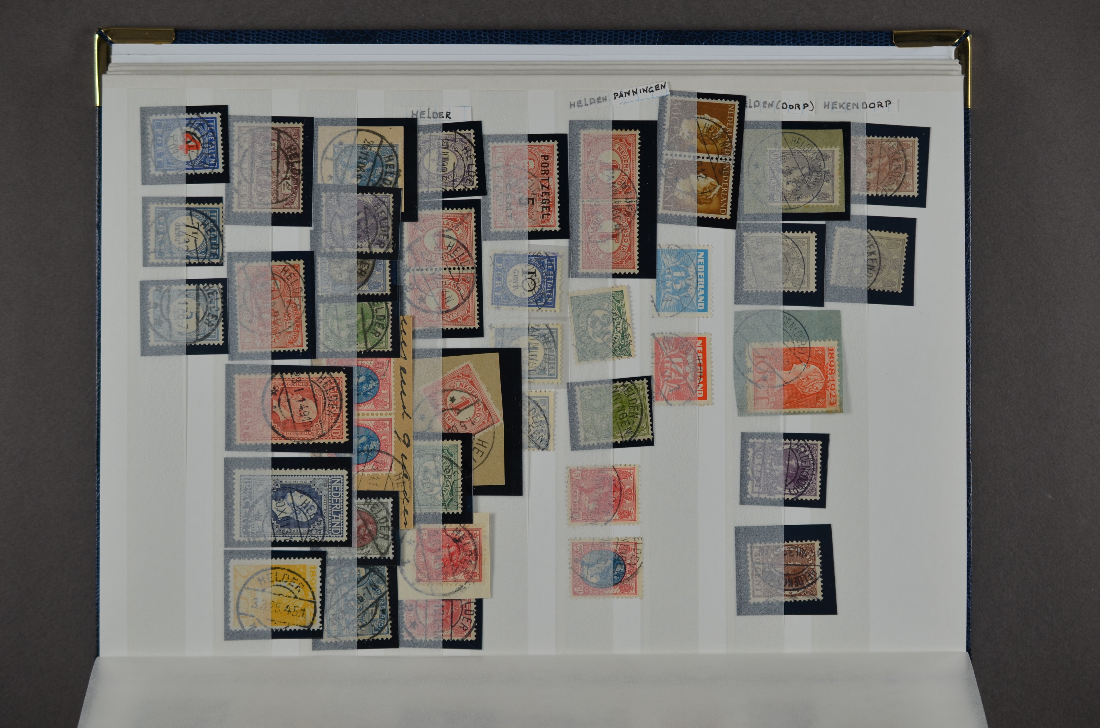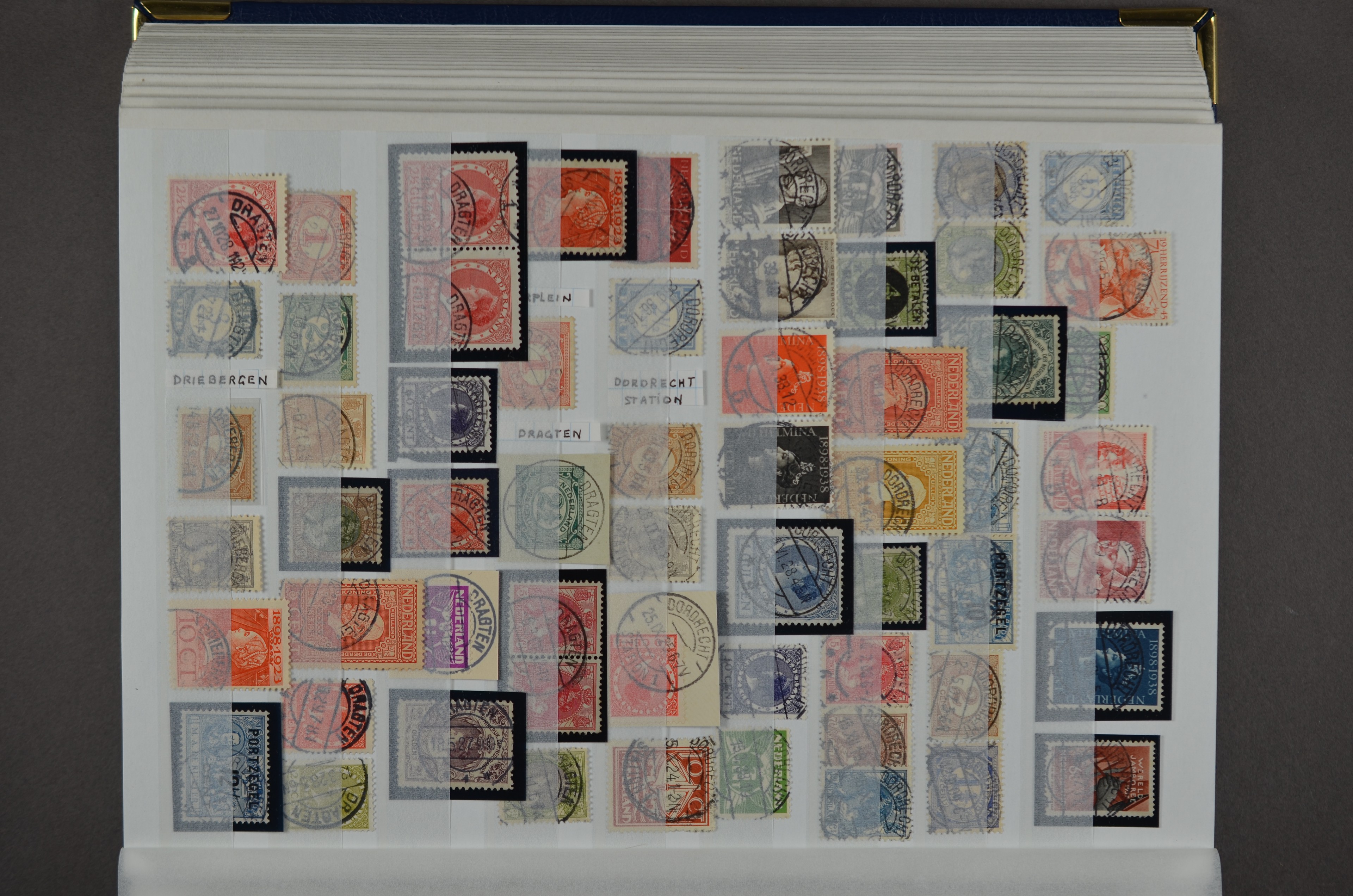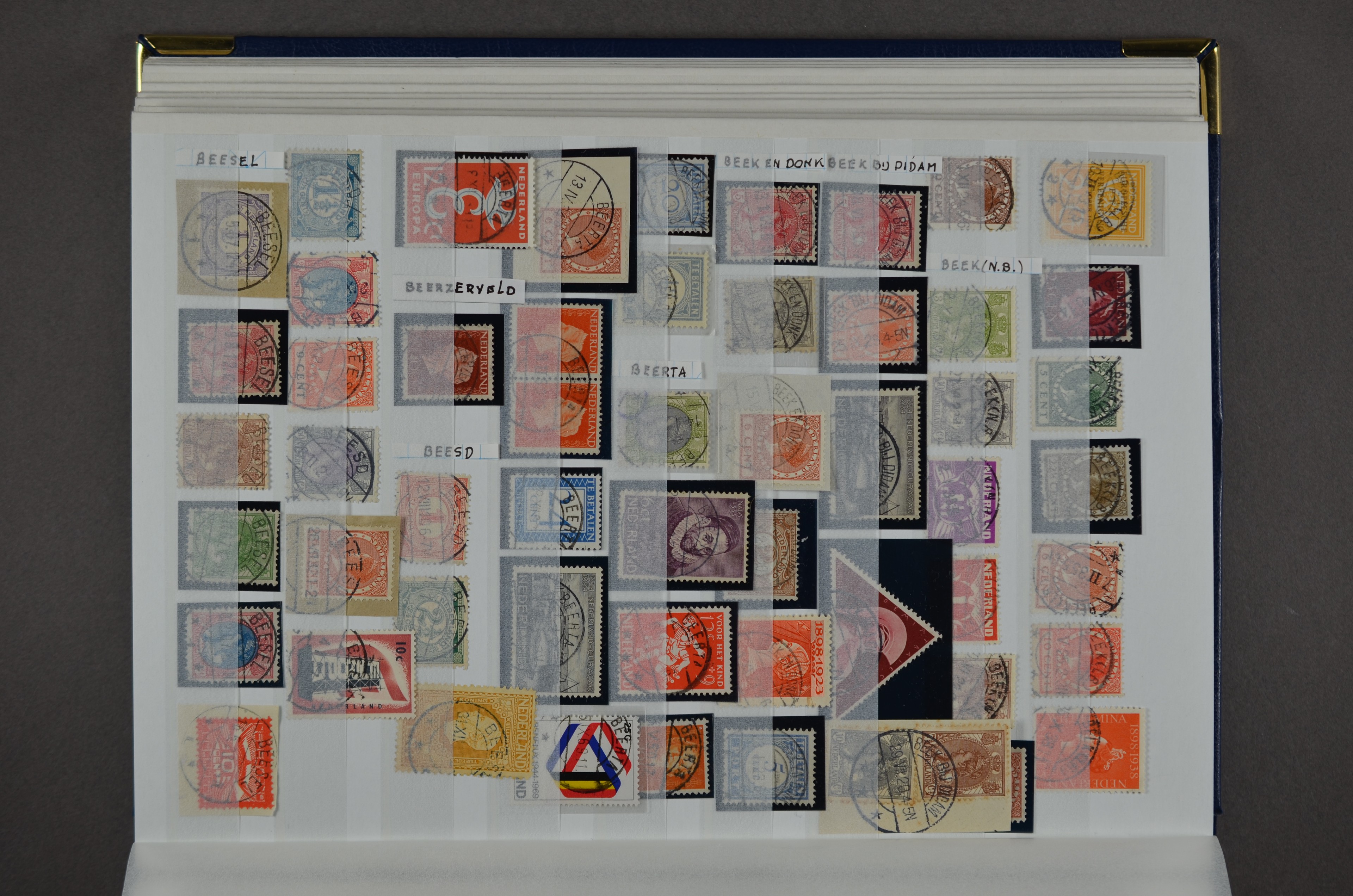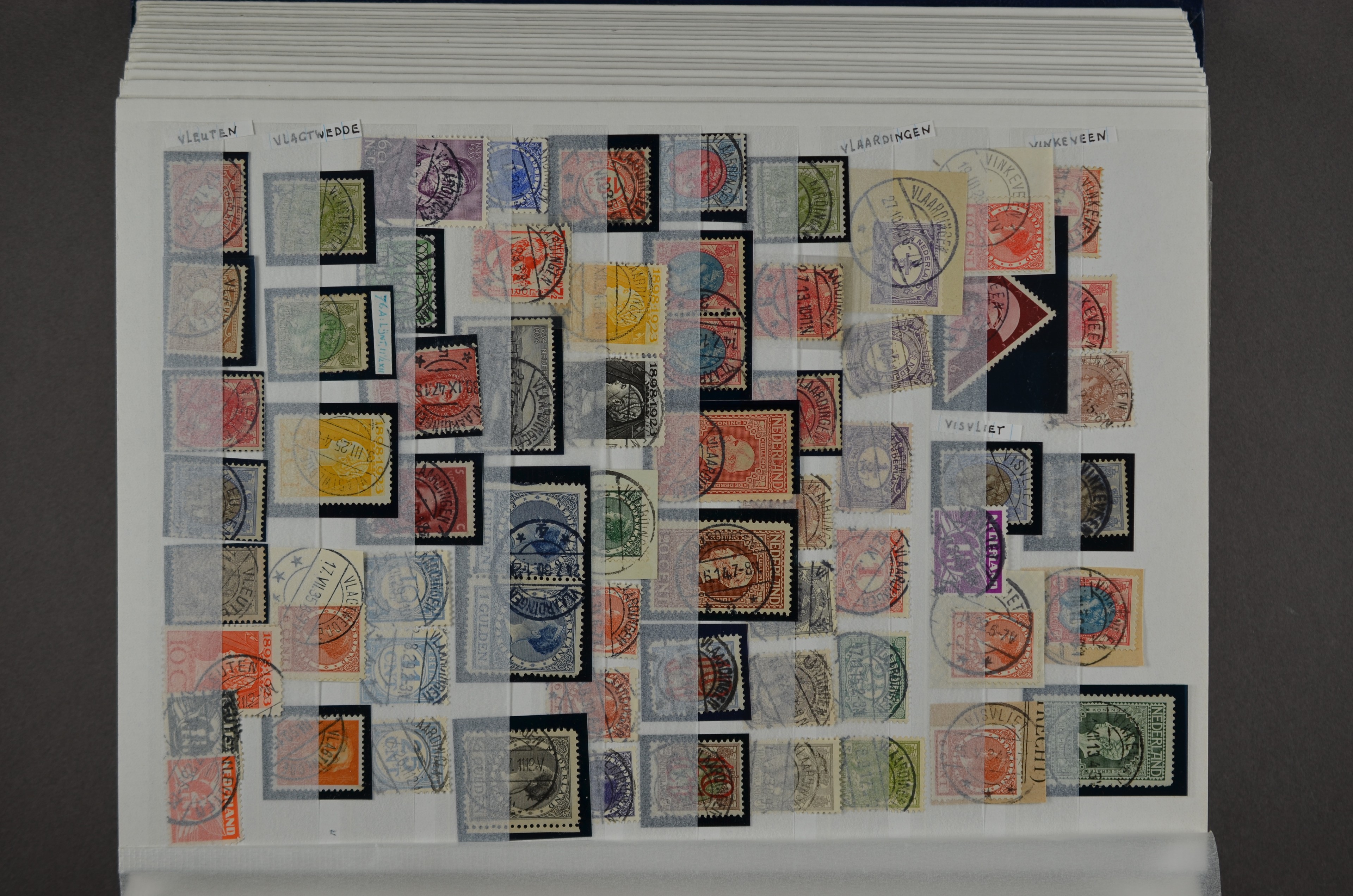 LANGEBALKSTEMPELS, uit Velling type 134/155 op vele, vele honderden losse zegels, merendeels volledige afstempelingen. Het lijken zogenaamd gewone, (semi-)moderne stempels maar in een dergelijke omvang, met zo veel kleine kantoren en in zulke uitzonderlijke kwaliteit nauwelijks meer bijeen te brengen. Voor de liefhebber, op alfabetische volgorde gesorteerd in 3 dikke insteekboeken vol verzamelplezier!