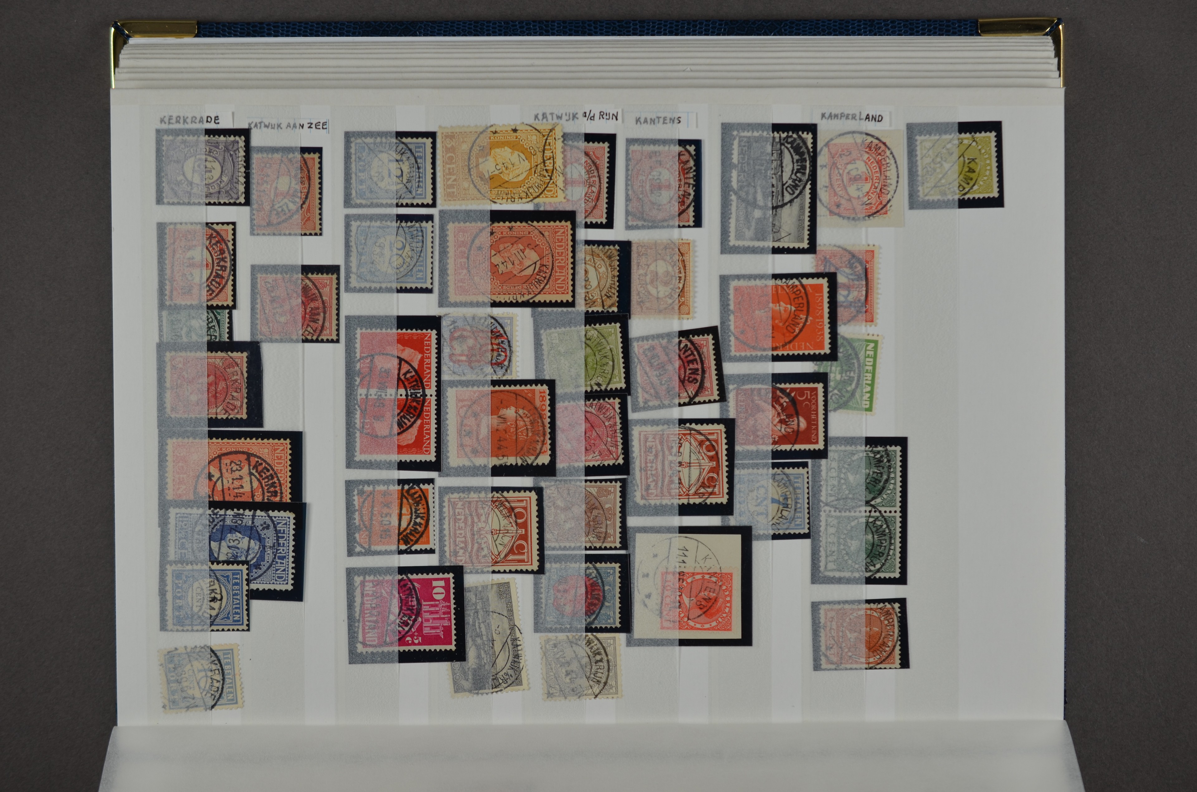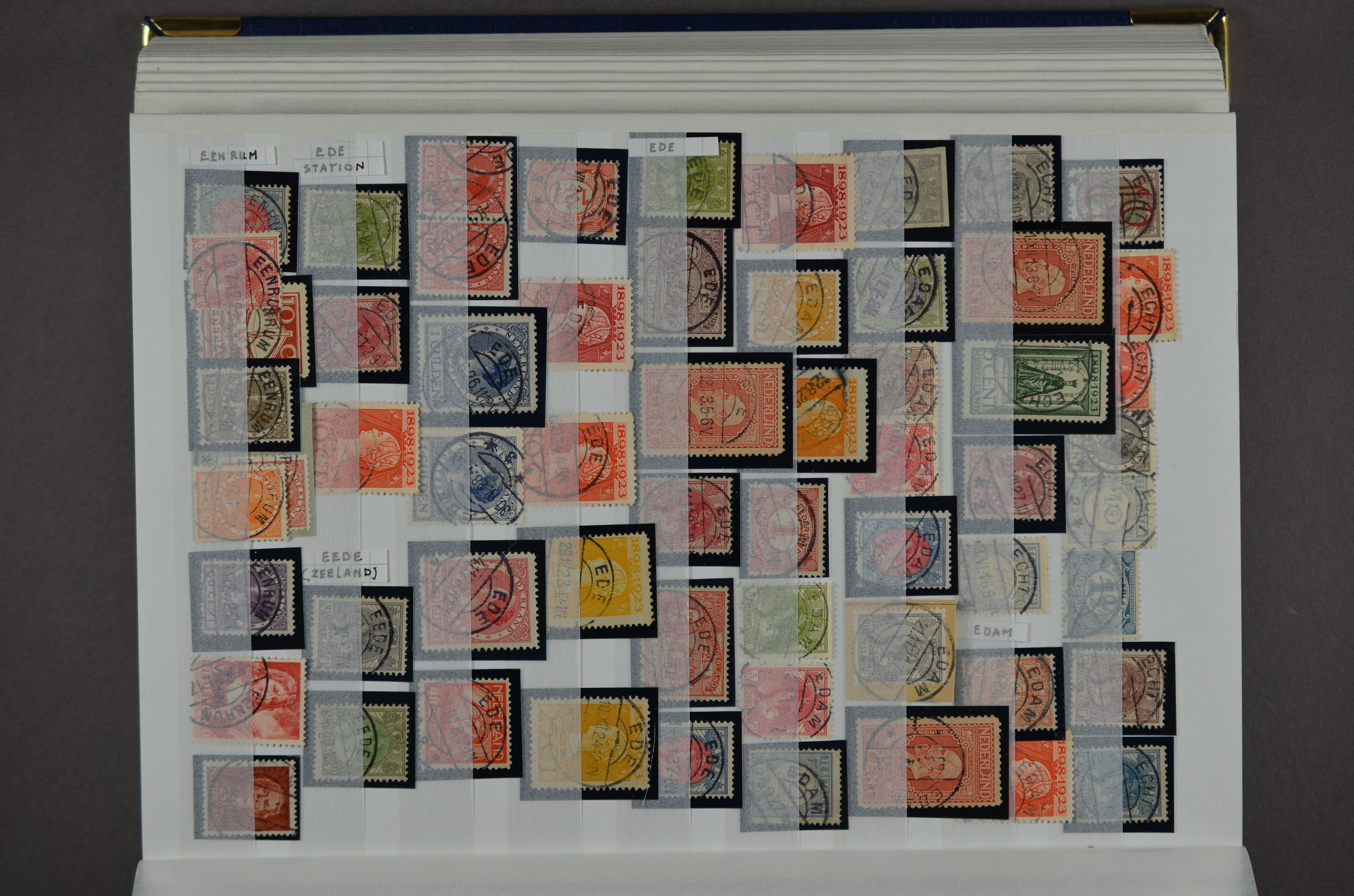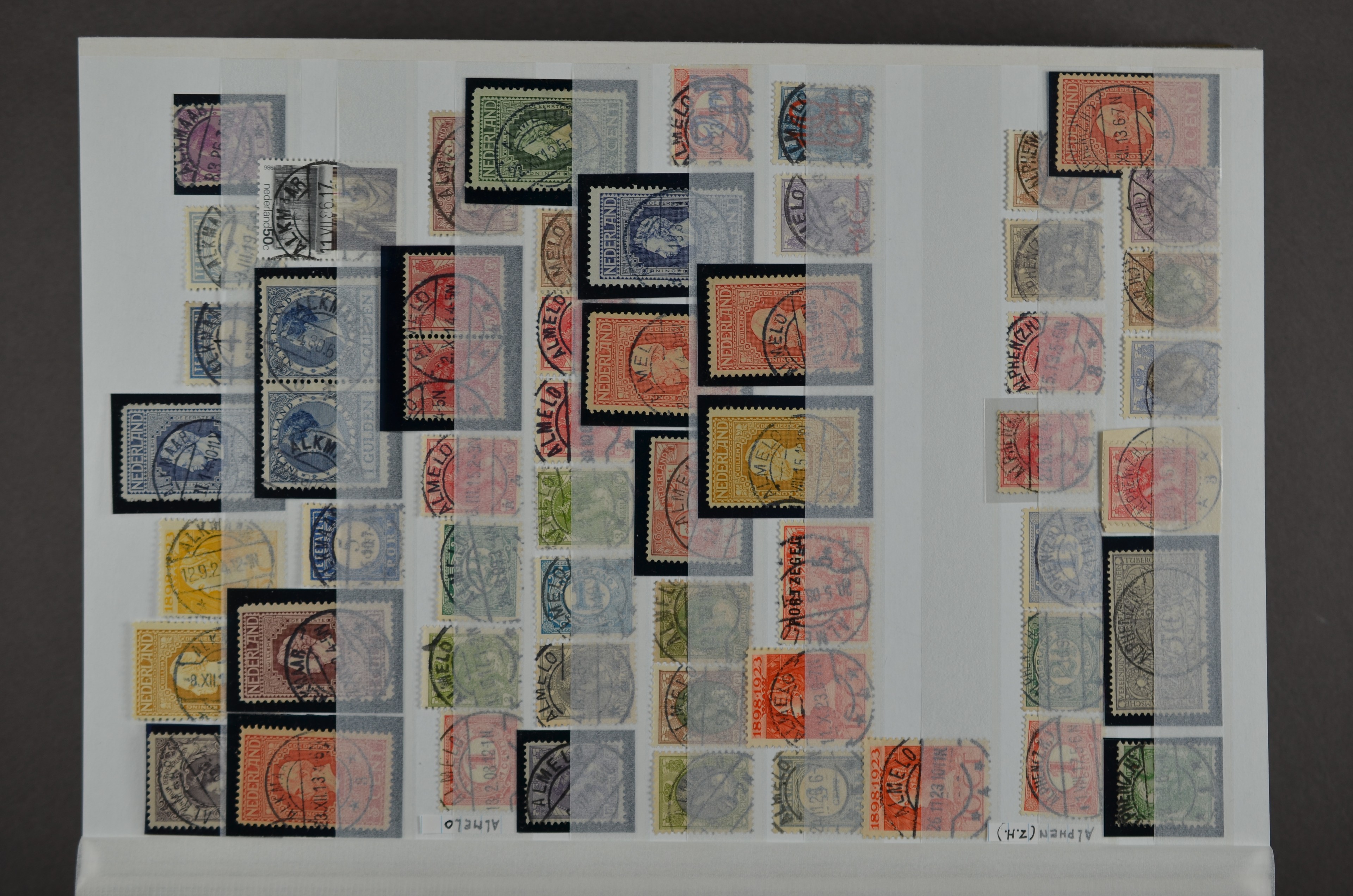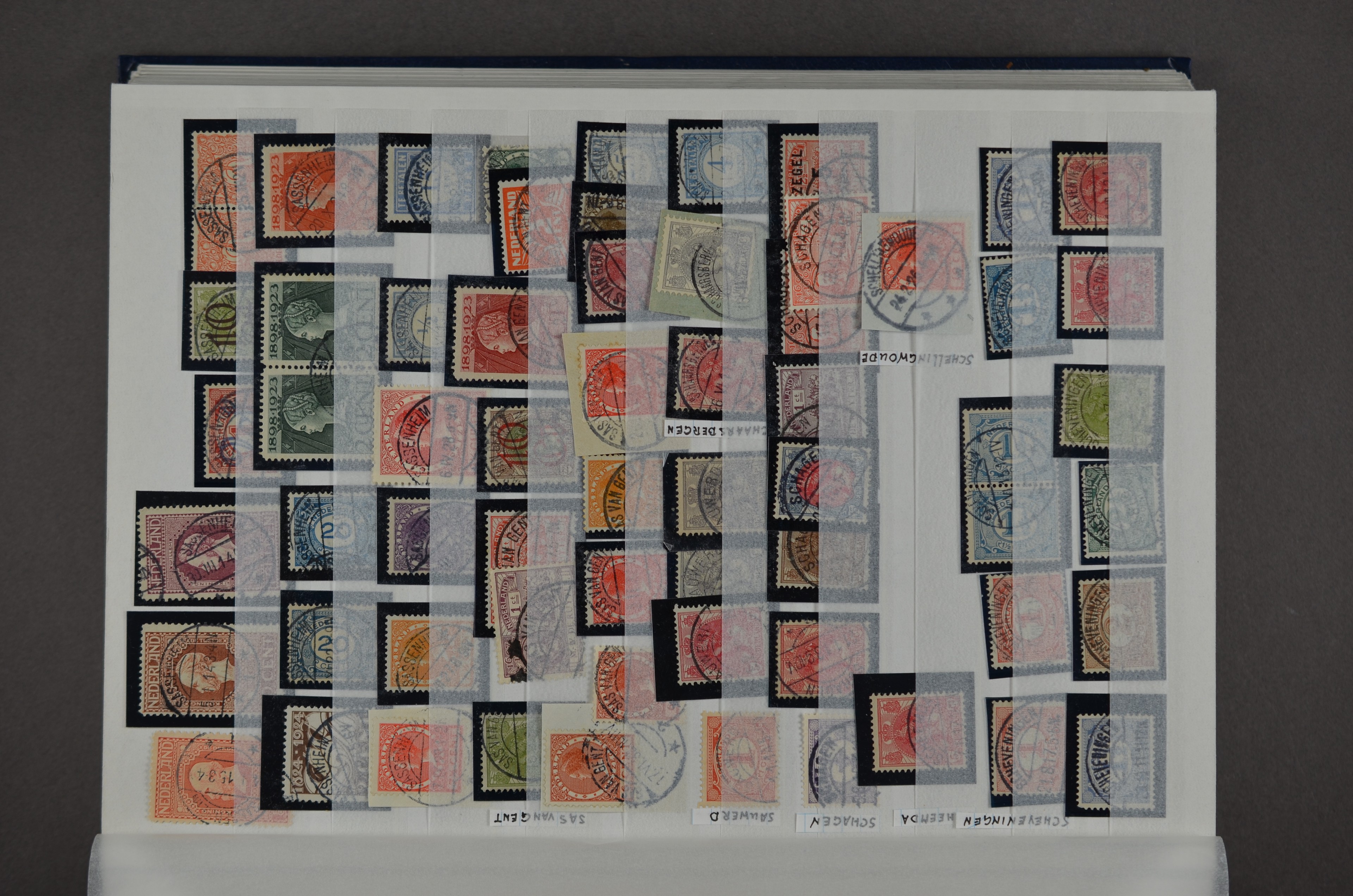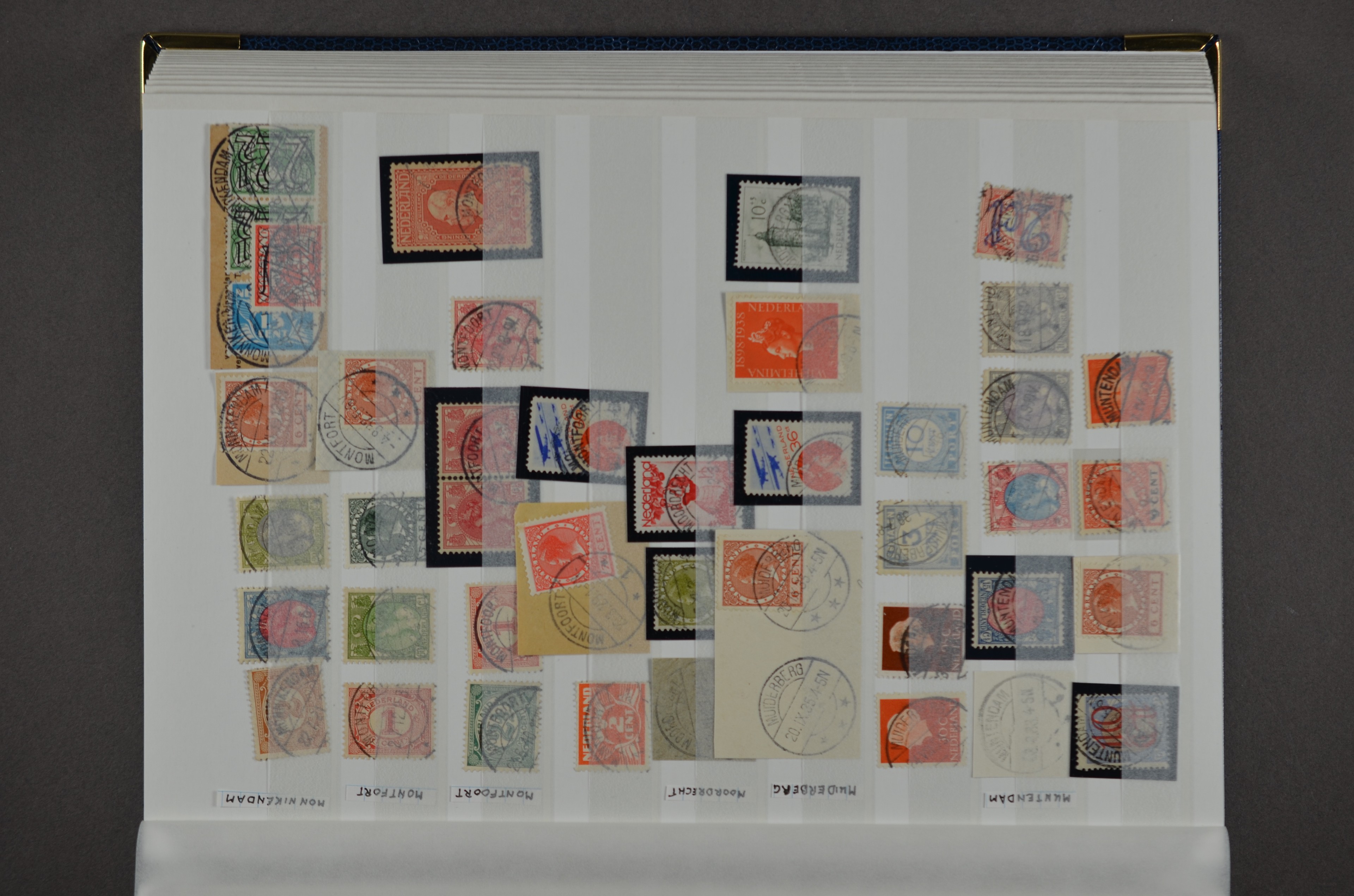 LANGEBALKSTEMPELS, uit Velling type 134/155 op vele, vele honderden losse zegels, merendeels volledige afstempelingen. Het lijken zogenaamd gewone, (semi-)moderne stempels maar in een dergelijke omvang, met zo veel kleine kantoren en in zulke uitzonderlijke kwaliteit nauwelijks meer bijeen te brengen. Voor de liefhebber, op alfabetische volgorde gesorteerd in 3 dikke insteekboeken vol verzamelplezier!