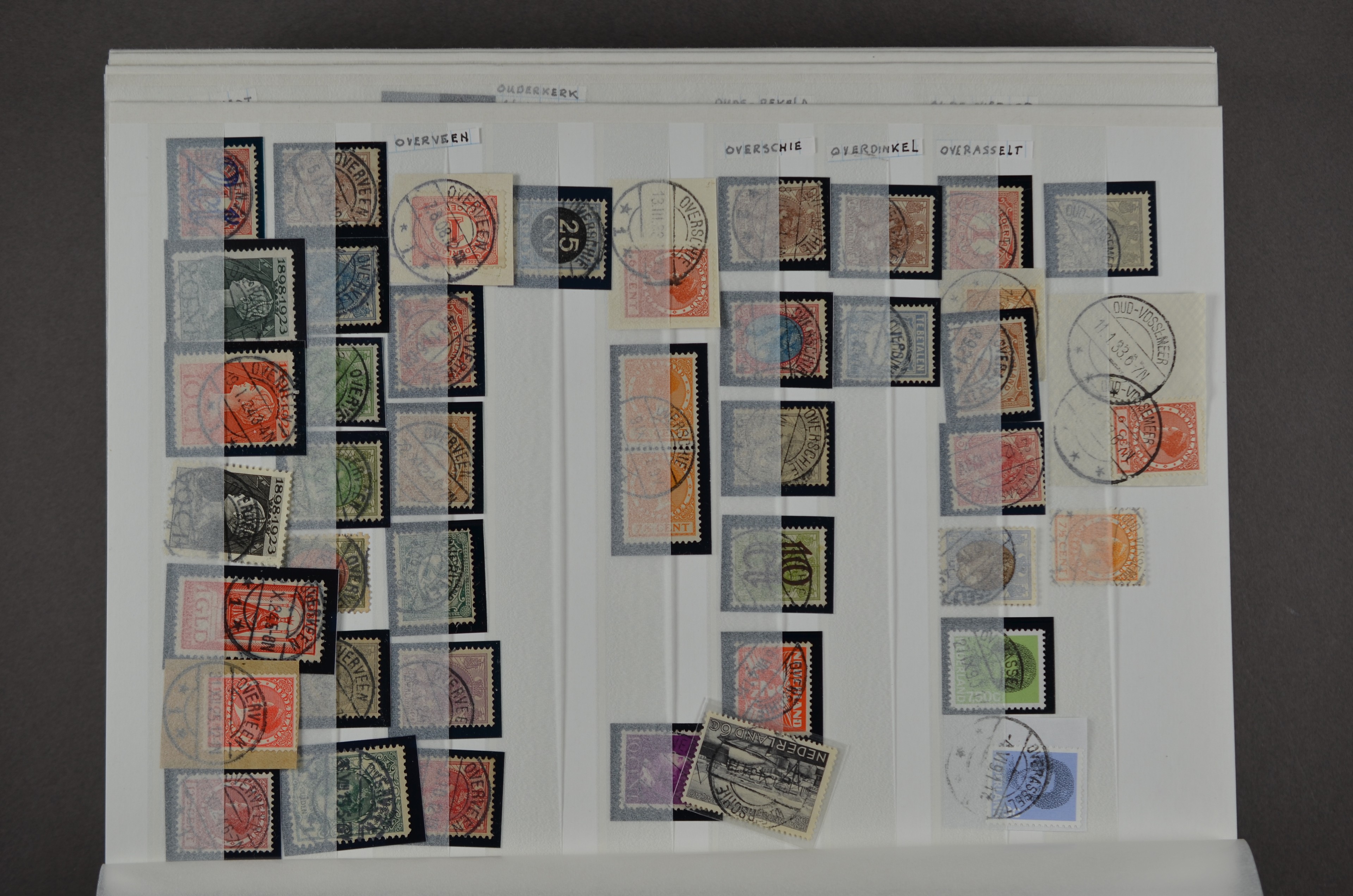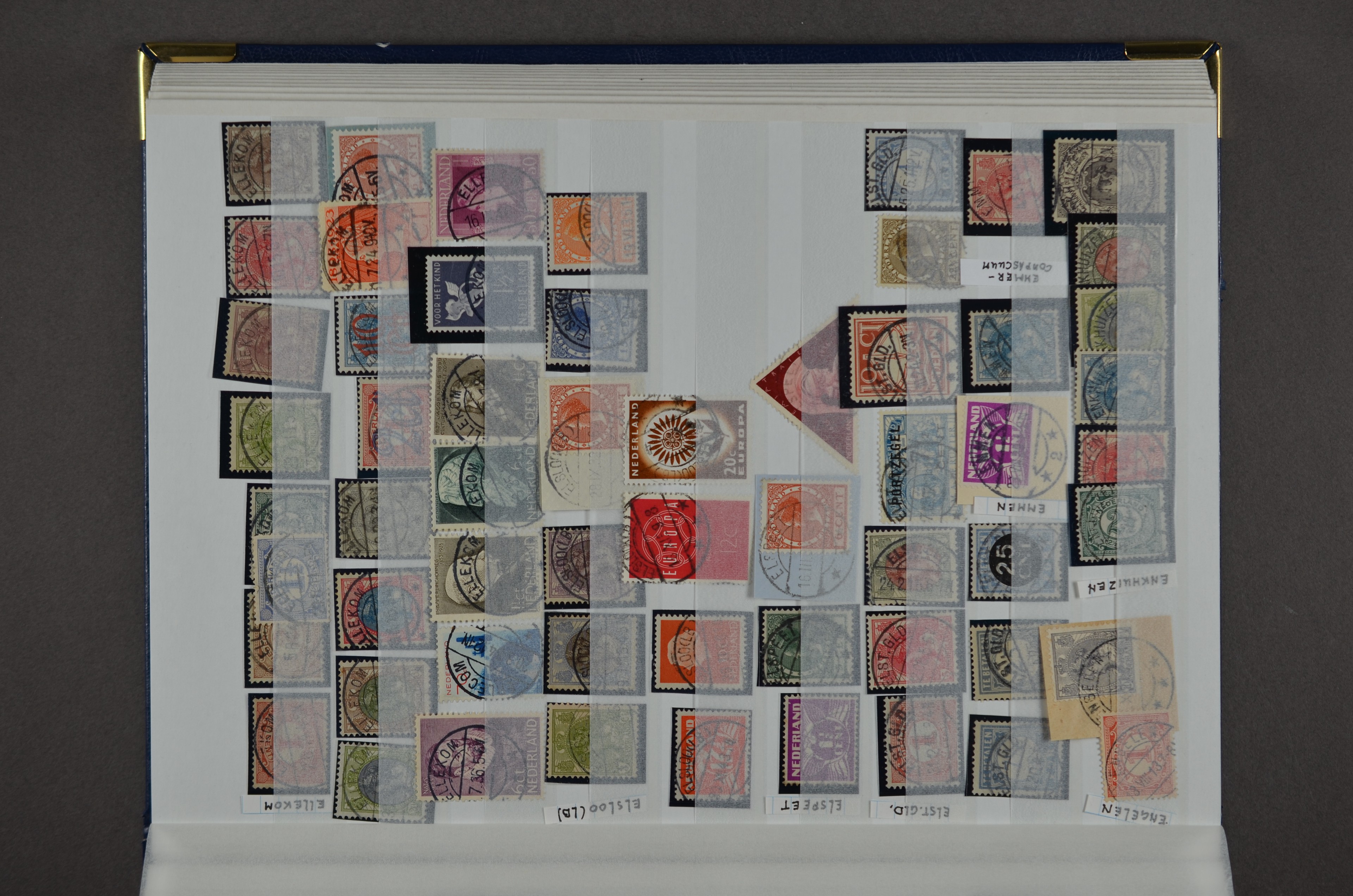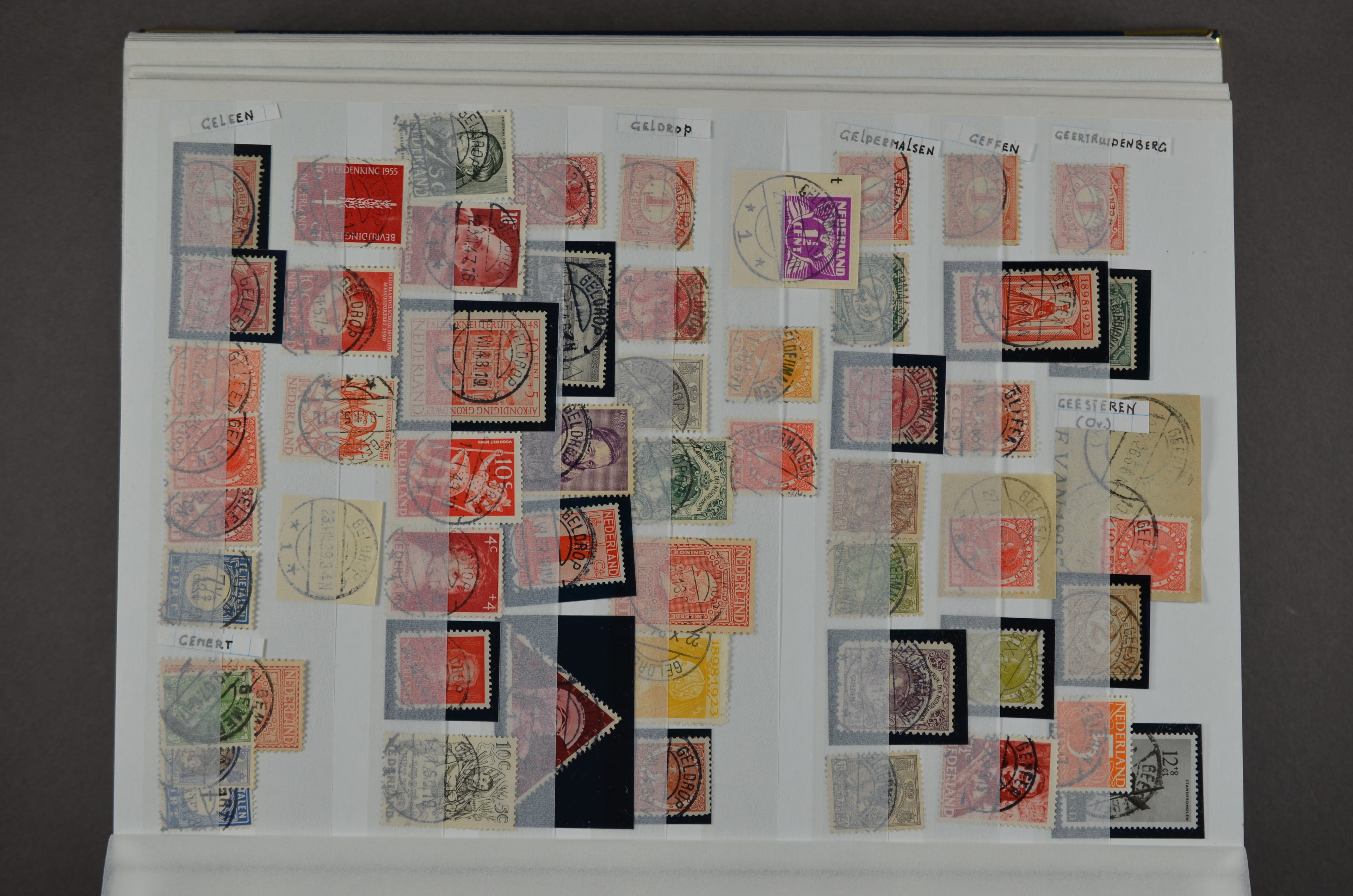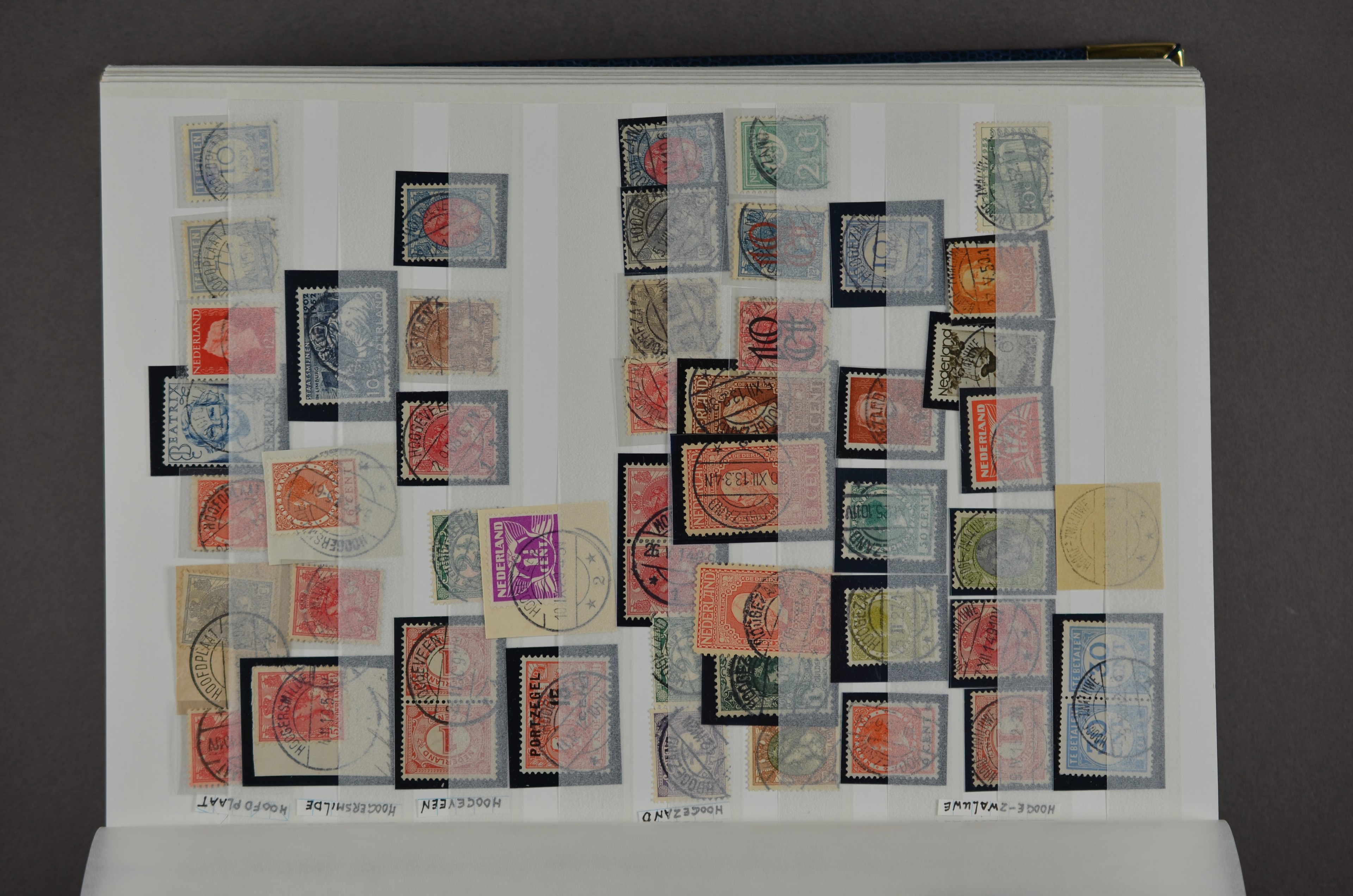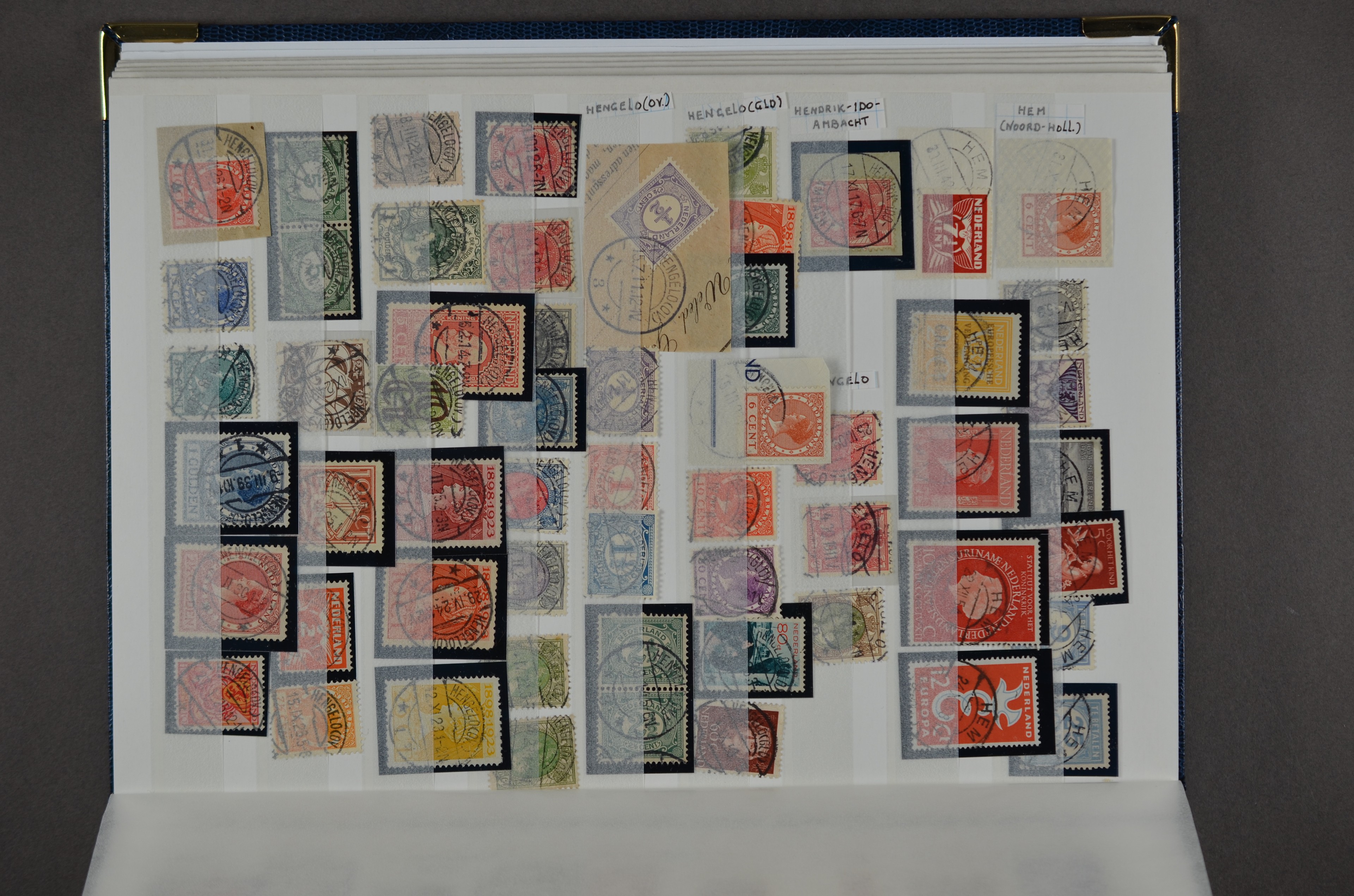 LANGEBALKSTEMPELS, uit Velling type 134/155 op vele, vele honderden losse zegels, merendeels volledige afstempelingen. Het lijken zogenaamd gewone, (semi-)moderne stempels maar in een dergelijke omvang, met zo veel kleine kantoren en in zulke uitzonderlijke kwaliteit nauwelijks meer bijeen te brengen. Voor de liefhebber, op alfabetische volgorde gesorteerd in 3 dikke insteekboeken vol verzamelplezier!