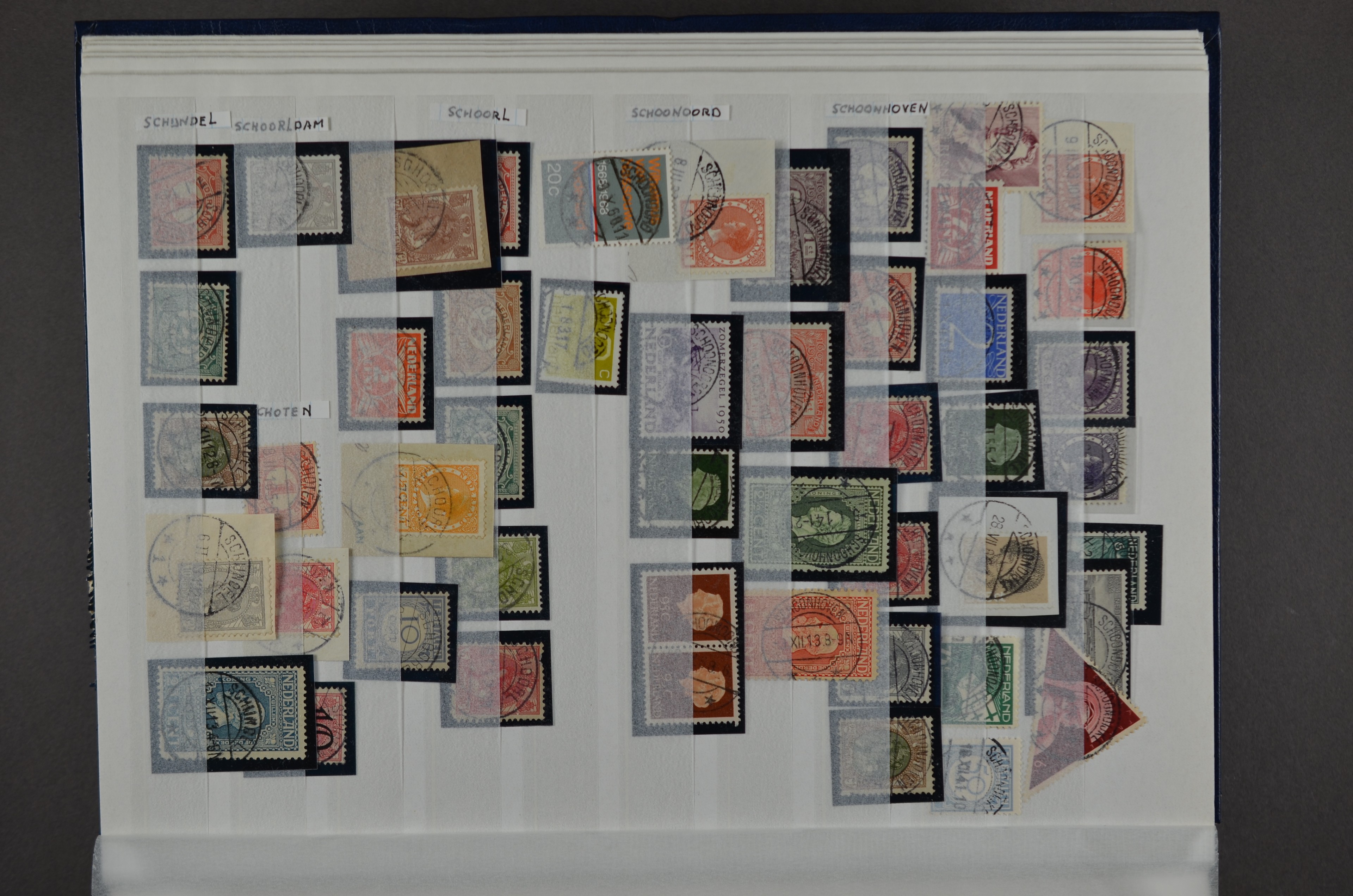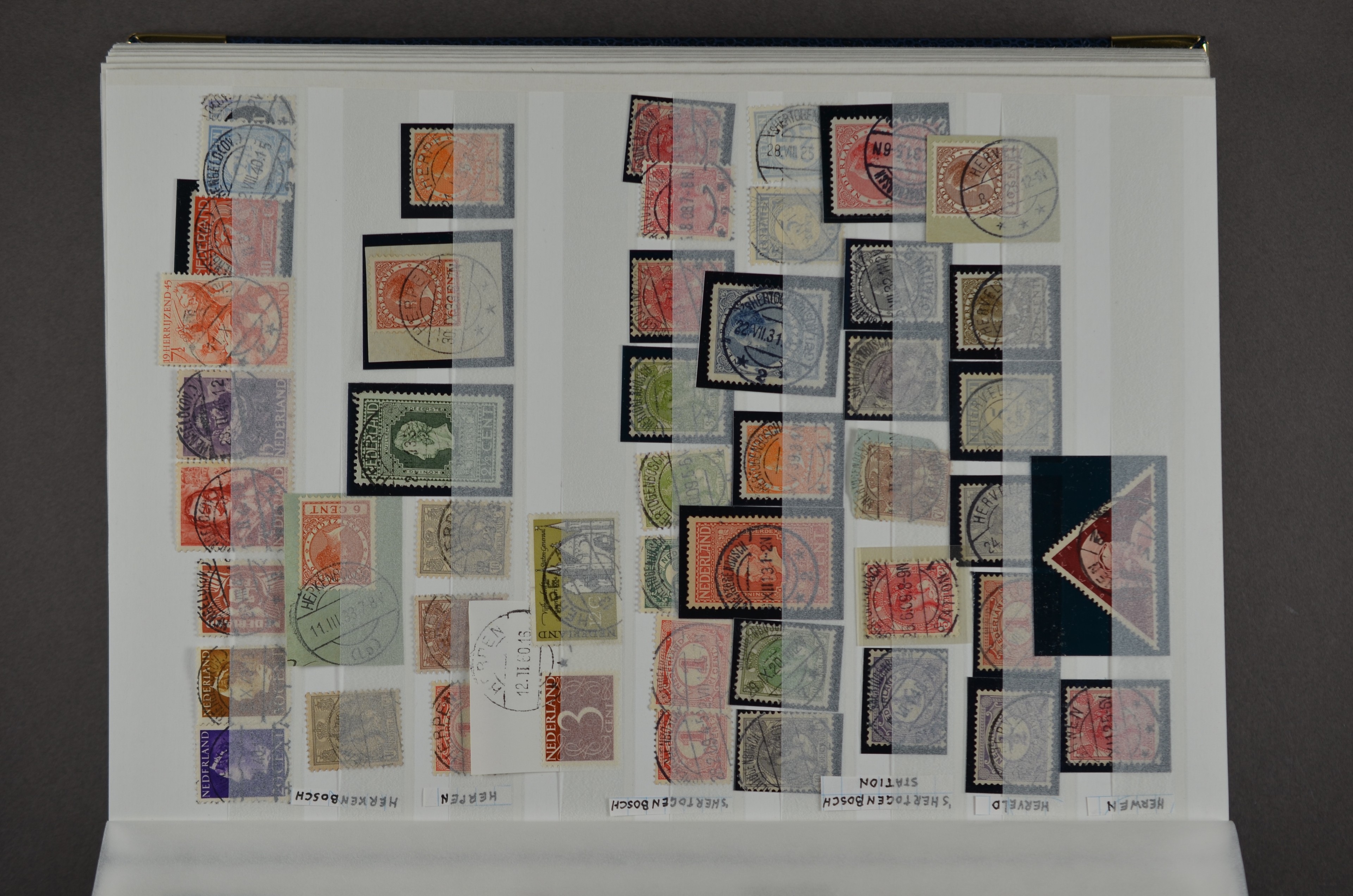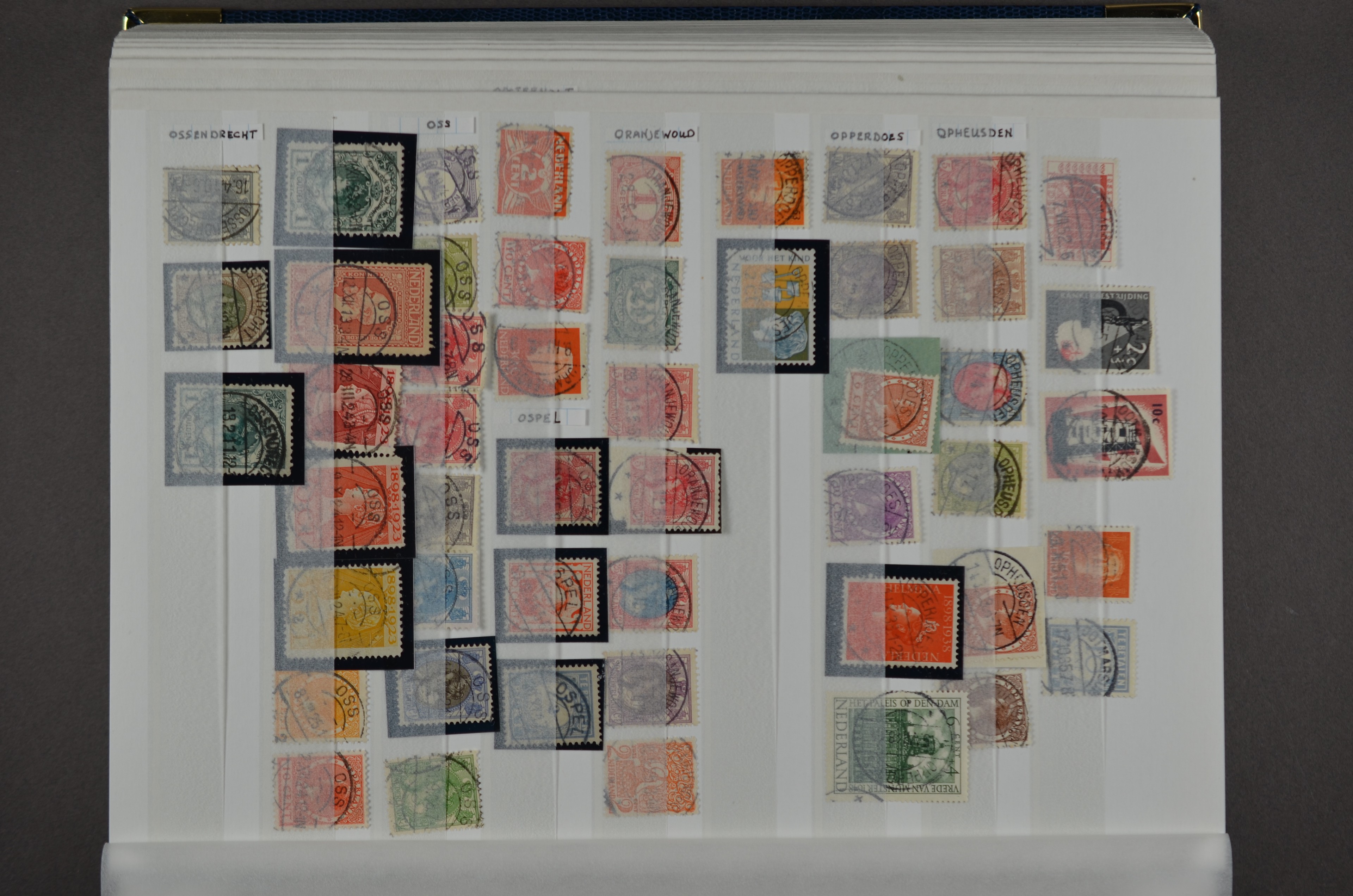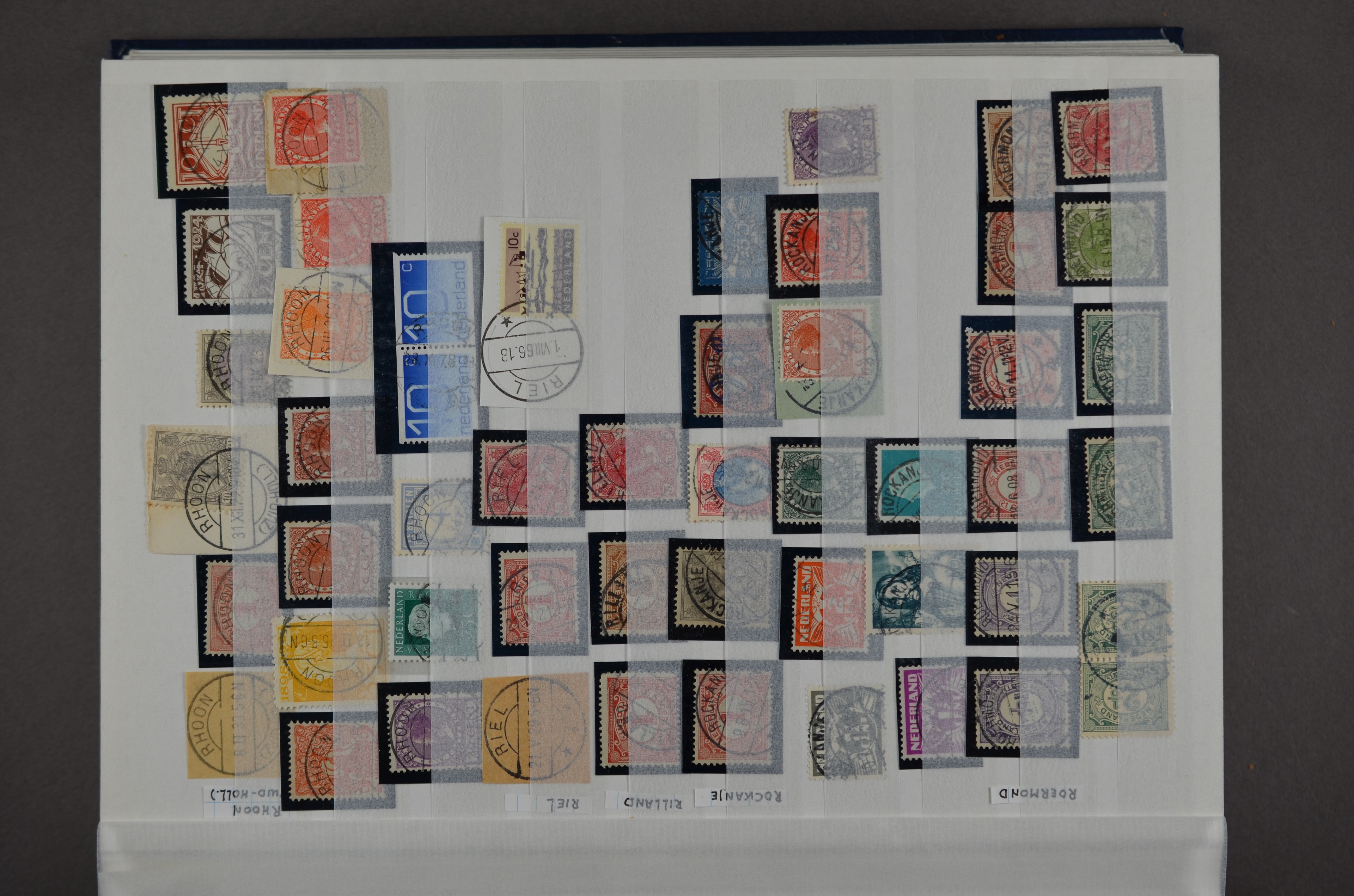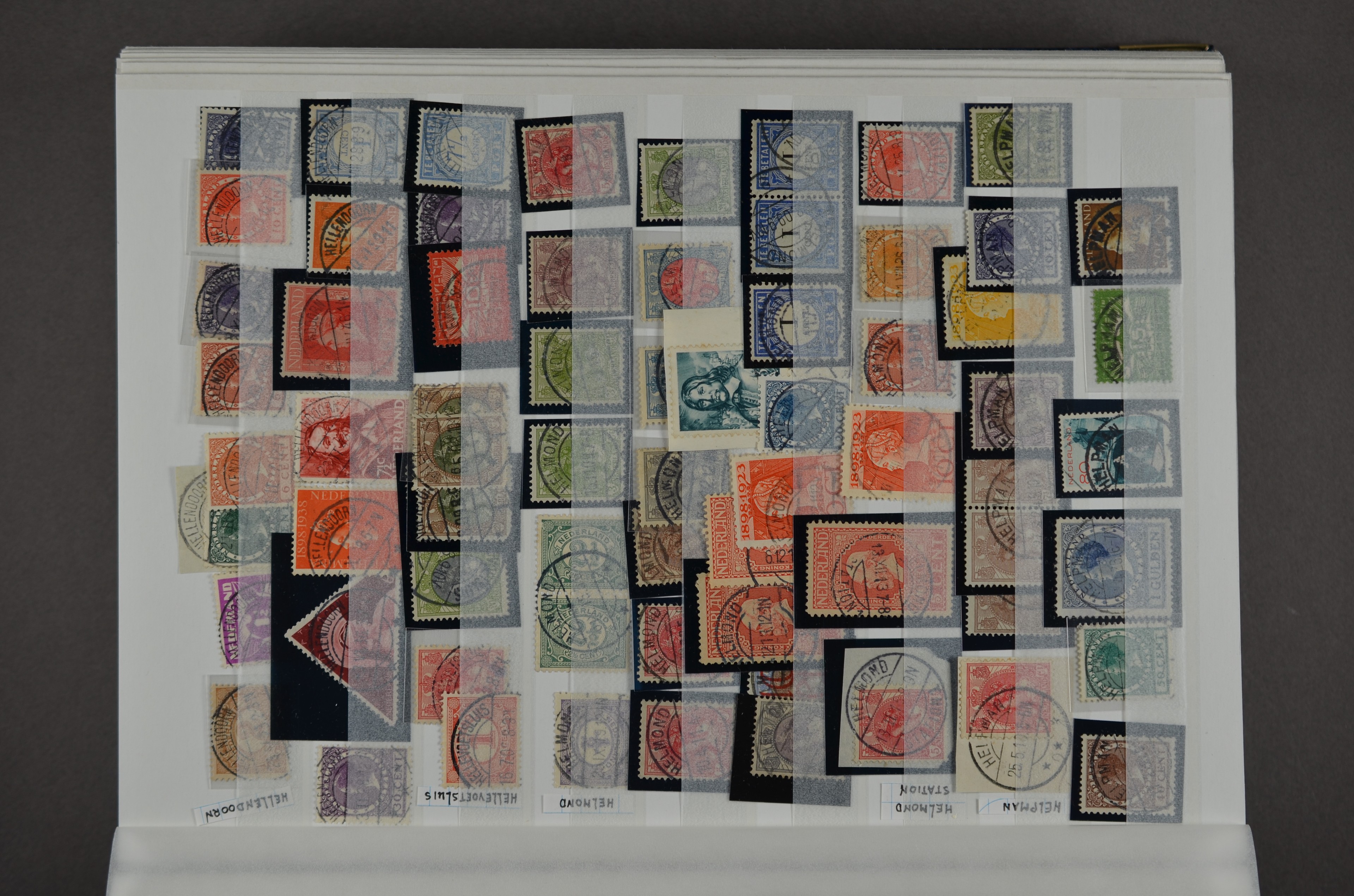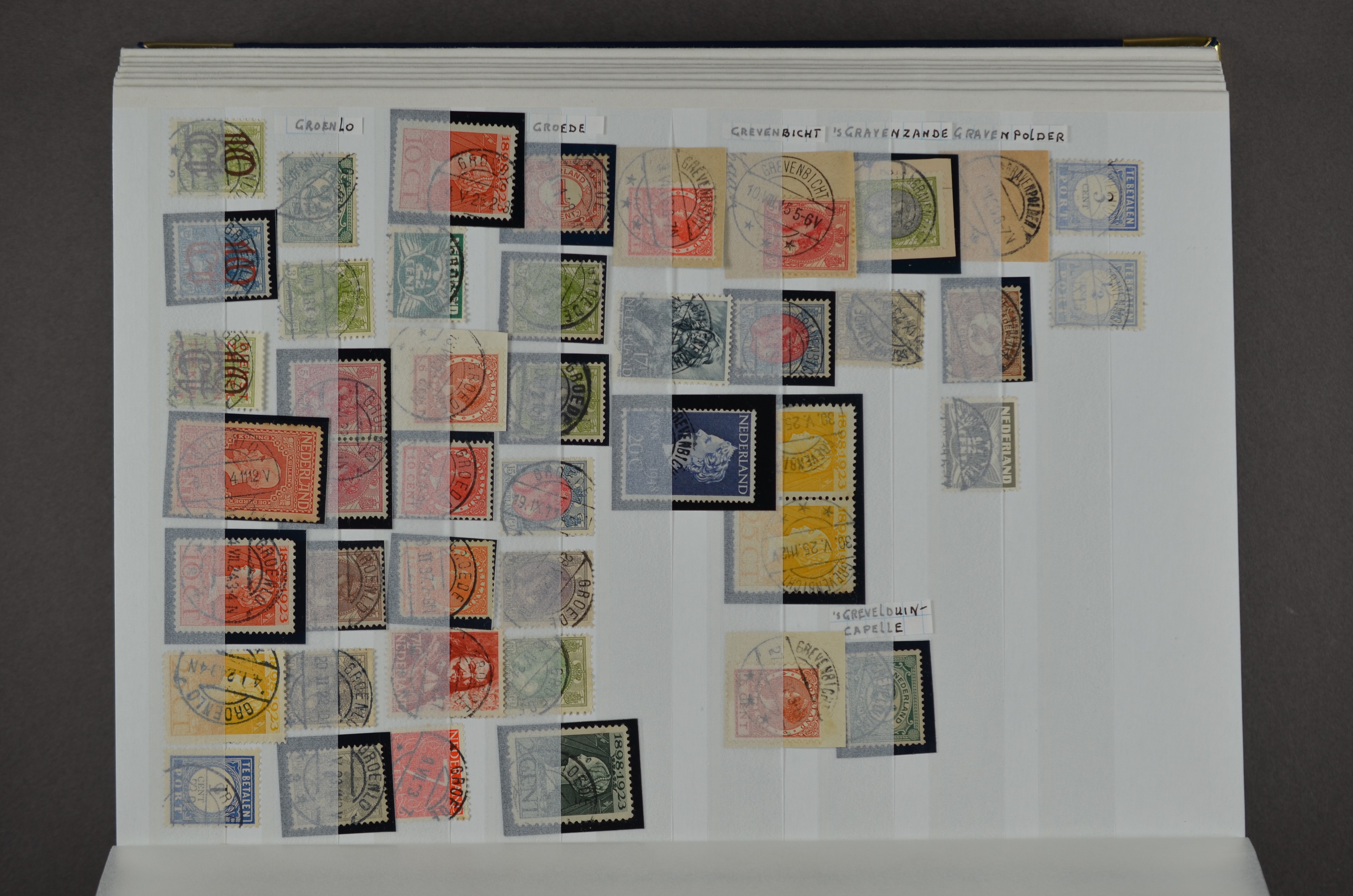 LANGEBALKSTEMPELS, uit Velling type 134/155 op vele, vele honderden losse zegels, merendeels volledige afstempelingen. Het lijken zogenaamd gewone, (semi-)moderne stempels maar in een dergelijke omvang, met zo veel kleine kantoren en in zulke uitzonderlijke kwaliteit nauwelijks meer bijeen te brengen. Voor de liefhebber, op alfabetische volgorde gesorteerd in 3 dikke insteekboeken vol verzamelplezier!