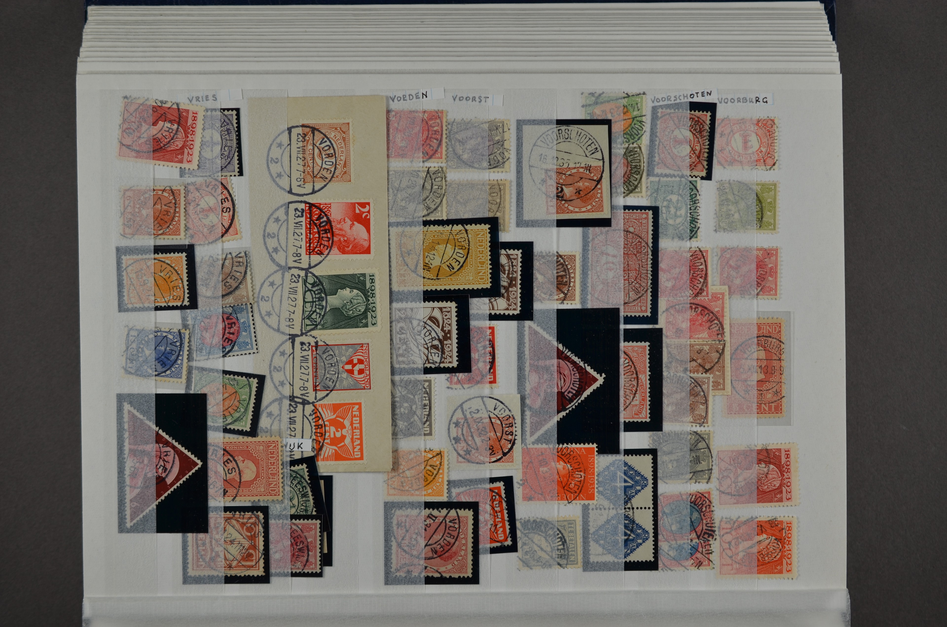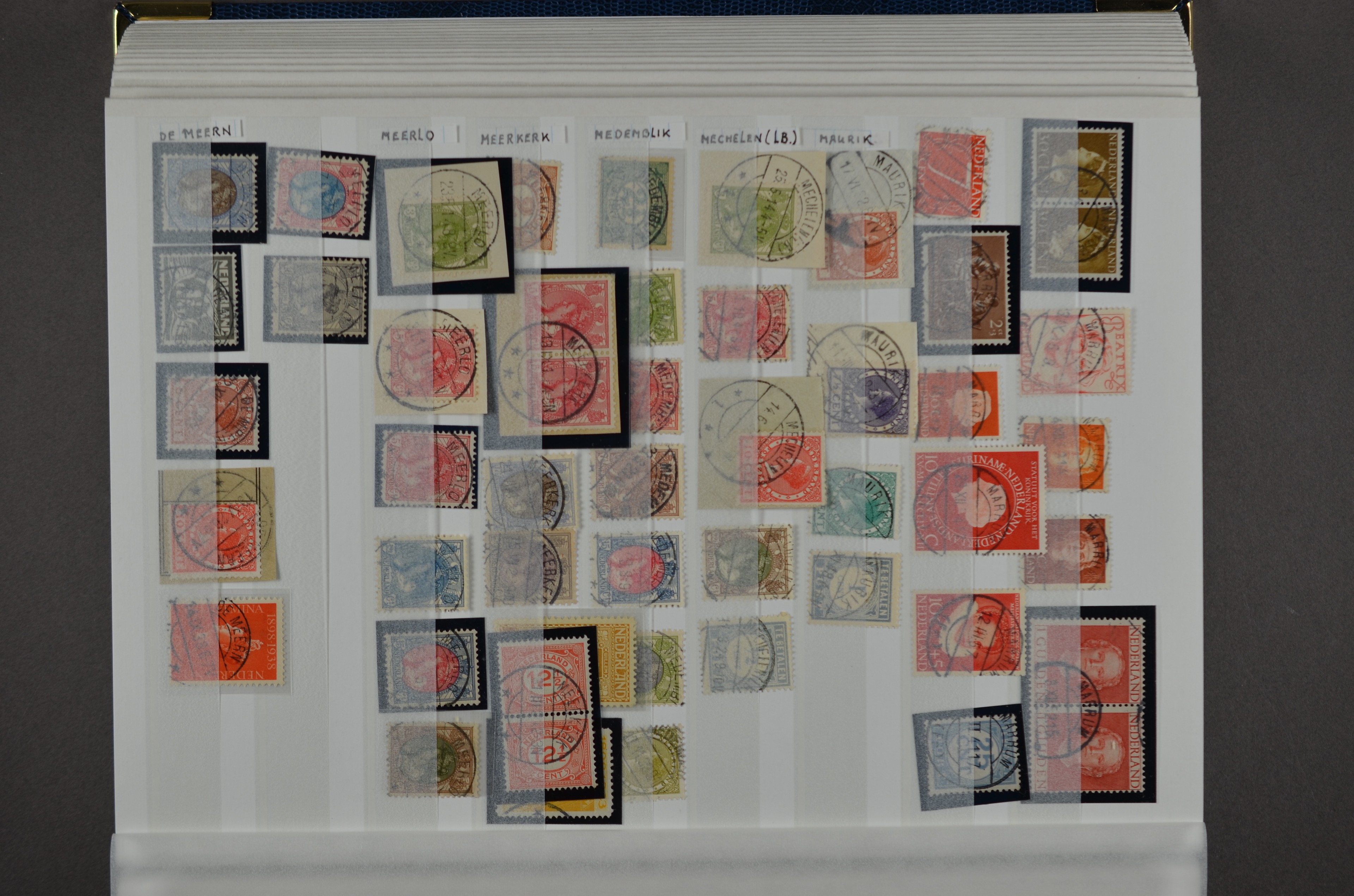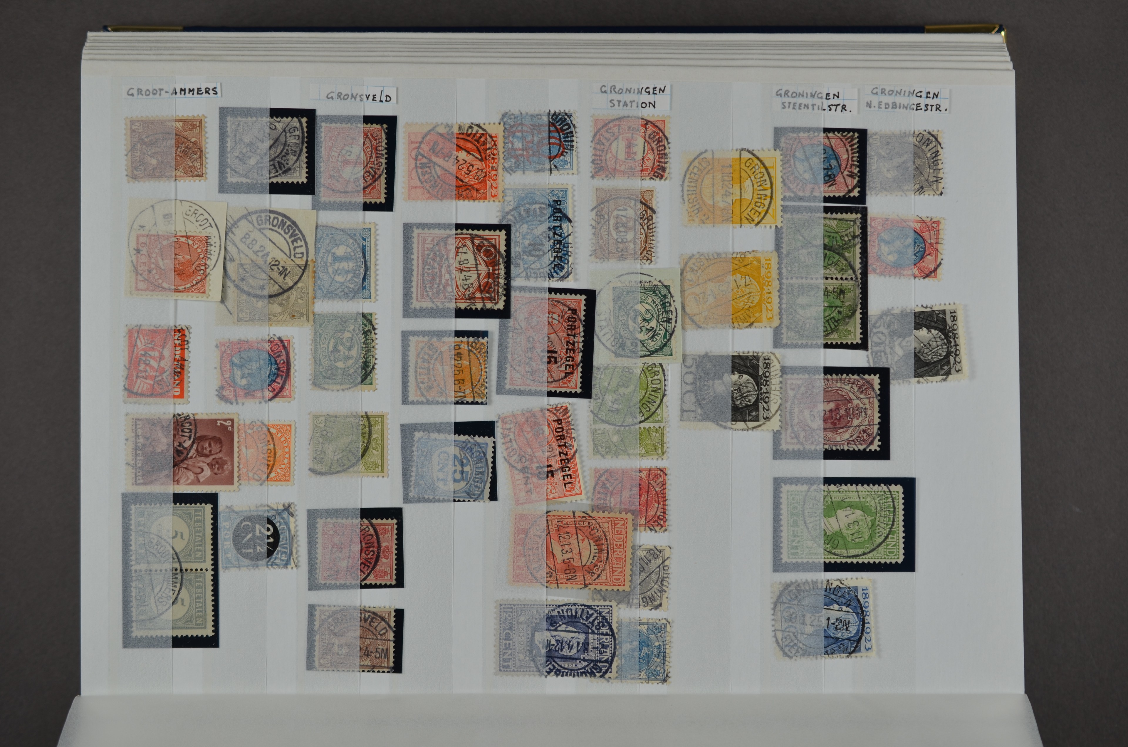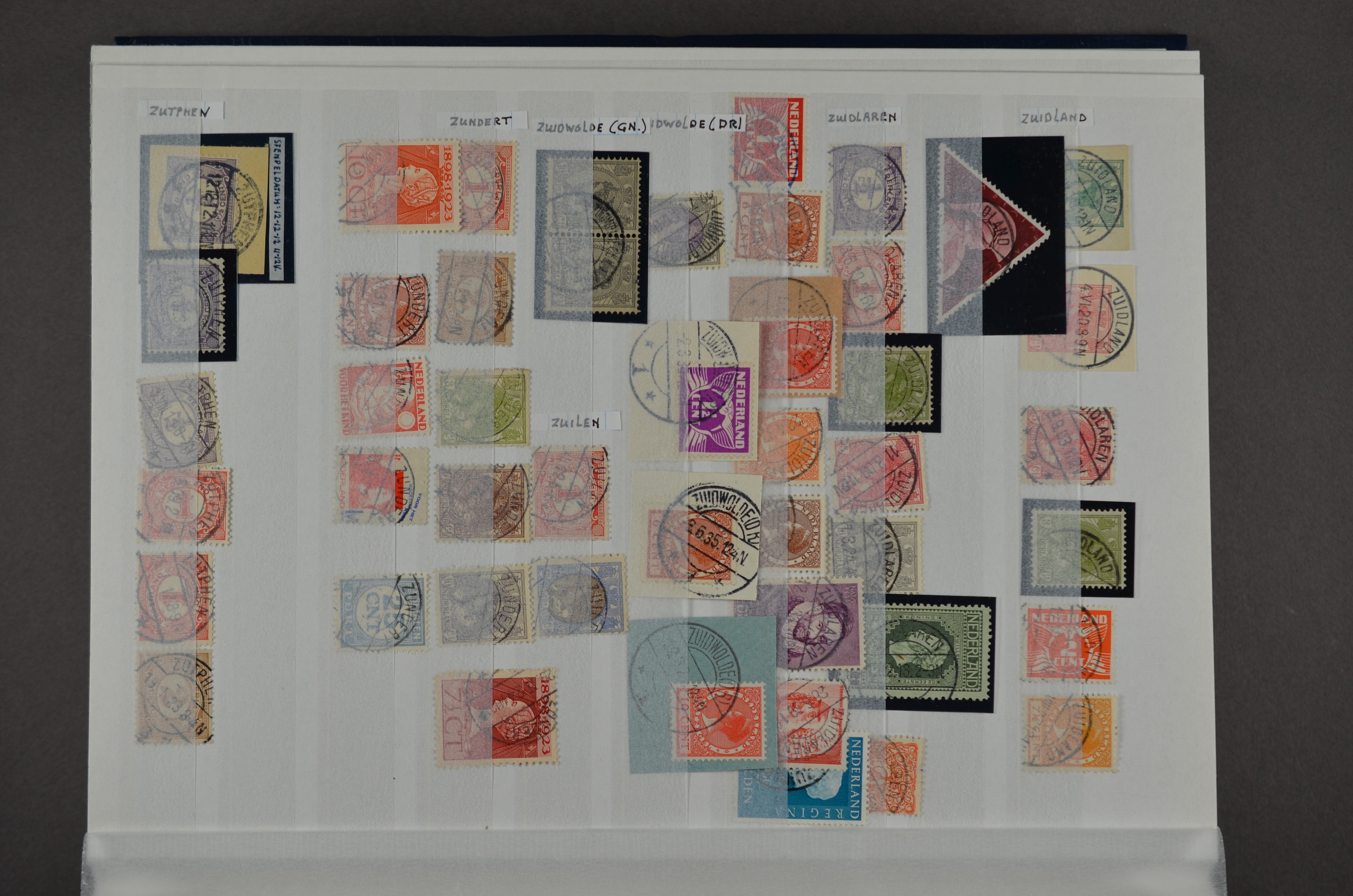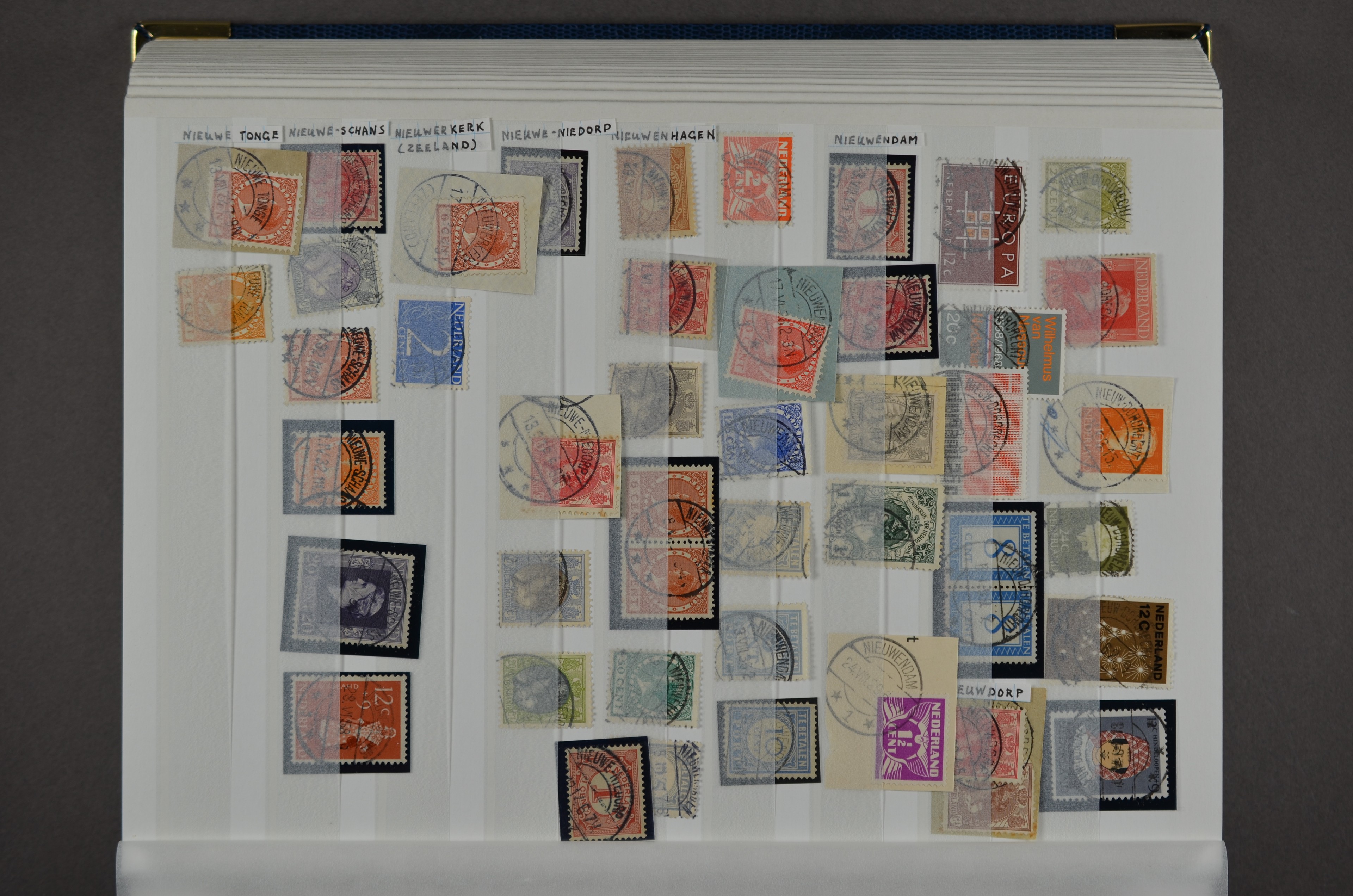LANGEBALKSTEMPELS, uit Velling type 134/155 op vele, vele honderden losse zegels, merendeels volledige afstempelingen. Het lijken zogenaamd gewone, (semi-)moderne stempels maar in een dergelijke omvang, met zo veel kleine kantoren en in zulke uitzonderlijke kwaliteit nauwelijks meer bijeen te brengen. Voor de liefhebber, op alfabetische volgorde gesorteerd in 3 dikke insteekboeken vol verzamelplezier!