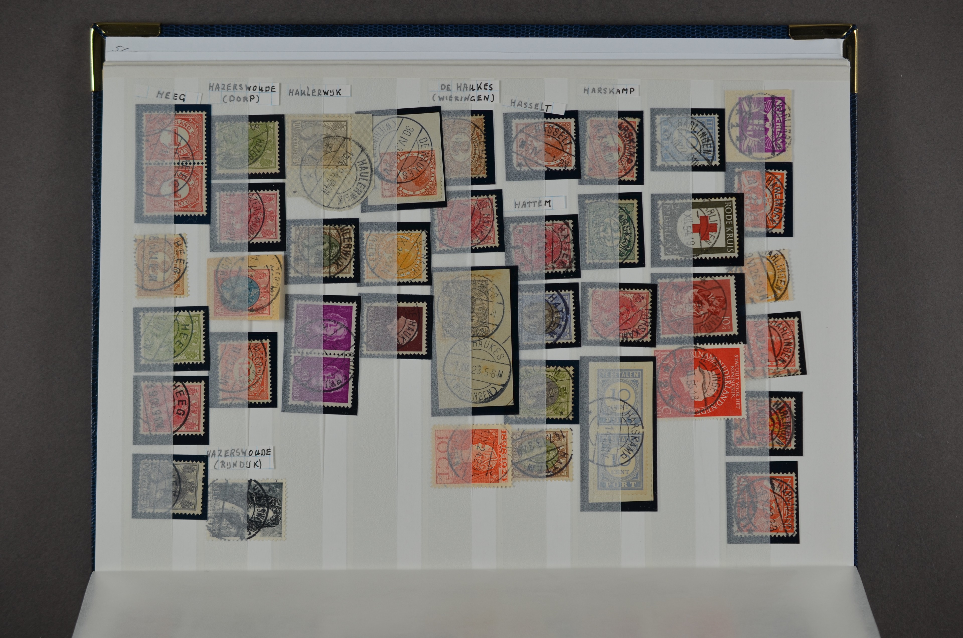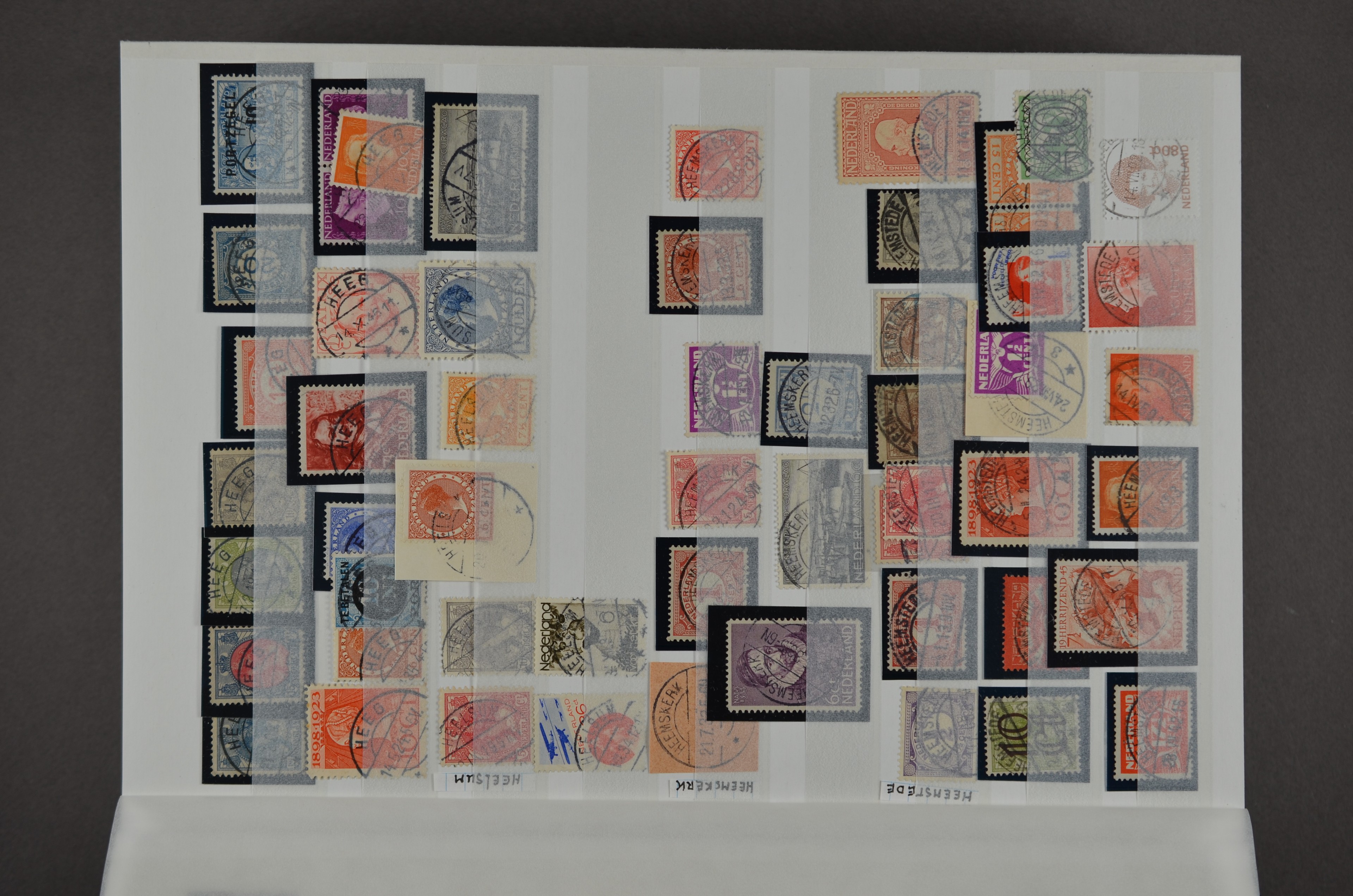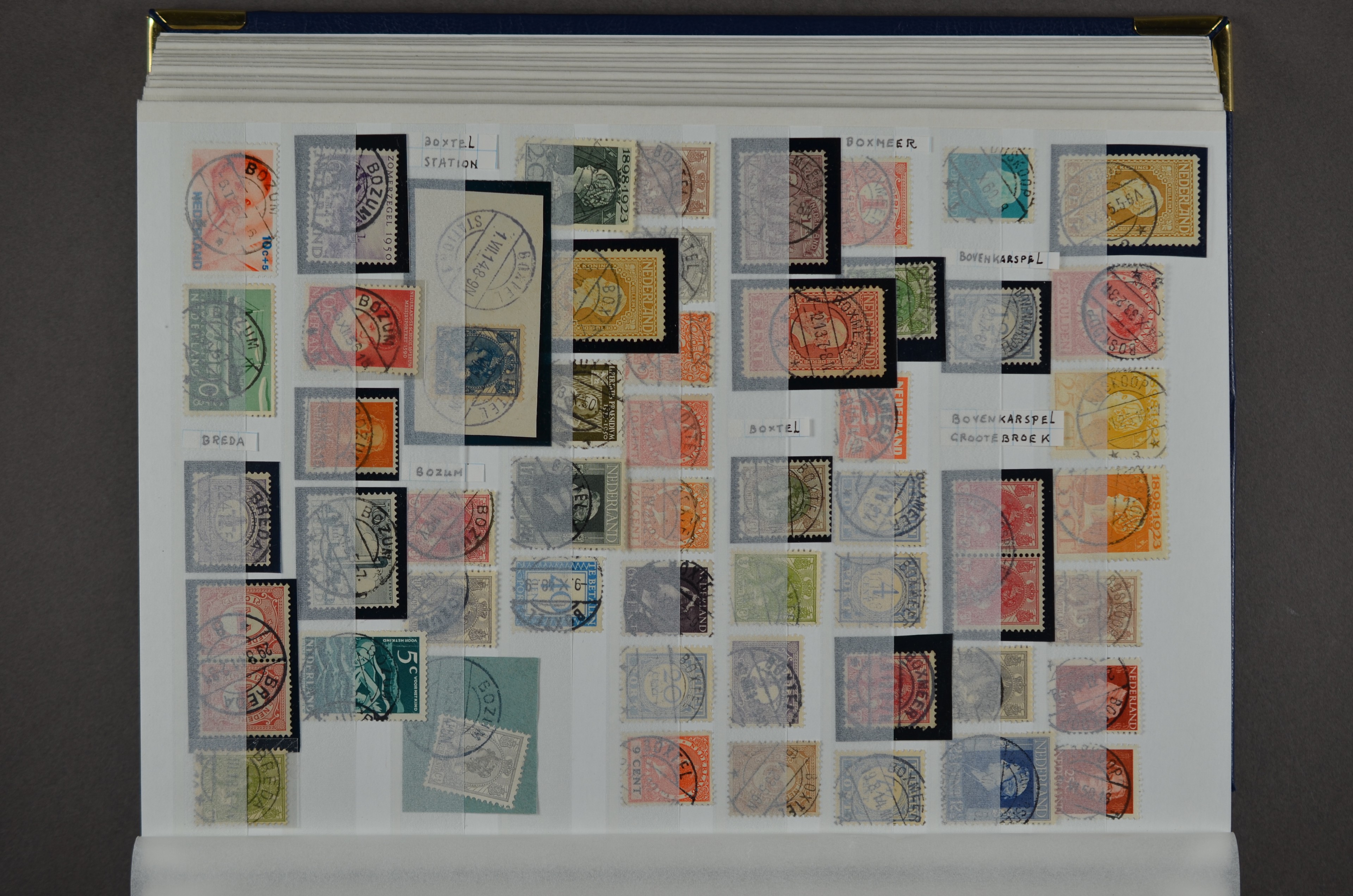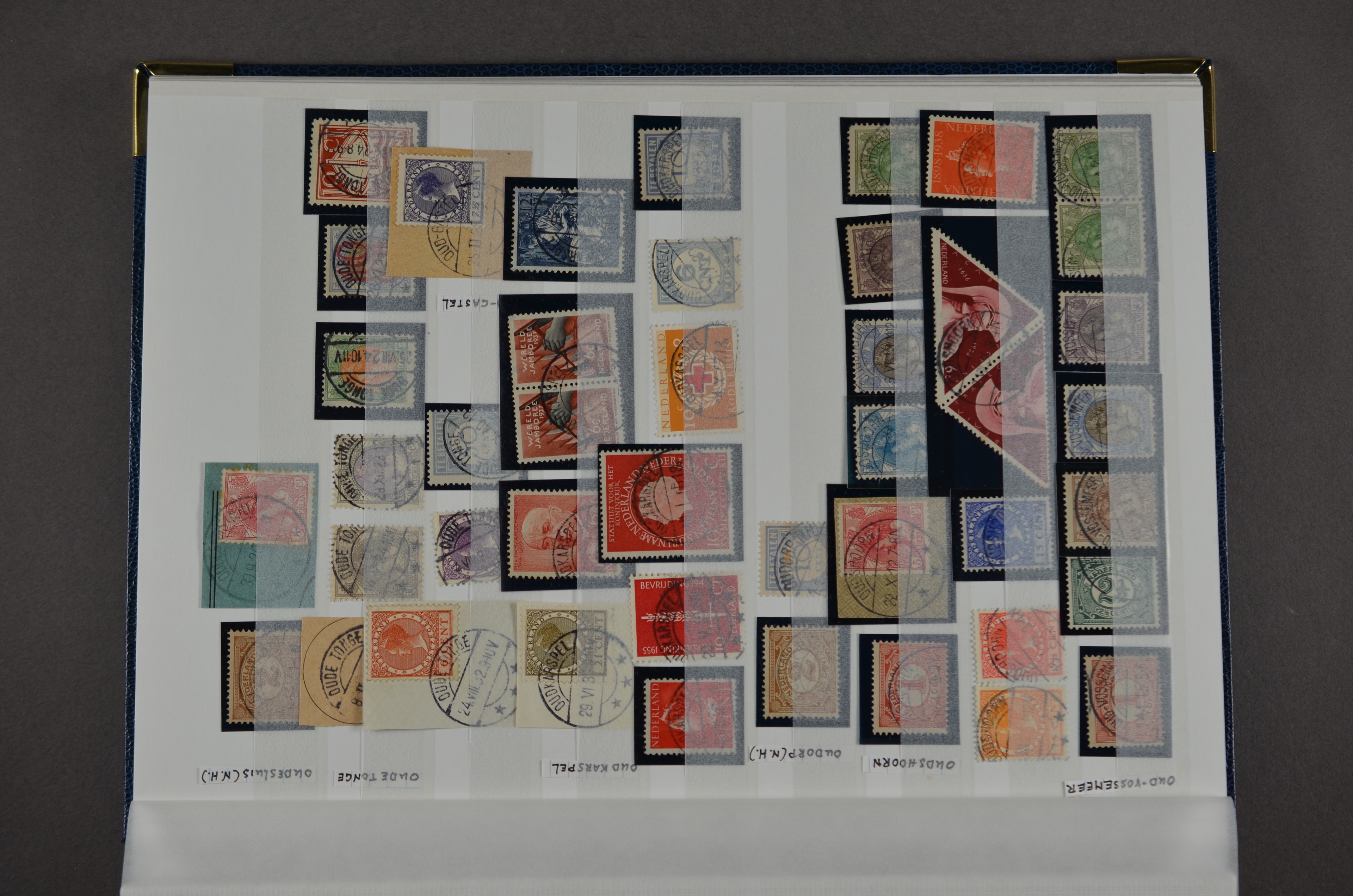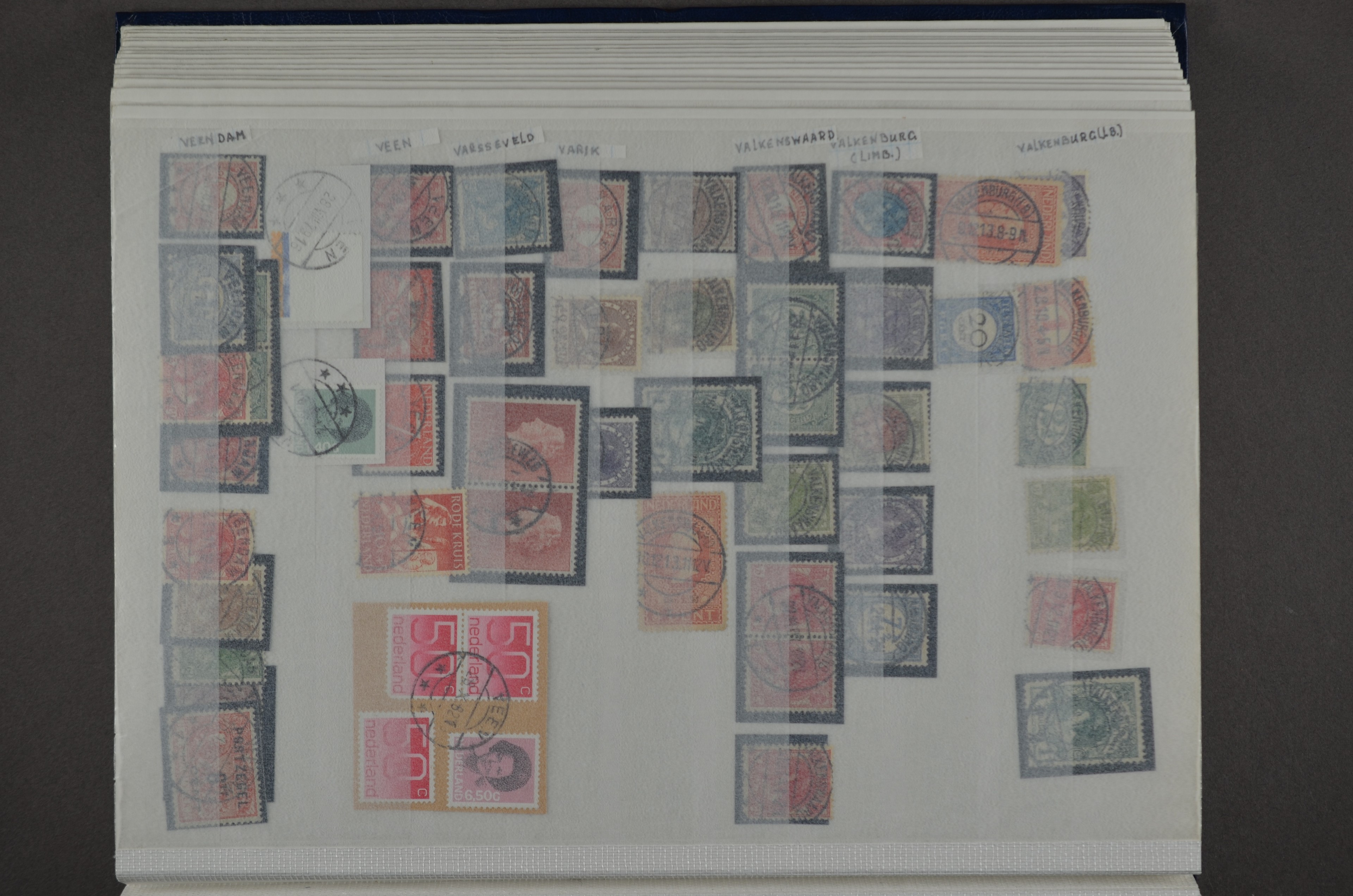 LANGEBALKSTEMPELS, uit Velling type 134/155 op vele, vele honderden losse zegels, merendeels volledige afstempelingen. Het lijken zogenaamd gewone, (semi-)moderne stempels maar in een dergelijke omvang, met zo veel kleine kantoren en in zulke uitzonderlijke kwaliteit nauwelijks meer bijeen te brengen. Voor de liefhebber, op alfabetische volgorde gesorteerd in 3 dikke insteekboeken vol verzamelplezier!