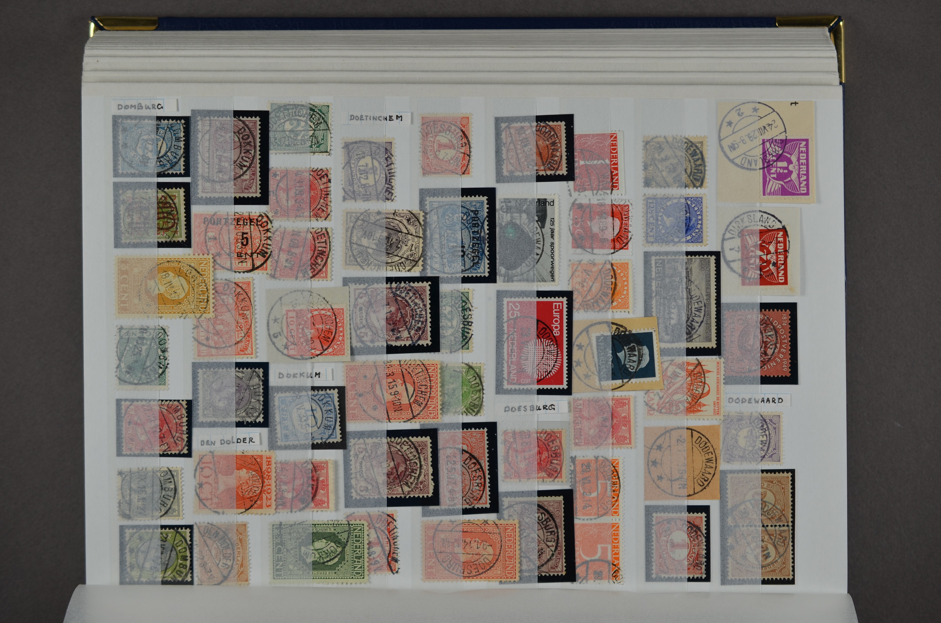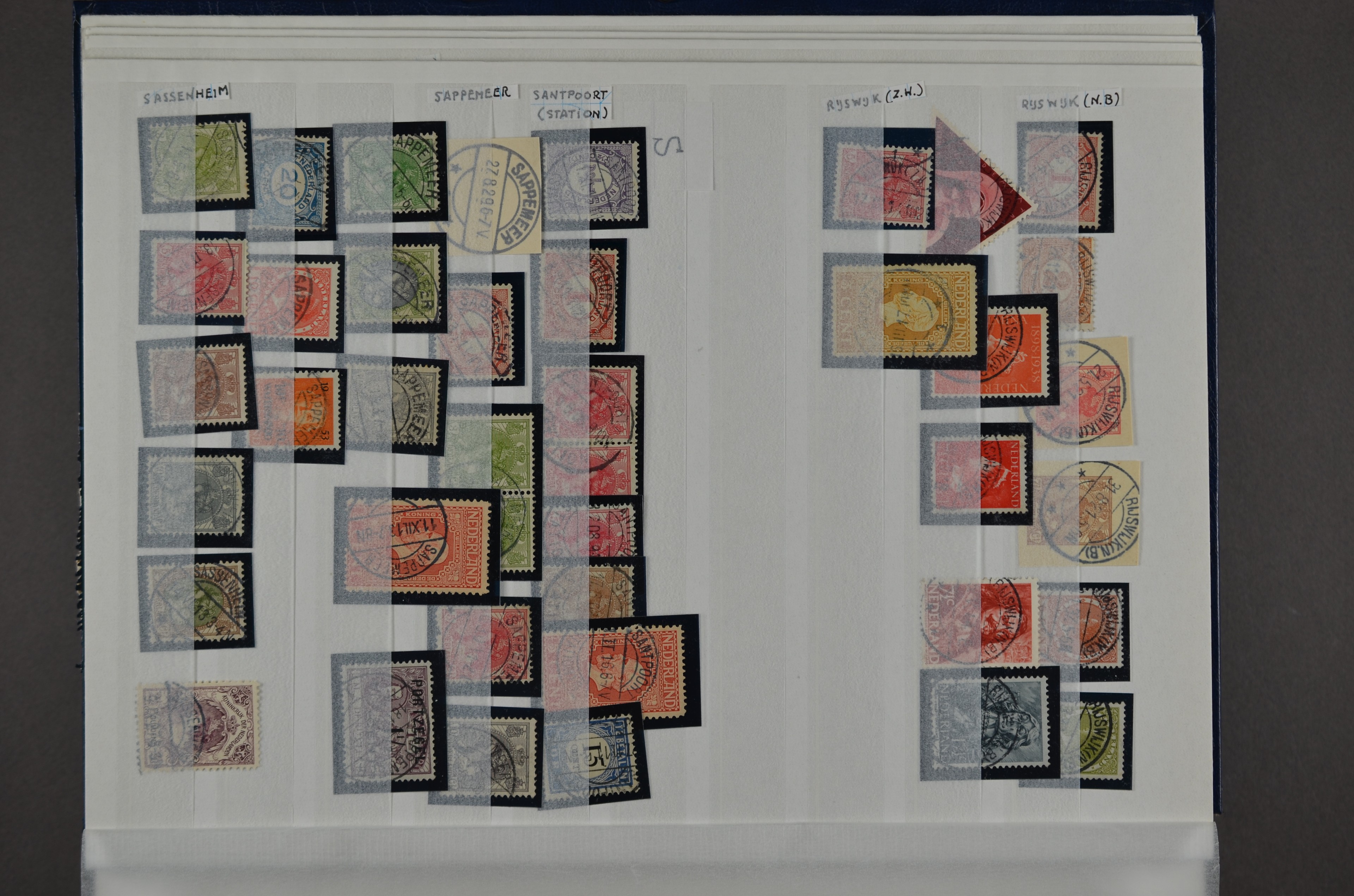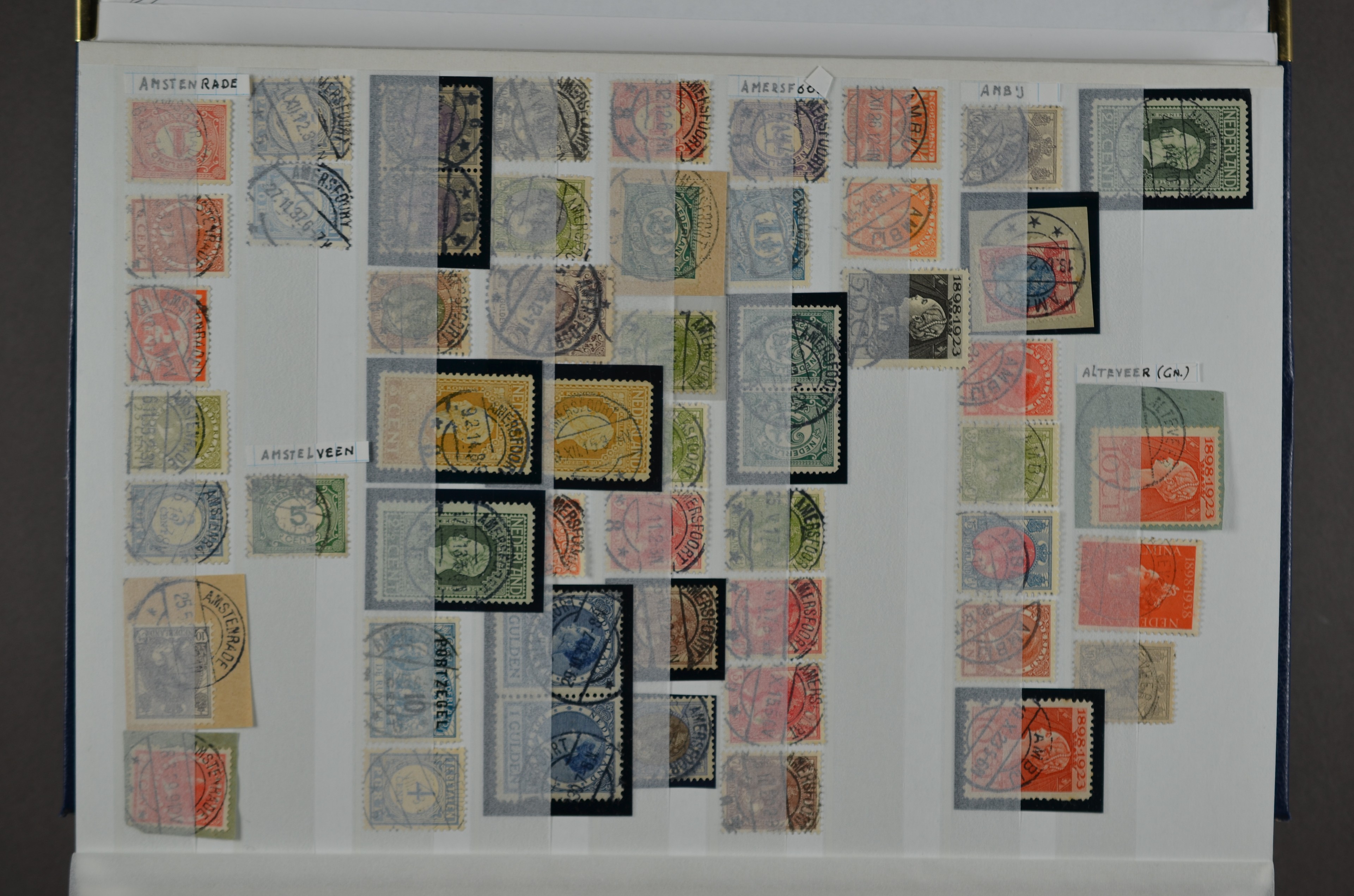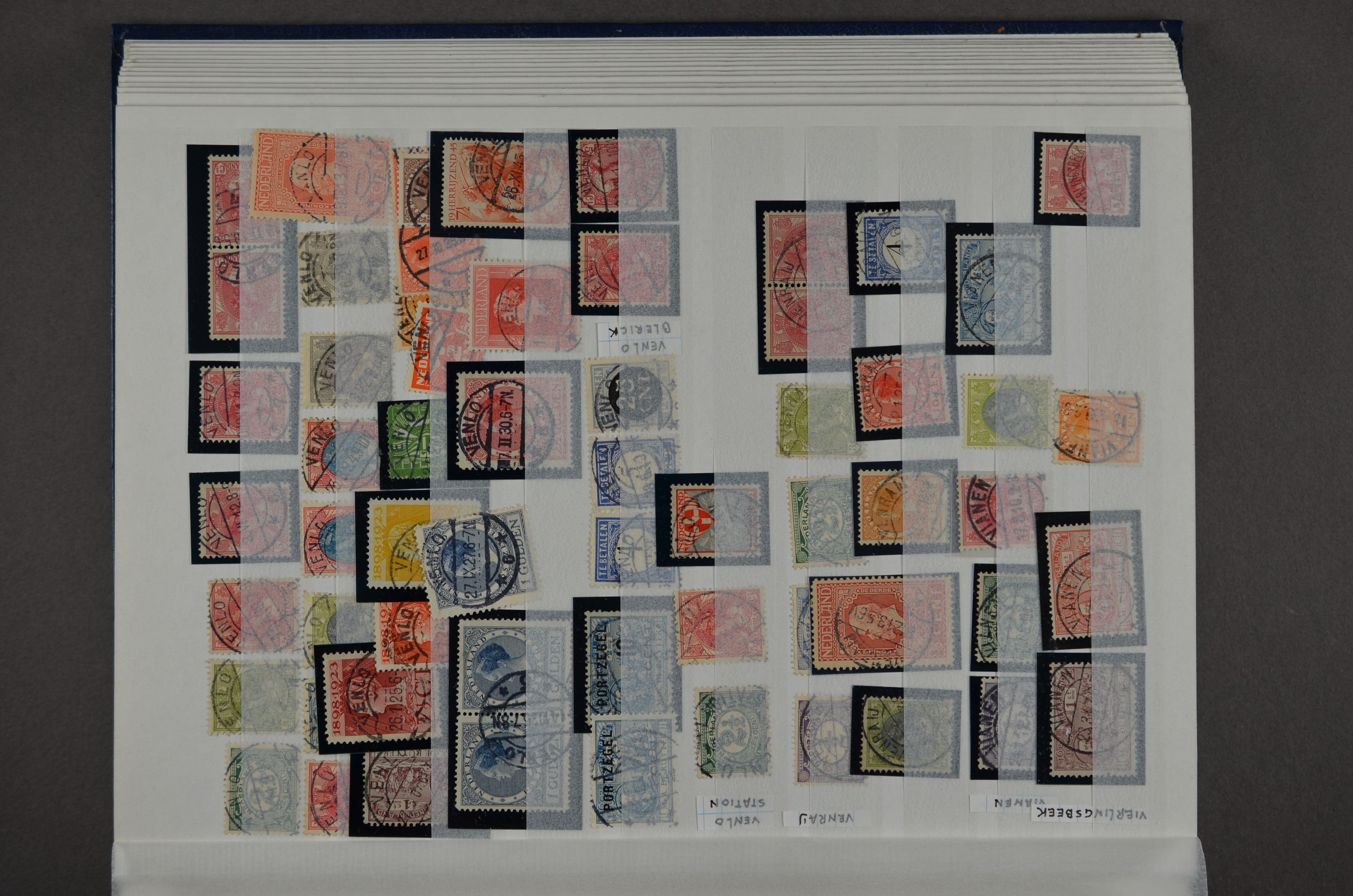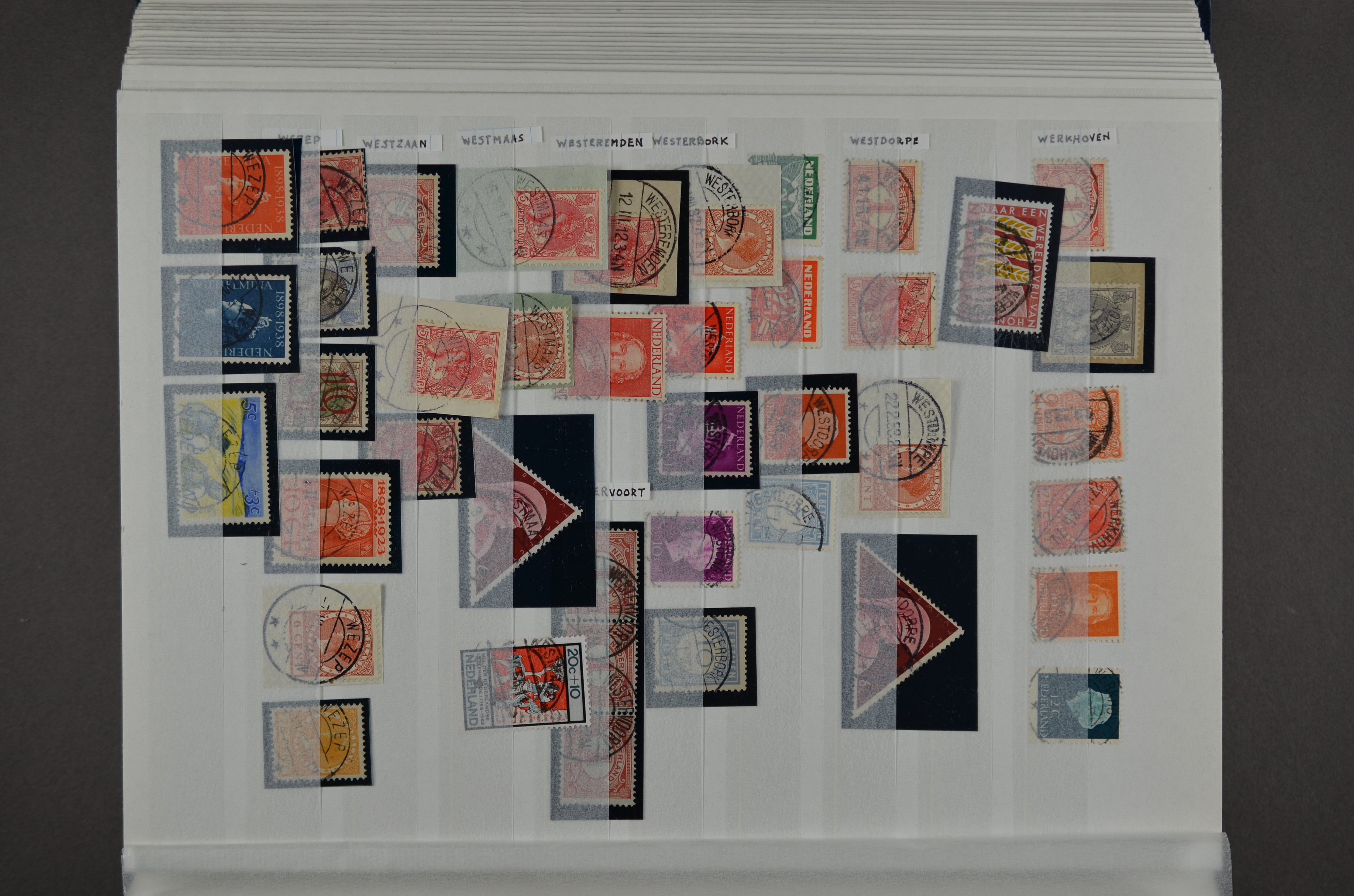 LANGEBALKSTEMPELS, uit Velling type 134/155 op vele, vele honderden losse zegels, merendeels volledige afstempelingen. Het lijken zogenaamd gewone, (semi-)moderne stempels maar in een dergelijke omvang, met zo veel kleine kantoren en in zulke uitzonderlijke kwaliteit nauwelijks meer bijeen te brengen. Voor de liefhebber, op alfabetische volgorde gesorteerd in 3 dikke insteekboeken vol verzamelplezier!